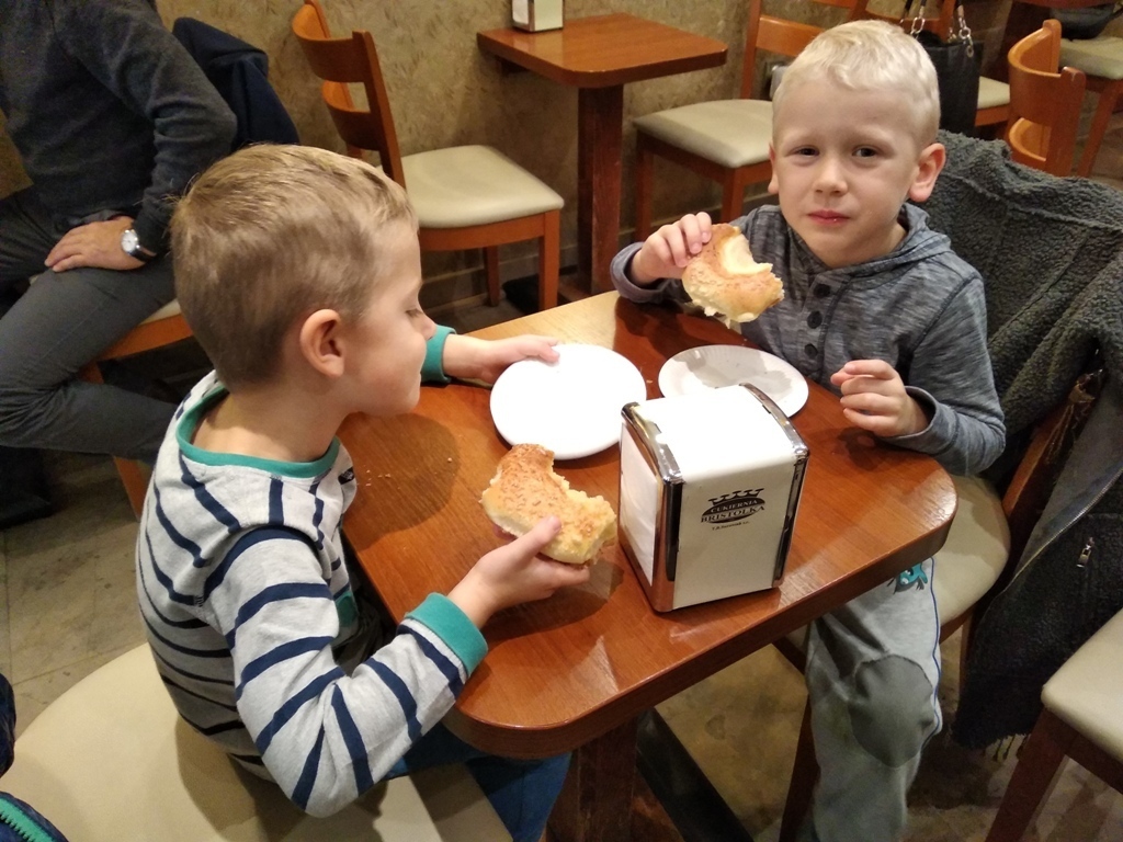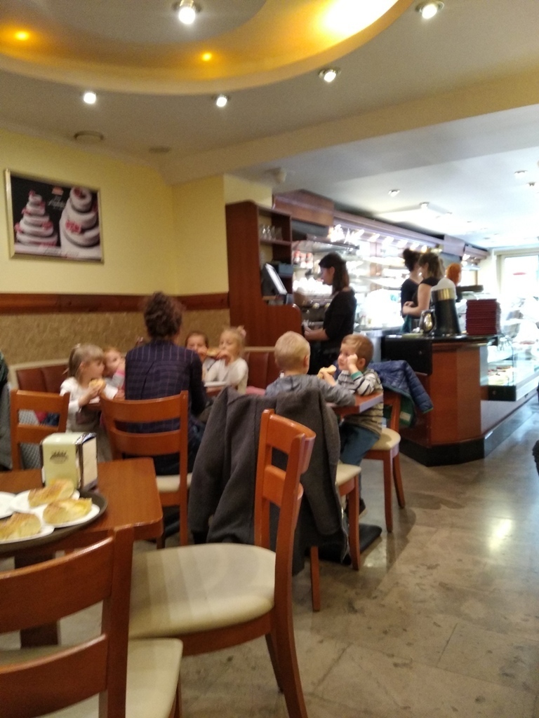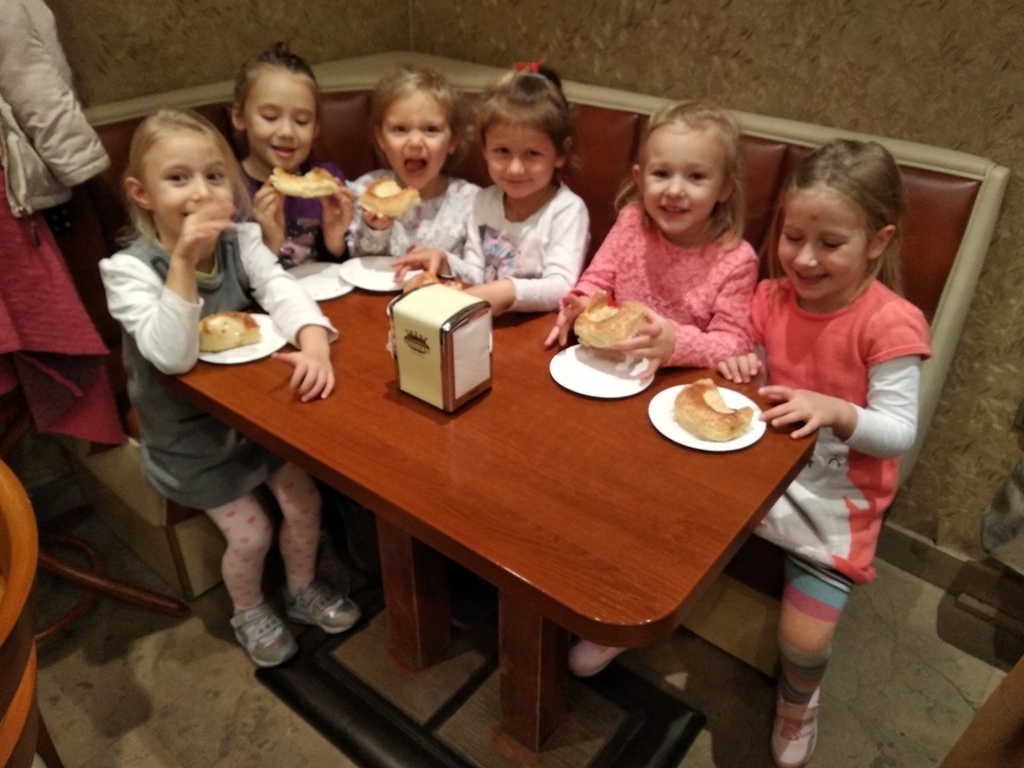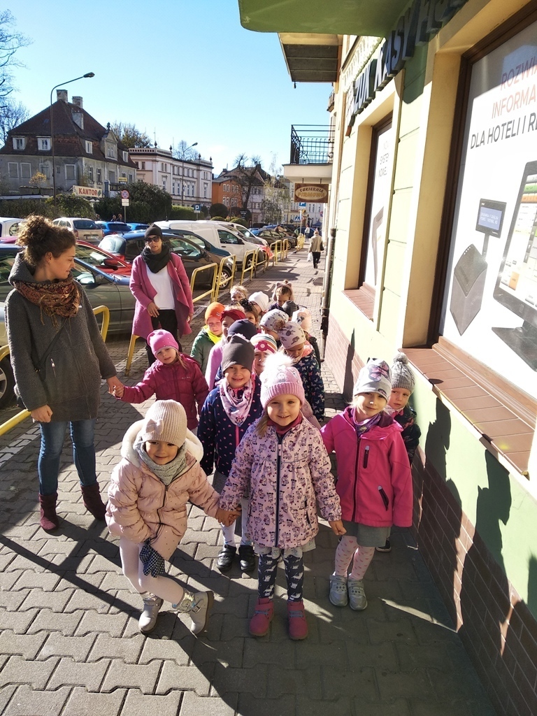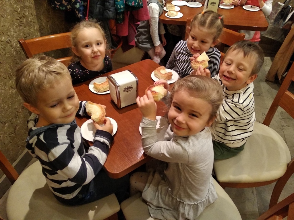 Dzisiejszego dnia wybraliśmy się całą grupą na przepyszne ciastko do kawiarni, która znajduje się w sercu naszego miasta. W kawiarni mieliśmy okazję spróbować pysznych wypieków, a panie które tam pracują bardzo miło i przyjaźnie nas przyjęły. Tego dnia była piękna pogoda dlatego mogliśmy podziwiać uroki tegorocznej pięknej jesieni. Rozmawialiśmy i przypominaliśmy sobie o tym jakie są jej oznaki. Korzystając z tak pięknej pogody przed powrotem do przedszkola bawiliśmy się na placu zabaw.