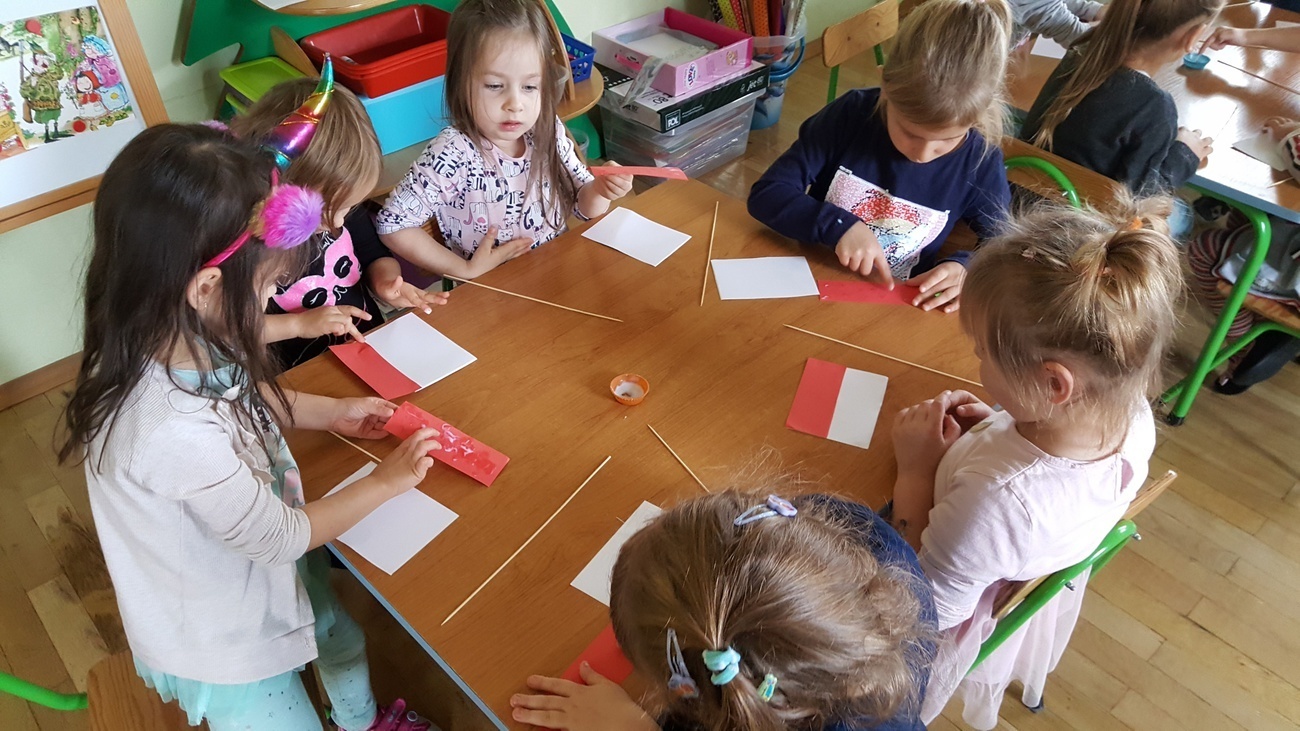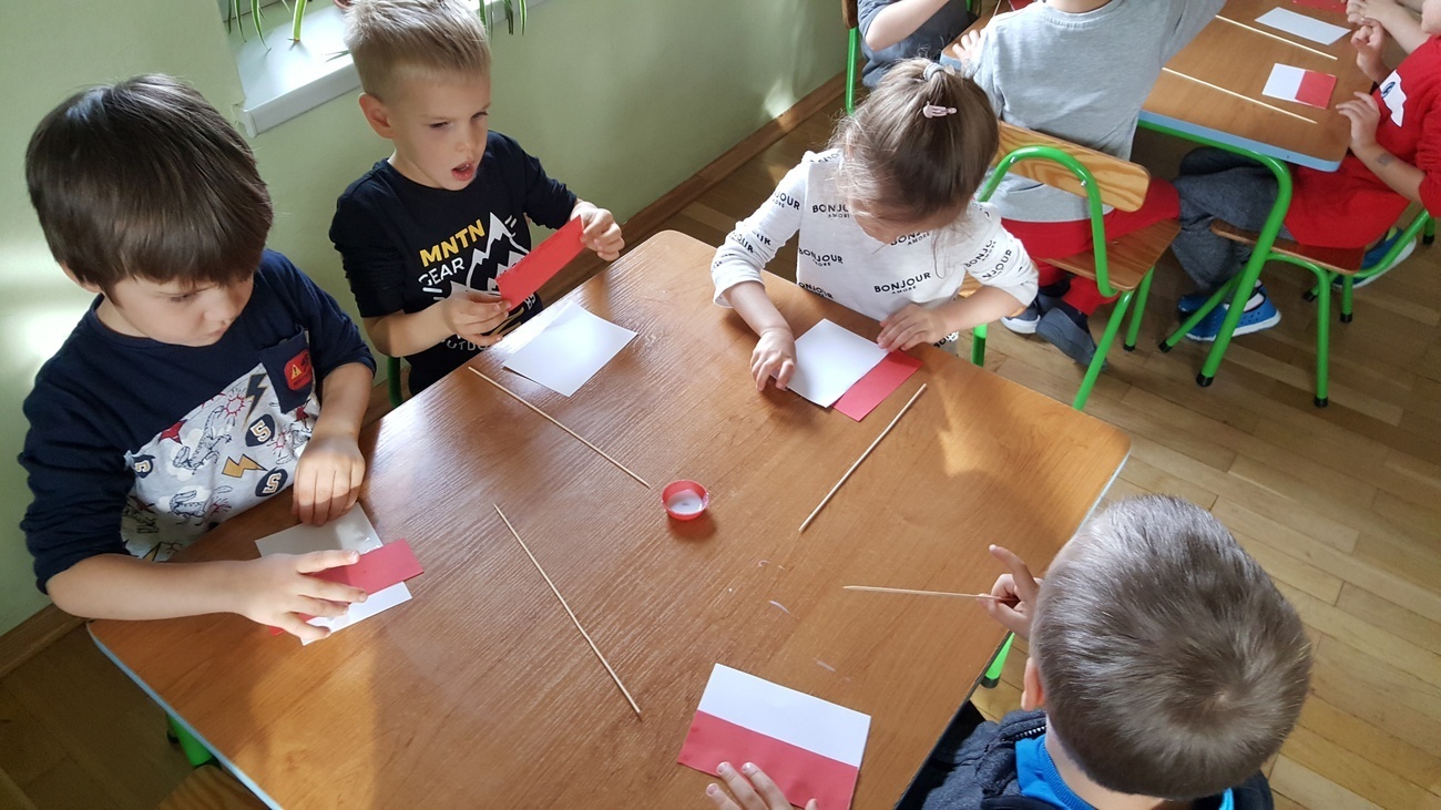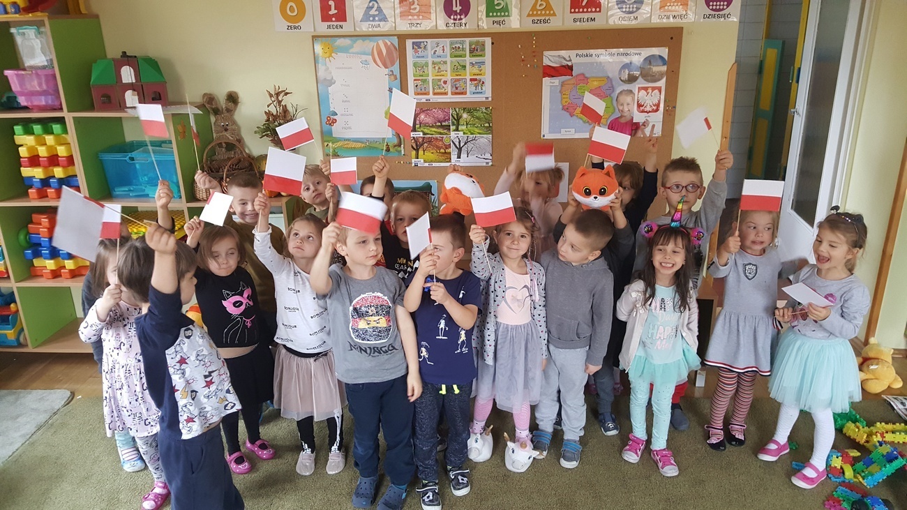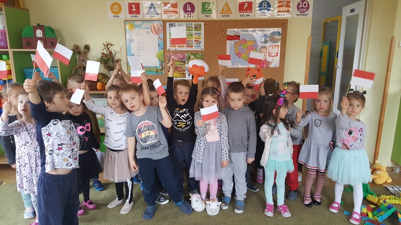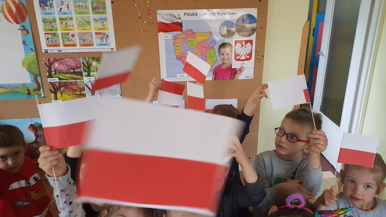 W ramach obchodów stulecia odzyskania niepodległości przez Polskę odśpiewaliśmy wspólnie hymn narodowy, dowiedzieliśmy się co oznacza dla naszego kraju "niepodległość" i dlaczego świętujemy ten dzień. Na koniec wykonaliśmy własnoręcznie biało-czerwone chorągiewki, którymi udekorowaliśmy salę. Dzięki temu wiemy, co oznaczają nasze barwy flagowe.