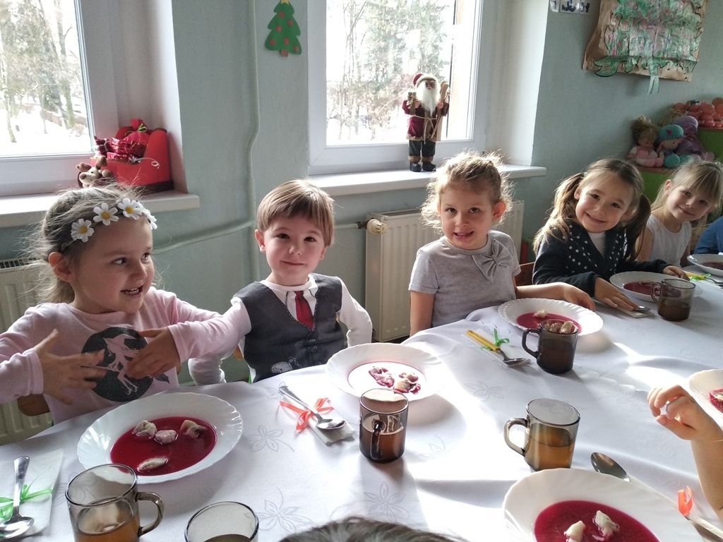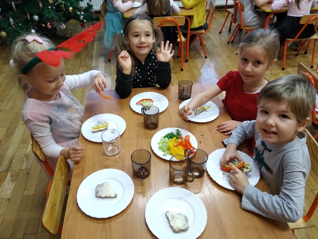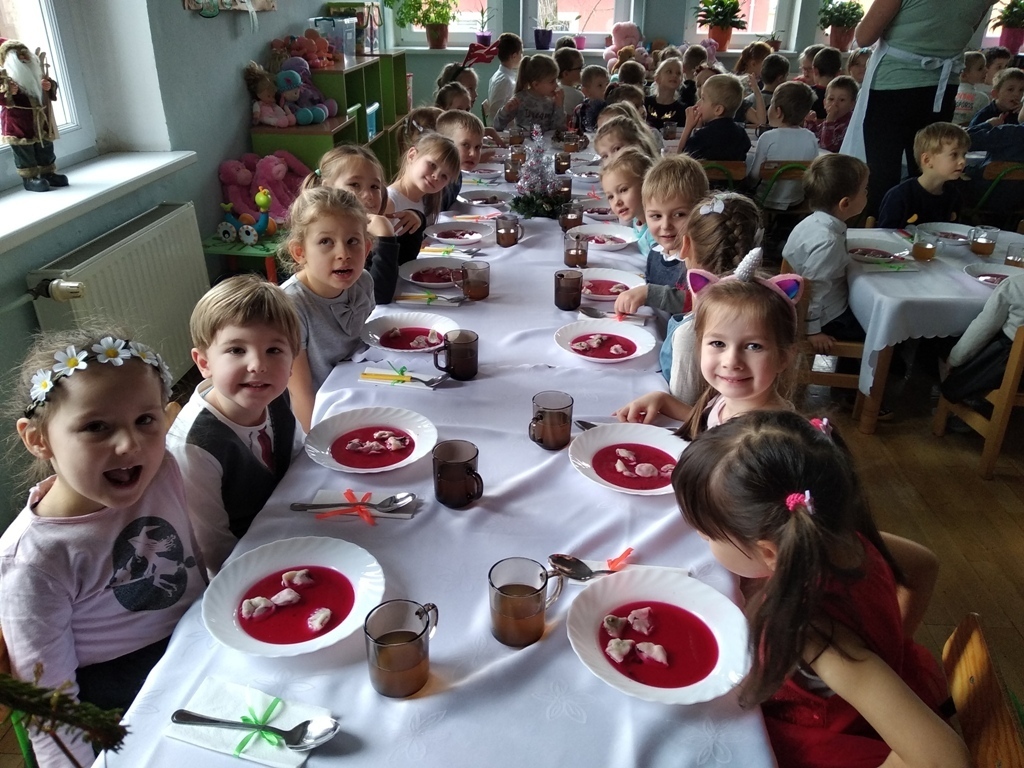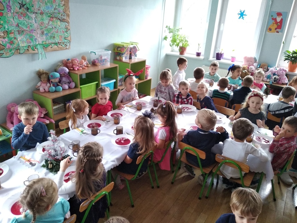 Dzisiejszego dnia odbyła się nasza wspólna przedszkolna wigilia. Na początku mieliśmy możliwość podziwiać piękne jasełka w wykonaniu starszaków. Następnie z kolędą na ustach wyruszyliśmy na wspólne spotkanie świąteczne. Pani Dyrektor złożyła nam piękne życzenia, po czym wspólnie mogliśmy życzyć sobie wesołych świąt. Na stole czekał już na nas przepyszny barszcz z uszkami i ryba po grecku. Po obiadku mogliśmy skosztować własnoręcznie wykonanych pierniczków. Poprzez dzisiejszy dzień coraz bardziej czujemy atmosferę świąt.