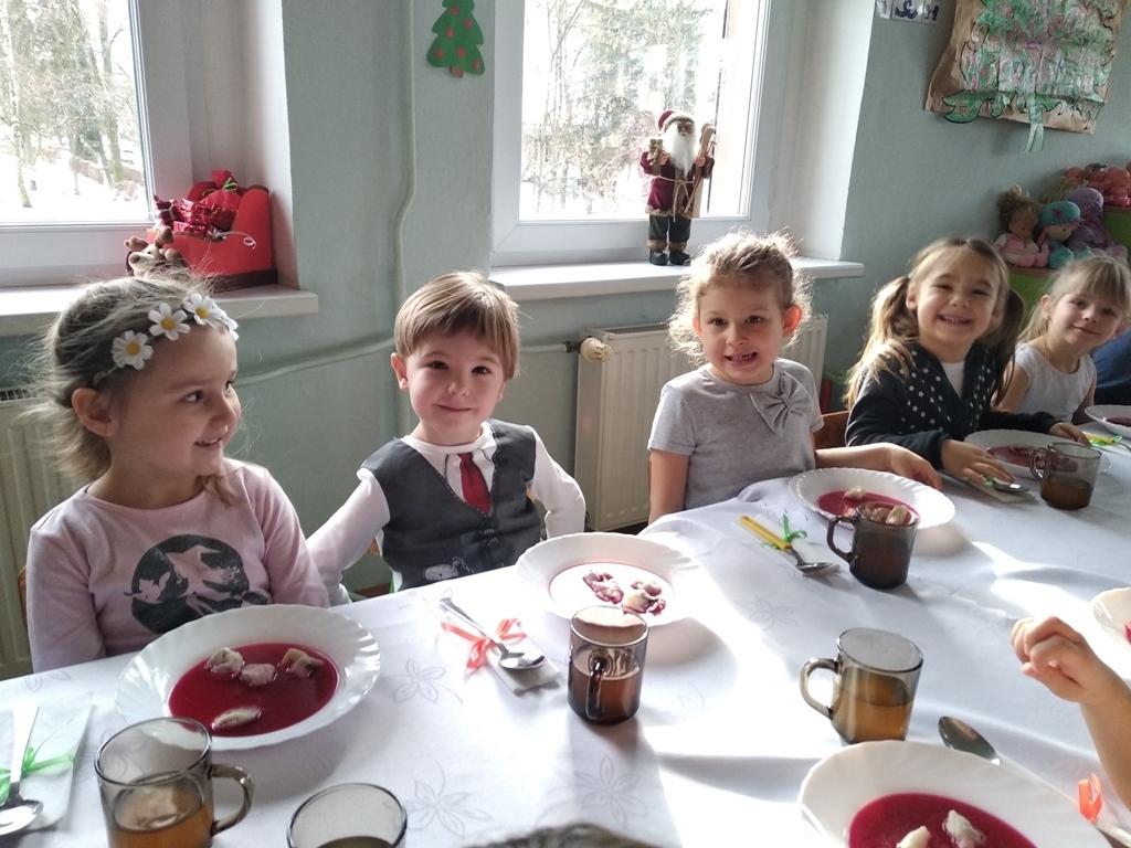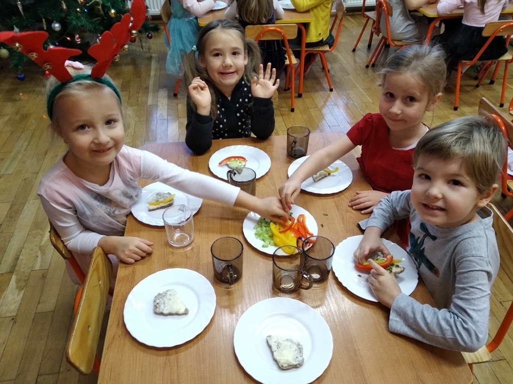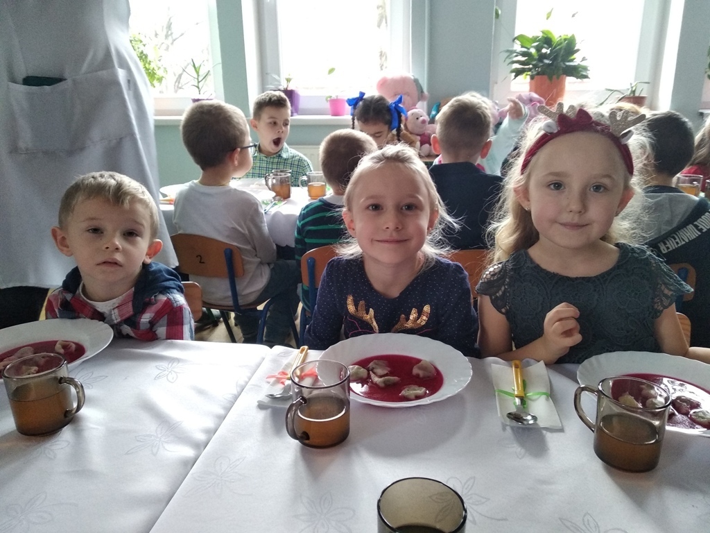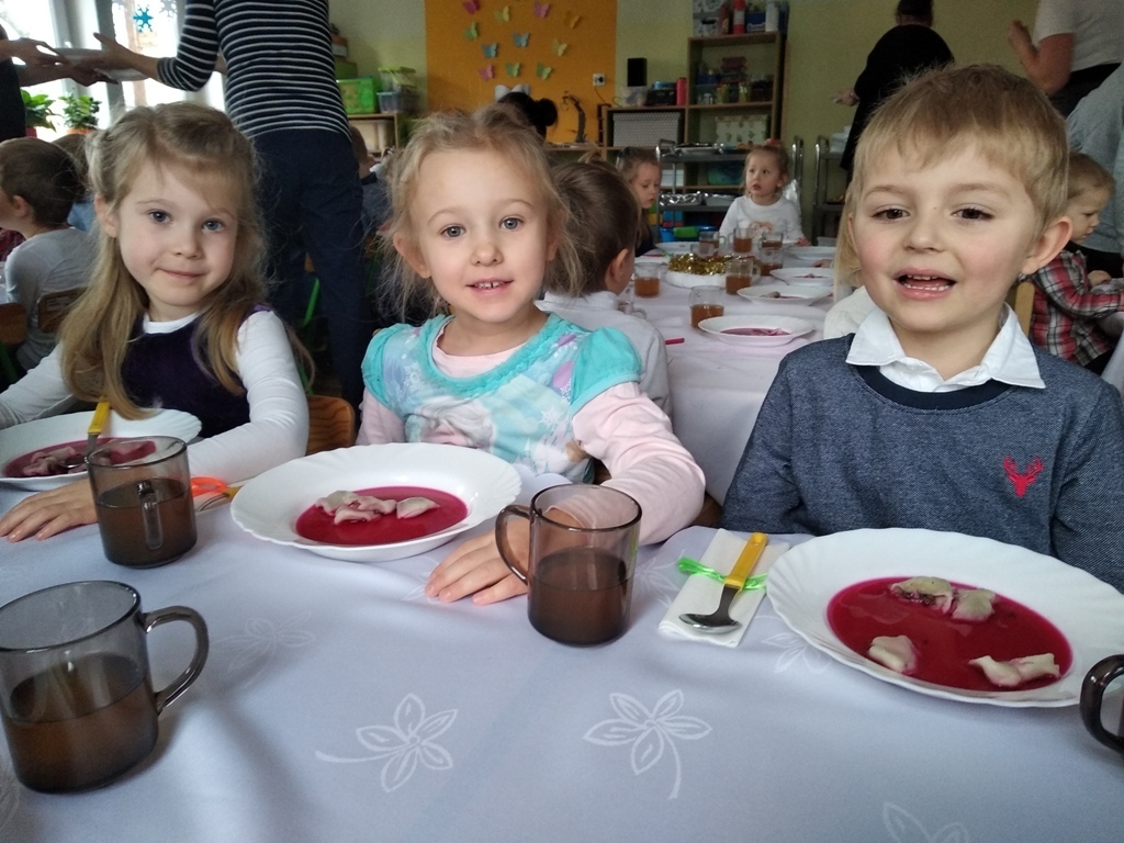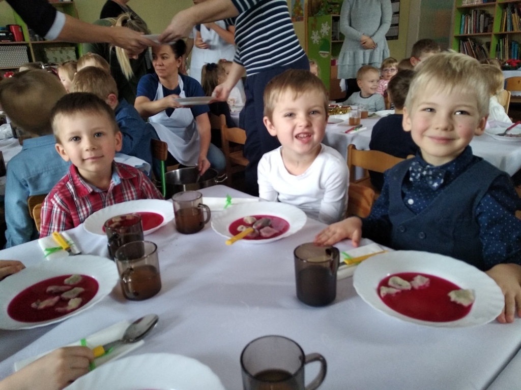 Dzisiejszego dnia odbyła się nasza wspólna przedszkolna wigilia. Na początku mieliśmy możliwość podziwiać piękne jasełka w wykonaniu starszaków. Następnie z kolędą na ustach wyruszyliśmy na wspólne spotkanie świąteczne. Pani Dyrektor złożyła nam piękne życzenia, po czym wspólnie mogliśmy życzyć sobie wesołych świąt. Na stole czekał już na nas przepyszny barszcz z uszkami i ryba po grecku. Po obiadku mogliśmy skosztować własnoręcznie wykonanych pierniczków. Poprzez dzisiejszy dzień coraz bardziej czujemy atmosferę świąt.