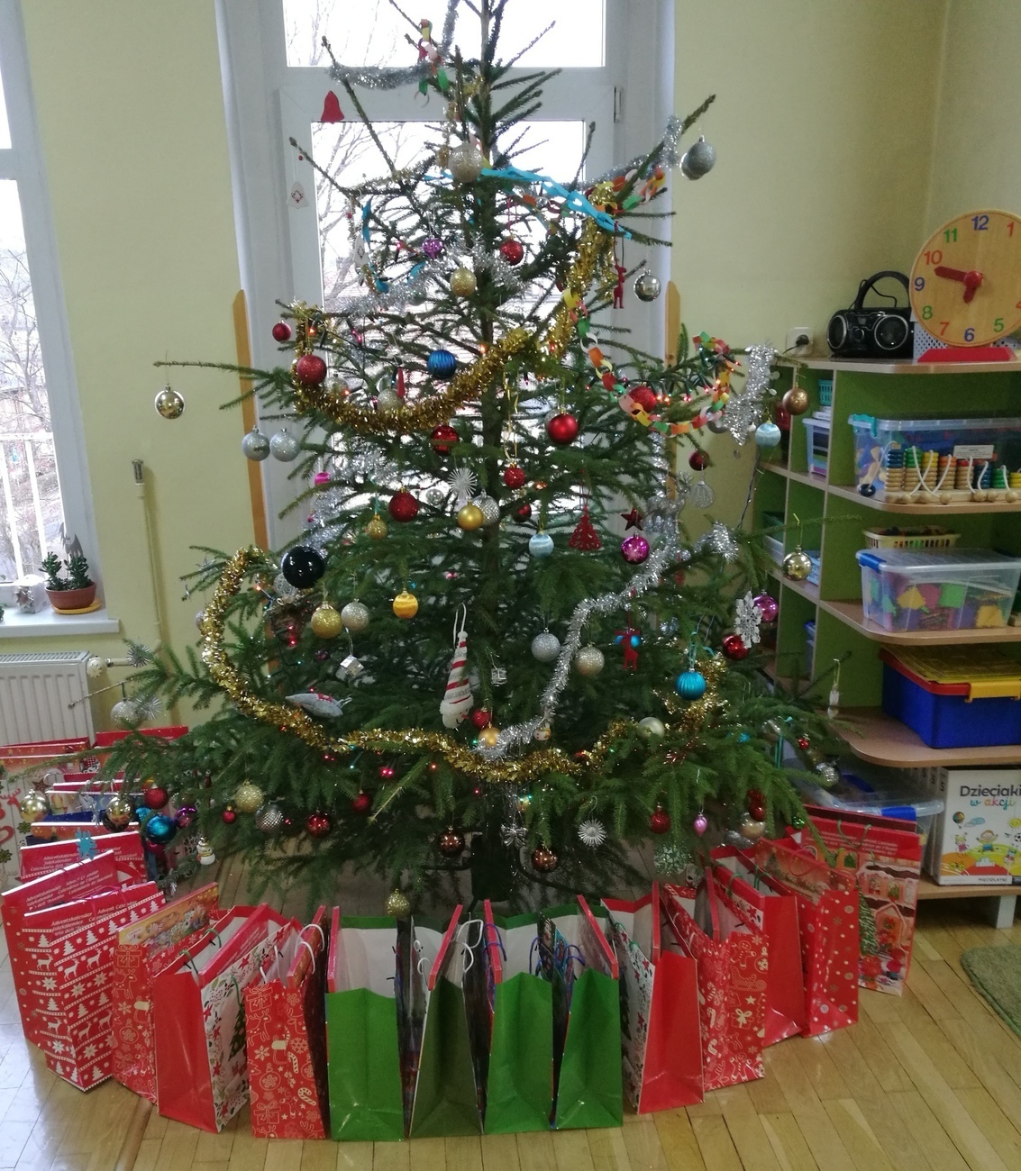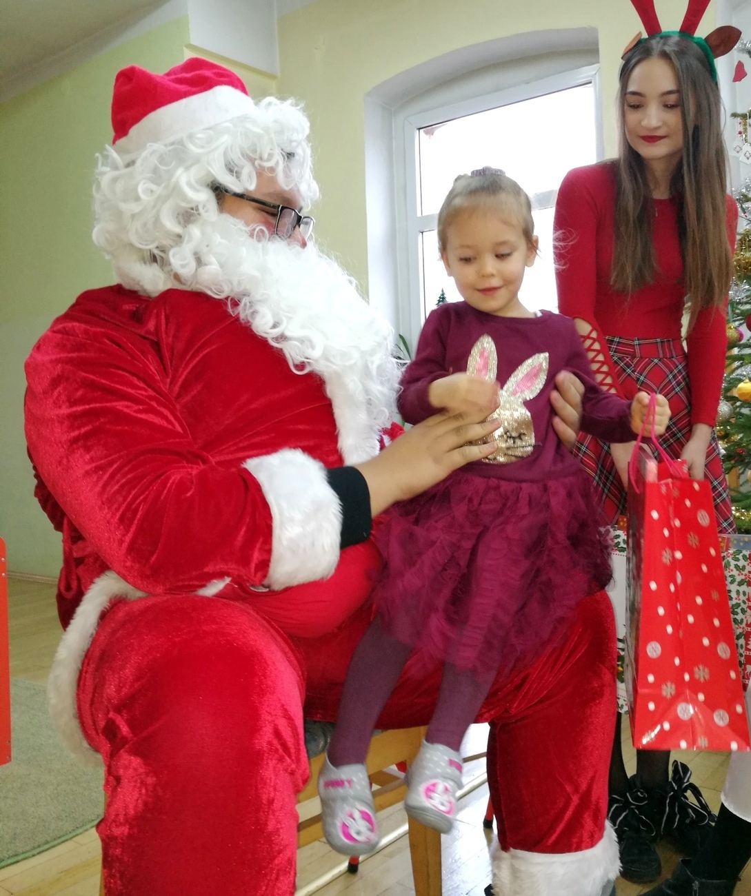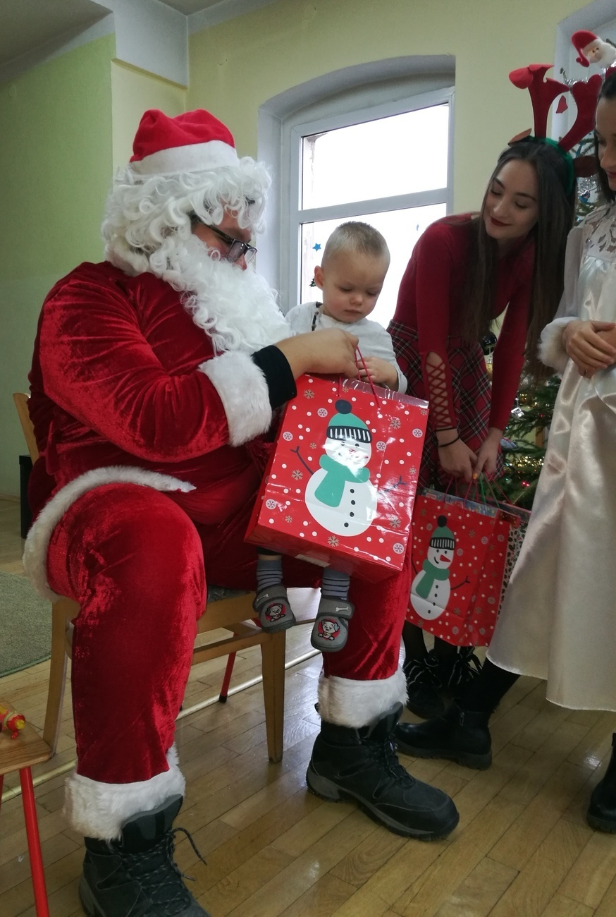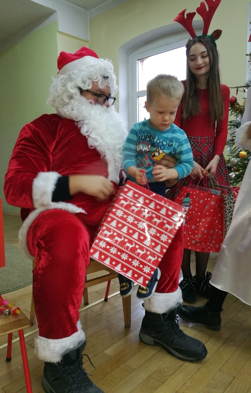 I oto dziś jest ten dzień, na który tak czekaliśmy. To dziś okaże się czy byliśmy grzeczni i zasłużyliśmy na prezenty i czy przyjdzie do nas wyczekiwany gość. Maluchy choć trochę zdezorientowane małym zamieszaniem, bacznie obserwowały okna. Pierwsze pytanie dotyczyło śniegu a właściwie jego braku i sań świętego. Jednak po chwili wszystkie pytania ucichły, bo w oddali słychać było dzwoneczki. To chyba magia bo w jednej chwili obok choinki pojawił się Mikołaj z aniołkami i z prezentami. Maluchy wykazały się dużą odwagą. Każdy z nich usiadł Mikołajowi na kolana i szepnął mu do ucha swoje życzenie. Na koniec spotkania dostaliśmy wspaniałe prezenty. Jeszcze długo po wizycie naszego gościa rozmawialiśmy o nim. Szkoda, że na następne spotkanie musimy czekać znowu cały rok.