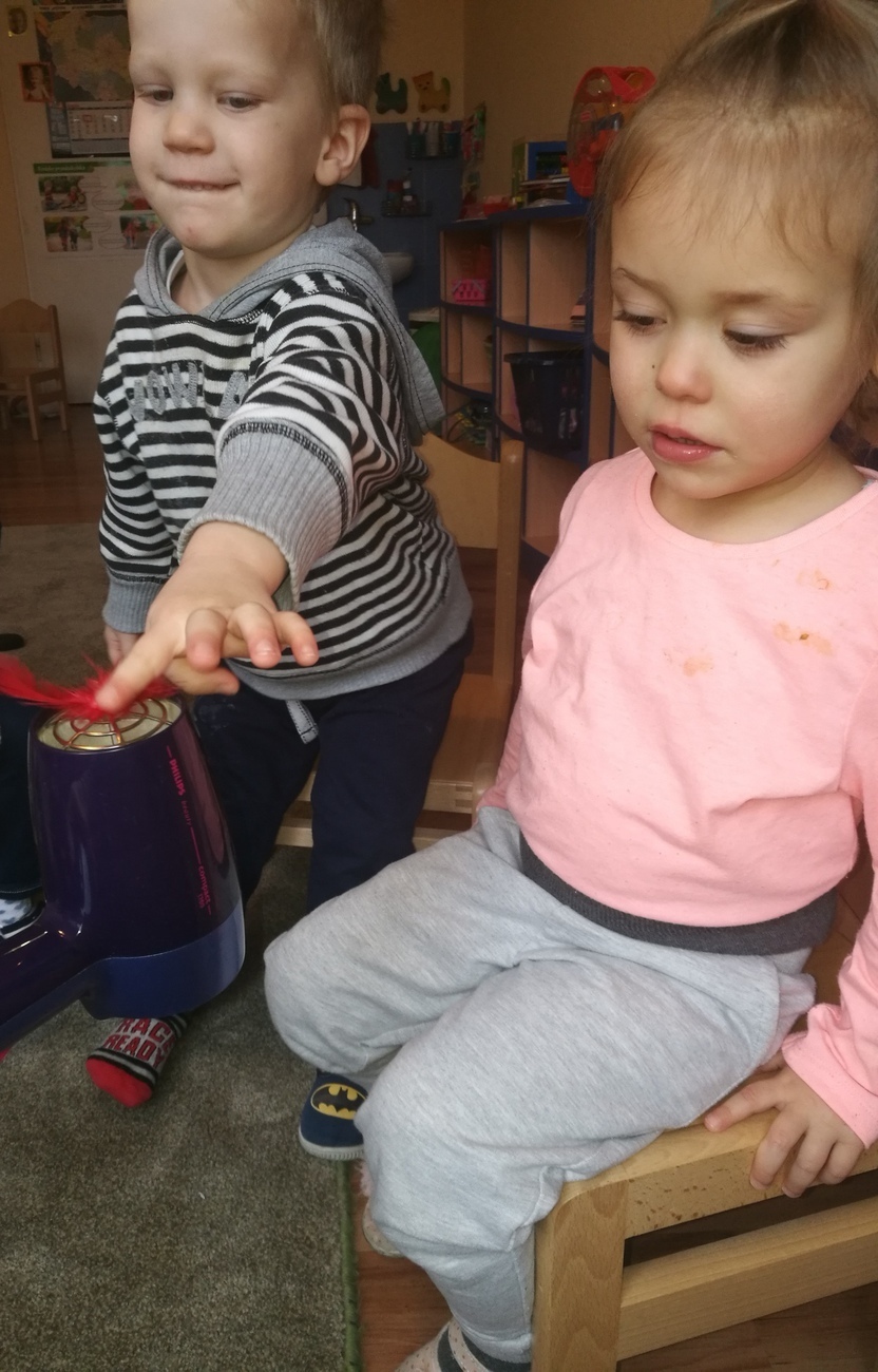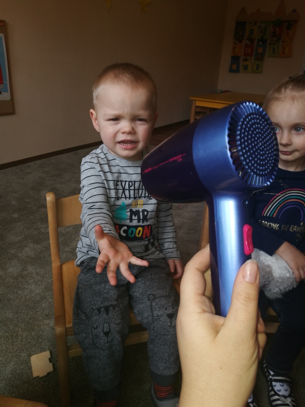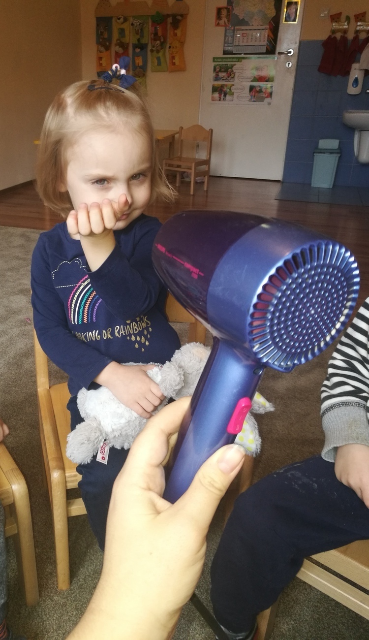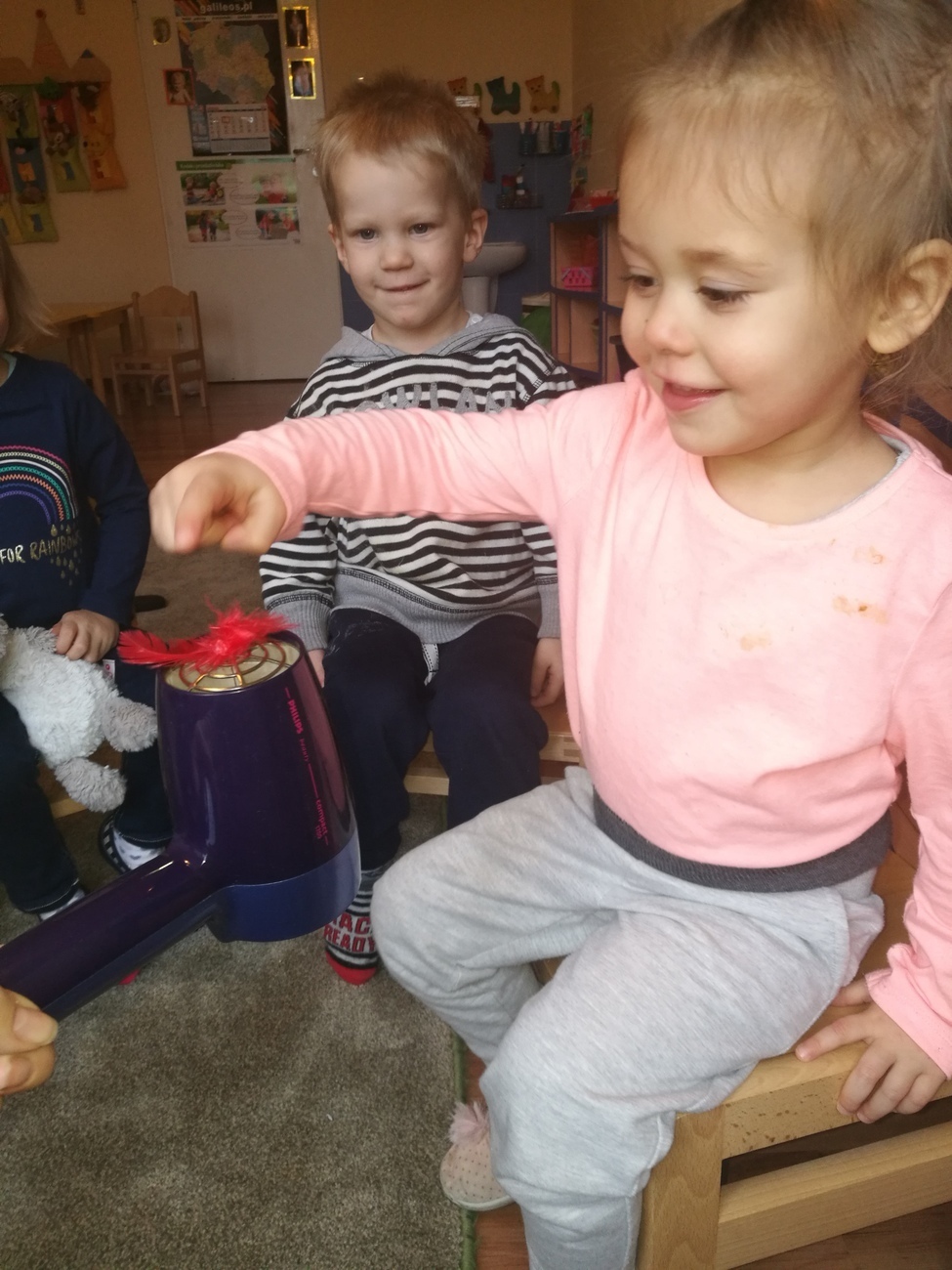 Już od poniedziałku w grupie "Skarbów" wiele się działo, my i nasza cała sala coraz bardziej jesteśmy gotowi na zbliżające się święta. W całym tym radosnym zamieszaniu znaleźliśmy chwilę by porozmawiać o sprawach bardziej naukowych , mianowicie o cieple i zimnie. Na początku zajęć pani przyniosła nam owoce, które były zamarznięte. Każdy z nas sprawdzał jak bardzo zimne są te owoce, i że znajduje się na nich szron /lód/ taki sam, który rano widzimy na trawie, krzakach czy pobliskich drzewach. Nasze rączki szybko zrobiły się zimne, więc zaraz przytuliliśmy się do kaloryfera, który był ciepły i ogrzał nasze paluszki. Następnie pani pokazała nam suszarkę, która wydmuchiwała ciepłe powietrze. Podobało nam się jak powietrze z suszarki unosiło do góry kolorowe piórka. Po zabawie ciepło, zimno zgodnie ustaliliśmy, że gdy na podwórku panuje zima to z przyjemnością bawimy się w cieplej sali, ale gdy lato króluje na zewnątrz to chłodek też może być przyjemny.