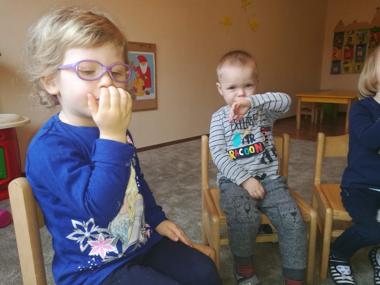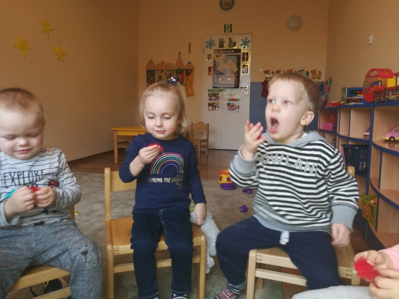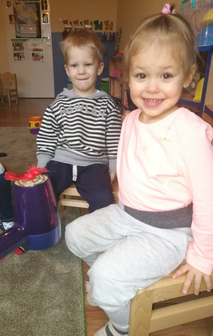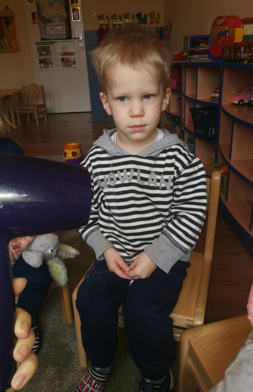 Już od poniedziałku w grupie "Skarbów" wiele się działo, my i nasza cała sala coraz bardziej jesteśmy gotowi na zbliżające się święta. W całym tym radosnym zamieszaniu znaleźliśmy chwilę by porozmawiać o sprawach bardziej naukowych , mianowicie o cieple i zimnie. Na początku zajęć pani przyniosła nam owoce, które były zamarznięte. Każdy z nas sprawdzał jak bardzo zimne są te owoce, i że znajduje się na nich szron /lód/ taki sam, który rano widzimy na trawie, krzakach czy pobliskich drzewach. Nasze rączki szybko zrobiły się zimne, więc zaraz przytuliliśmy się do kaloryfera, który był ciepły i ogrzał nasze paluszki. Następnie pani pokazała nam suszarkę, która wydmuchiwała ciepłe powietrze. Podobało nam się jak powietrze z suszarki unosiło do góry kolorowe piórka. Po zabawie ciepło, zimno zgodnie ustaliliśmy, że gdy na podwórku panuje zima to z przyjemnością bawimy się w cieplej sali, ale gdy lato króluje na zewnątrz to chłodek też może być przyjemny.
