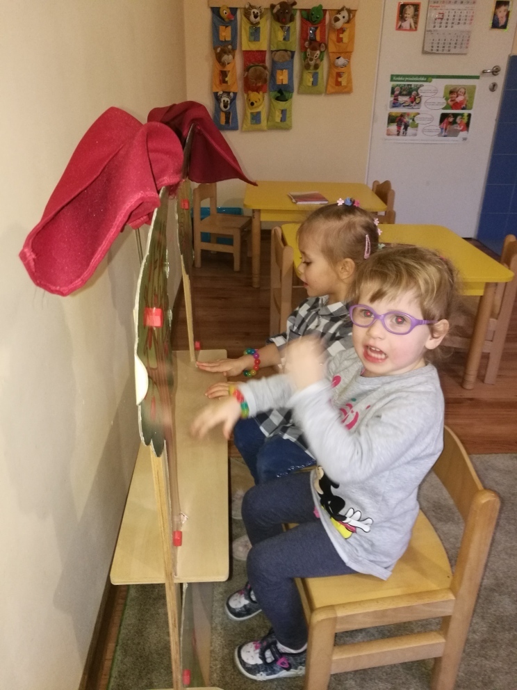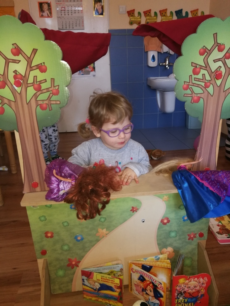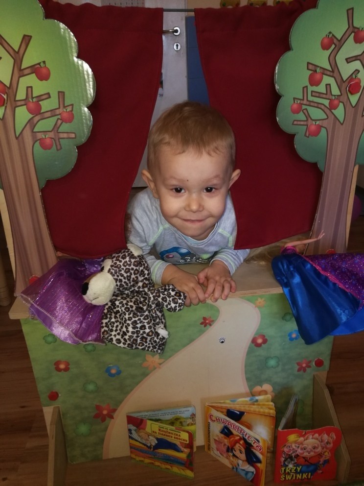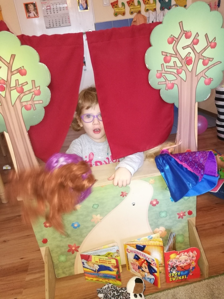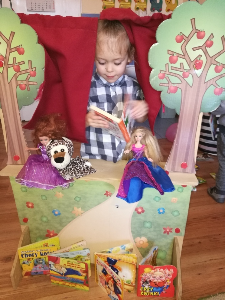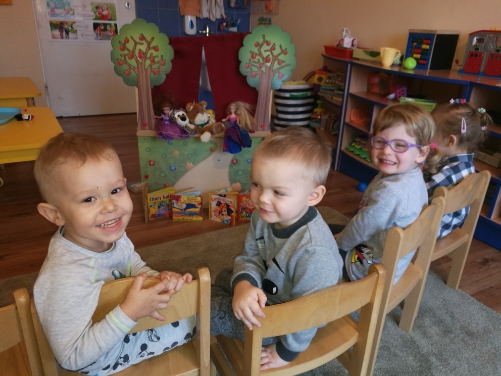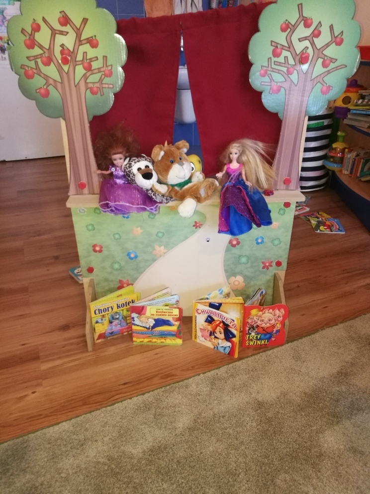 Dziś najmłodsze przedszkolaki trafiły do Bajkolandii - krainy, w której poznały właśnie baśnie i bajki. By podróż była ciekawsza, bajki przedstawione były dzieciom w formie krótkich przedstawień teatralnych. Dzięki tej formie zabawy, dzieci nie tylko poznały fabułę bajek ale i dowiedziały się o kilku zasadach obowiązujących w teatrze, w tym między innymi o nagradzaniu aktorów brawami. Mogły zobaczyć inscenizację „Chwalipięty”, „Chory kotek”, „Trzy świnki”, czy też „Księżniczki na ziarnku grochu”, „Skarby”. Z wielką uwagą oglądały przedstawienie, po czym same stanęły z drugiej strony kurtyny i wystawiały swoje własne bajki. W ciągu całych zajęć świetnie się bawiły. Teatrzyk zagości u nas na jeszcze na klika dni.