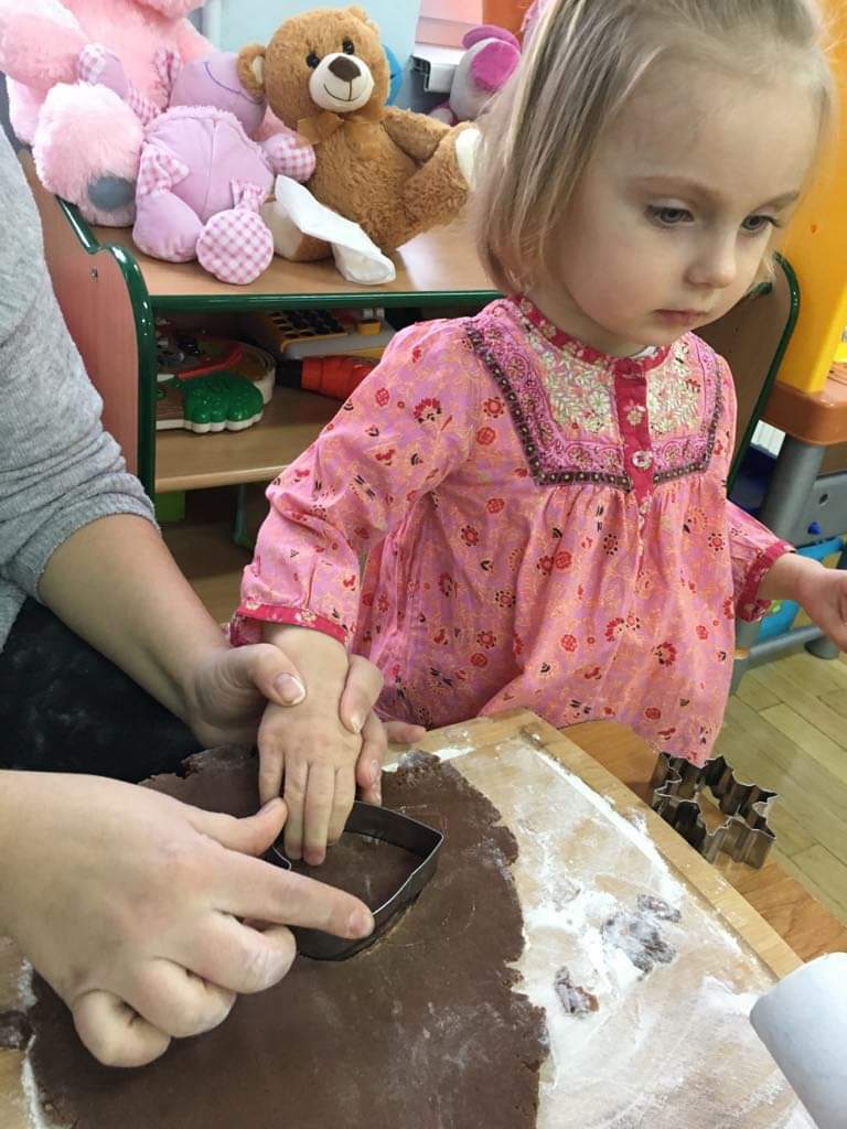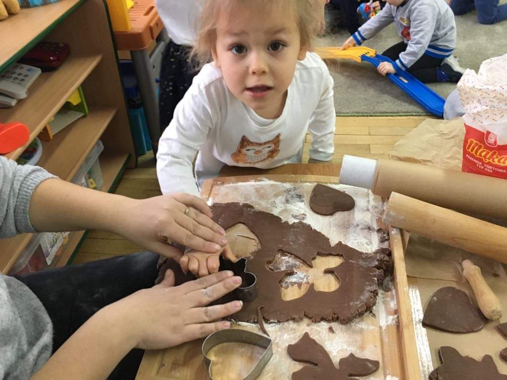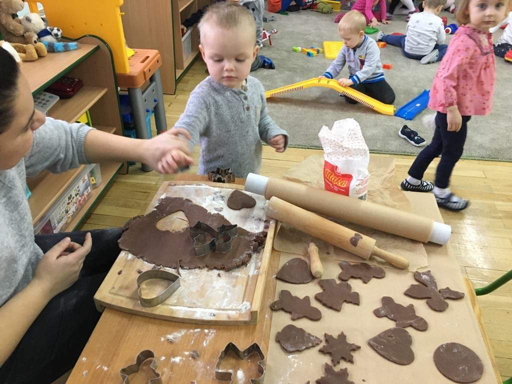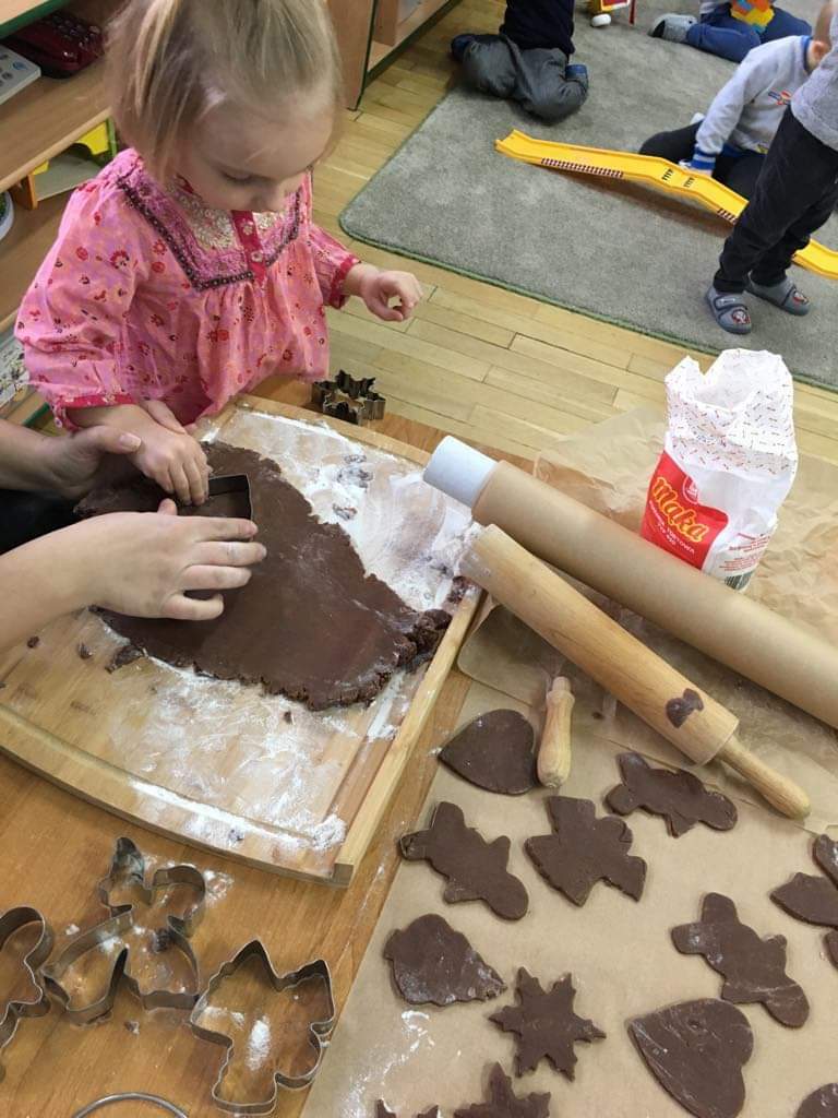 Dziś w całym przedszkolu, można dosłownie poczuć atmosferę swiatDziś w całym przedszkolu można dosłownie poczuć atmosferę świąt. Zaraz po pierwszym śniadaniu, ochoczo zabraliśmy się do robienia pierników. Z przygotowanego ciasta wykrawaliśmy świąteczne wzory. Są piernikowe ludziki, serca, aniołki, choinki, a nawet gwiazdki. Ciasto tak pięknie pachniało, że niektórzy nawet chcieli zjeść je surowe, na szczęście panie z przedszkola, szybko wyjaśniły, że znacznie smaczniejsze będą te upieczone. Gdy odesłaliśmy pierniczki do przedszkolnej kuchni, to po pewnym czasie, rozniósł się po budynku niesamowity zapach pierników. Już teraz wiemy, że to znaczy poczuć magię świąt.