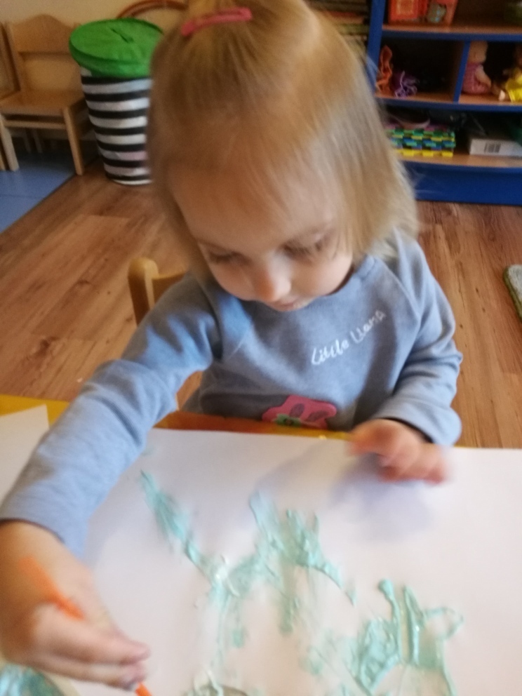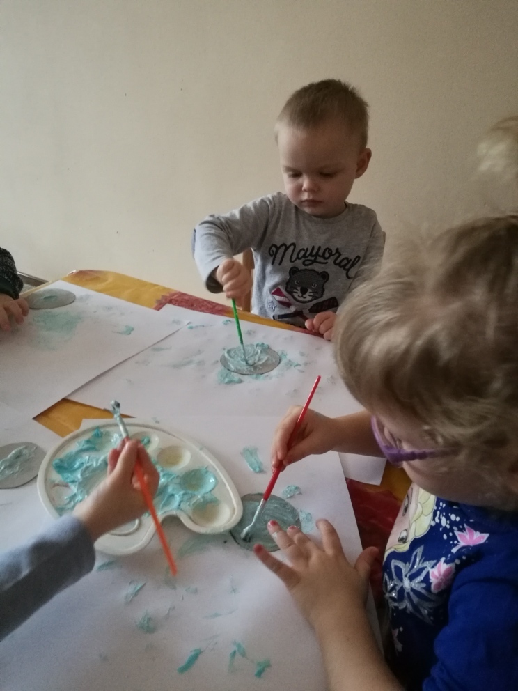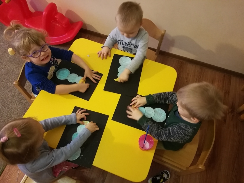 Piękna zimowa aura za oknem zainspirowała maluchy do tego, by w jakiś sposób zaprosić zimę do nas do sali. Od razu przyszedł nam do głowy pomysł, by honorowym zimowym gościem stał się przyjaciel wszystkich dzieci - bałwan. Do zrobienia bałwanka wykorzystaliśmy kartonowe krążki, kolorowy papier, cekiny, pastę ale zaraz po rozpoczęciu pracy dzieci stwierdziły, ze to super pomysł bo nie tylko ładnie wygląda, ale i pachnie i smakuje. Po zakończonej pracy byliśmy bardzo z siebie dumni Cztery piękne bałwany ozdobiły nasza salę i sprawiły, ze choć trochę zagościła w niej pani ZIMA.