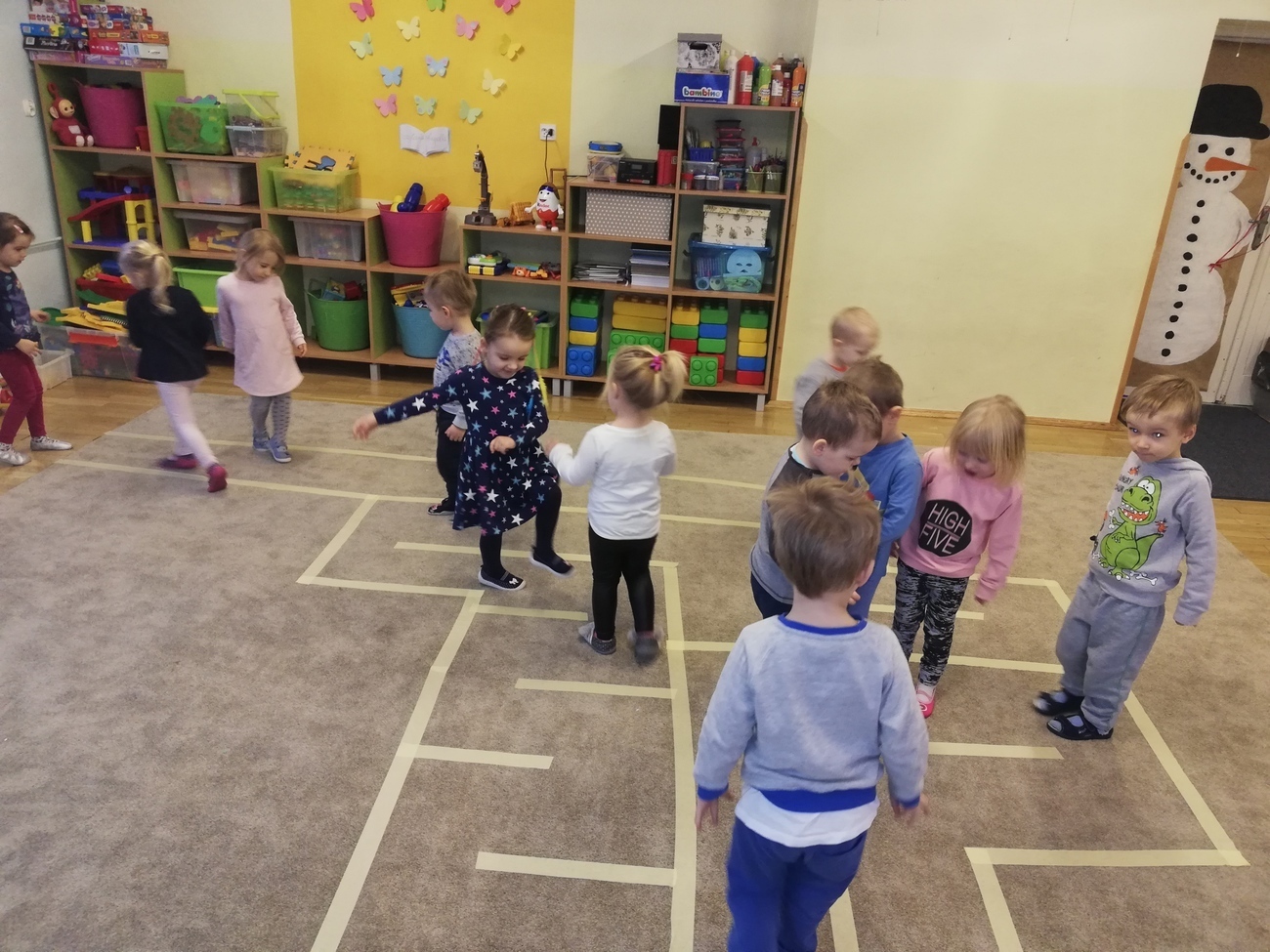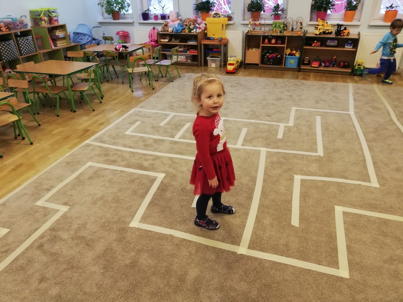 Tego dnia w naszej sali czekała niespodzianka. Pani Kasia zrobiła nam na dywanie coś nietypowego, czego nigdy jeszcze nie mieliśmy okazji widzieć. Były to linie połączone ze sobą. Wyjaśniła nam, że jest to labirynt, który musimy przejść. Na pierwszy rzut oka było to bardzo trudne zadanie jednak po chwili okazało się, że to świetna zabawa. Najpierw każdy z nas pokonywał labirynt pojedynczo aby się z nim zapoznać. Następnie mogliśmy przechodzić przez labirynt tyle razy ile tylko chcieliśmy. Pani Kasia dawała nam zadania do wykonania. Jedne były bardzo proste inne trudniejsze ale wszystko to sprawiało, że była to świetna zabawa.