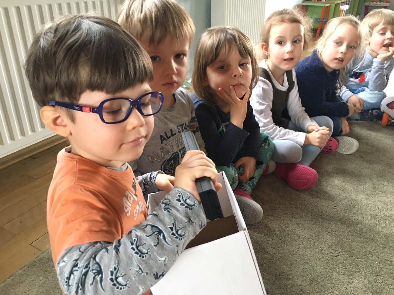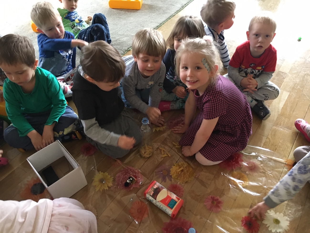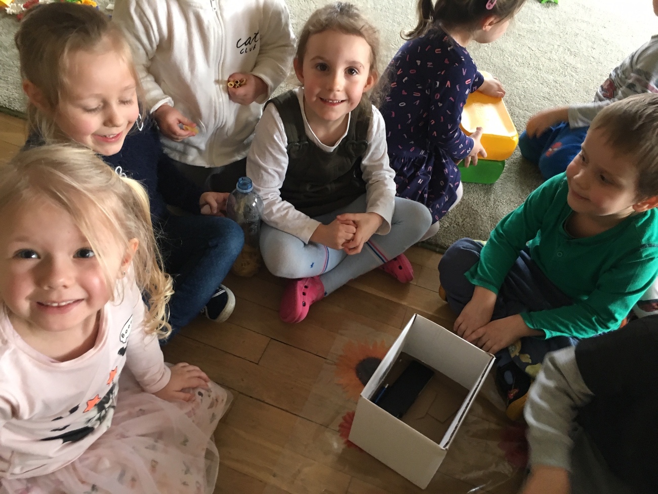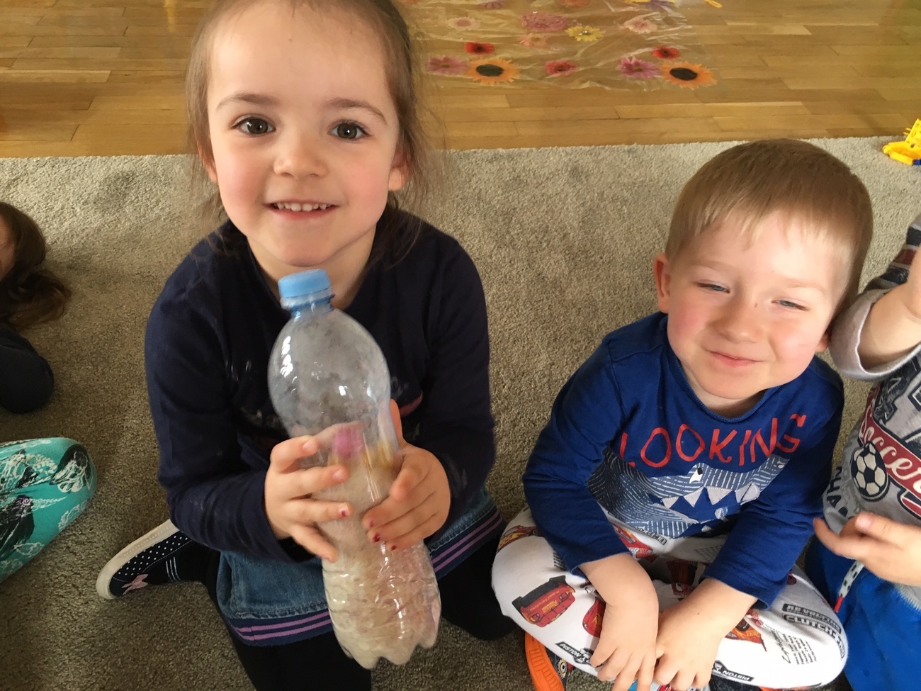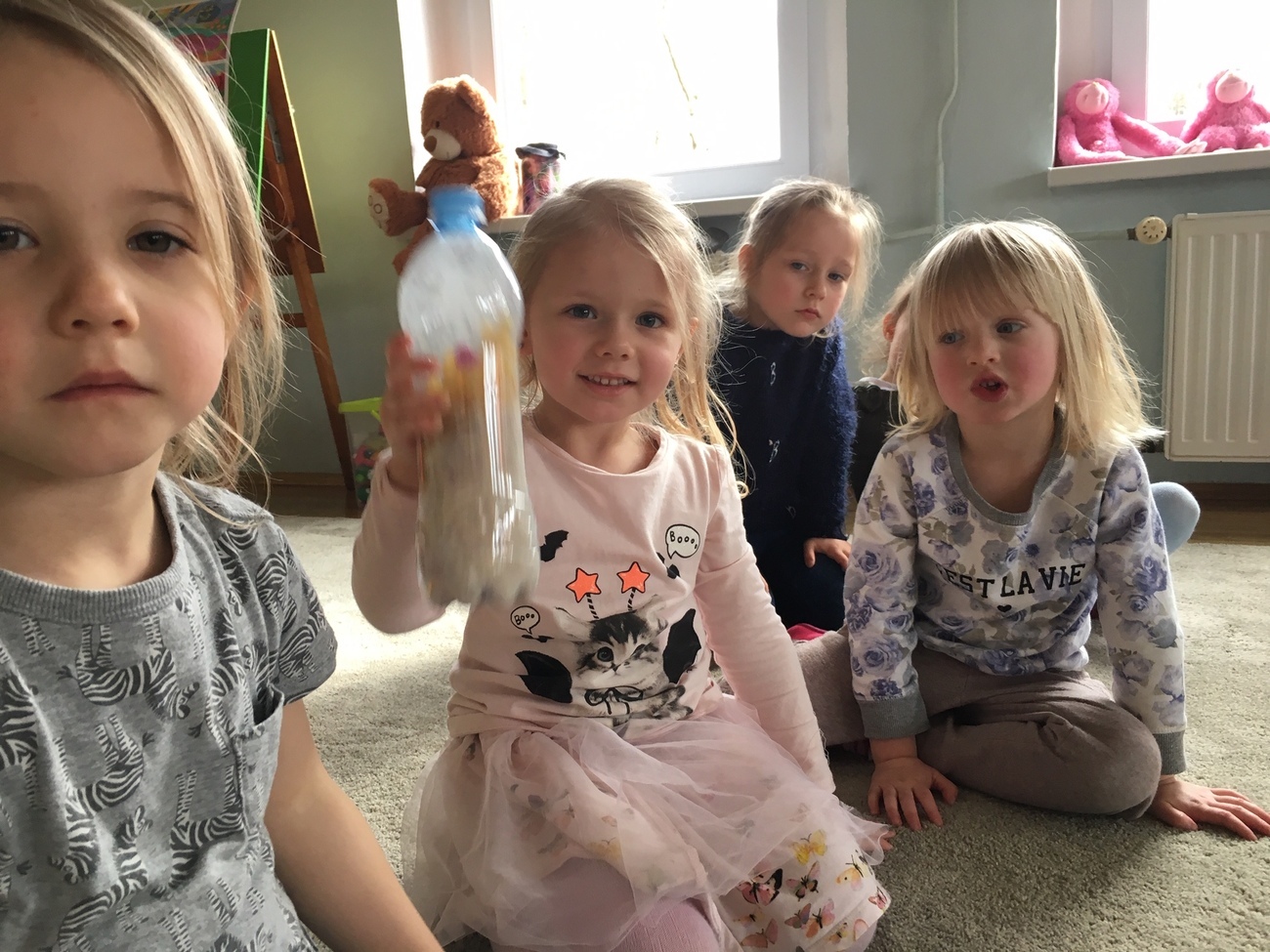 Na zakończenie dnia zrobiliśmy wspólnie butelki sensoryczne wykorzystując potencjalne śmieci-butelki.
