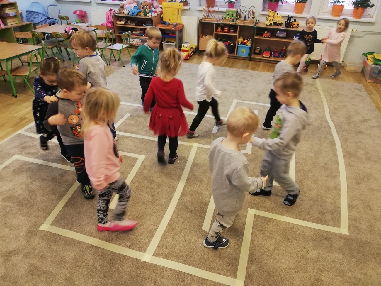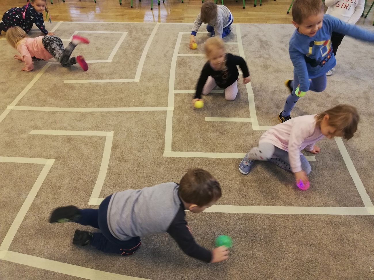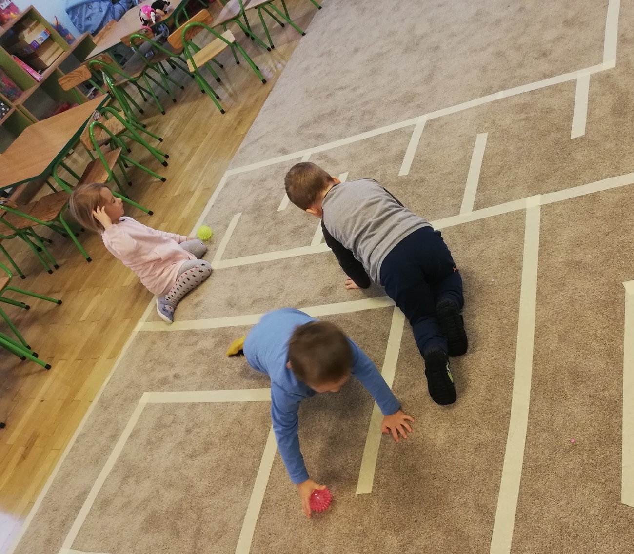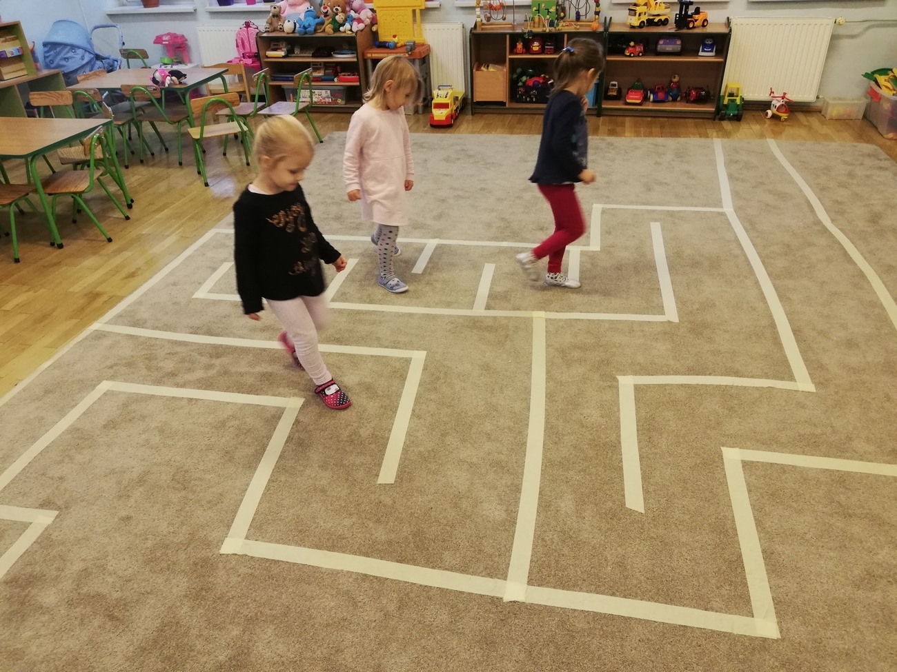 Tego dnia w naszej sali czekała niespodzianka. Pani Kasia na dywanie zrobiła nam coś nietypowego, czego nigdy jeszcze nie mieliśmy okazji widzieć. Były to linie połączone ze sobą. Pani wyjaśniła nam, że jest to labirynt, który musimy przejść. Na pierwszy rzut oka było to bardzo trudne zadanie jednak po chwili okazało się, że to świetna zabawa. Najpierw każdy z nas pokonywał labirynt pojedynczo aby się z nim zapoznać. Następnie mogliśmy przechodzić przez labirynt tyle razy ile tylko chcieliśmy. Pani Kasia dawała nam zadania do wykonania. Jedne były bardzo proste inne trudniejsze ale wszystko to sprawiało, że była to świetna zabawa.