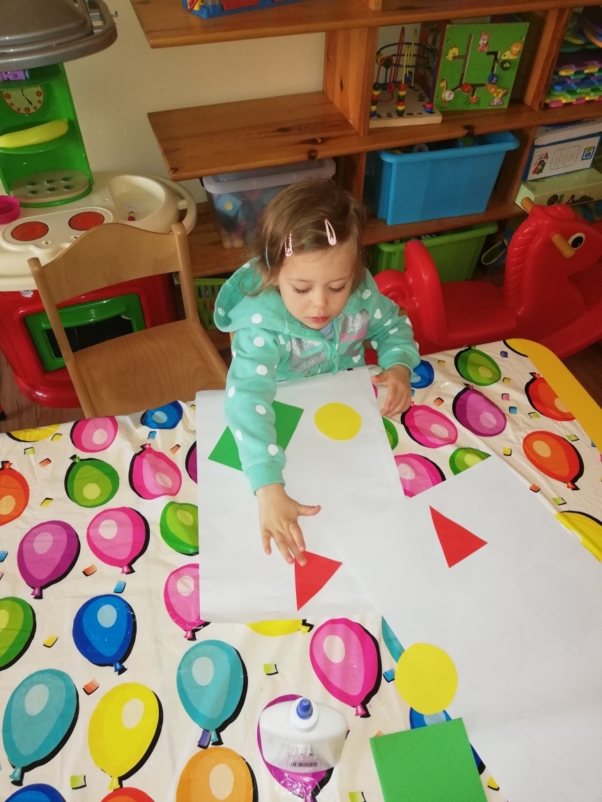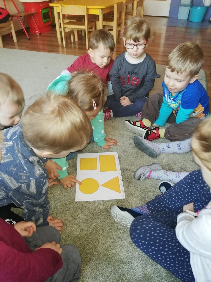 koło, trójkąt, kwadrat, prostokąt. Bardzo dobrze wskazywały figury w naszej sali i potrafiły je nazwać oraz określić