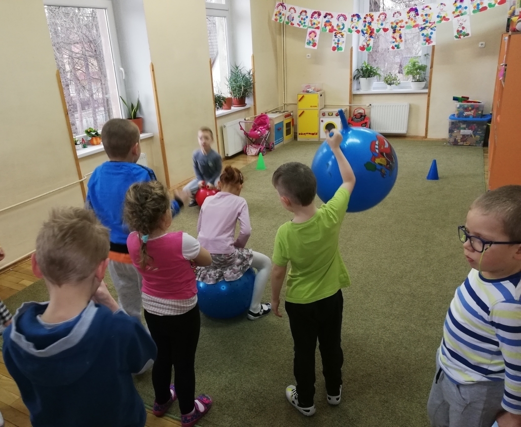 skakanie na piłce, biegi między pachołkami, przejście z woreczkiem na głowie itp. Dzieci bardzo chętnie