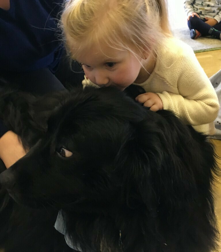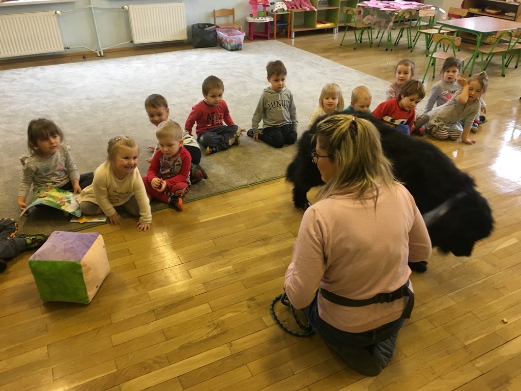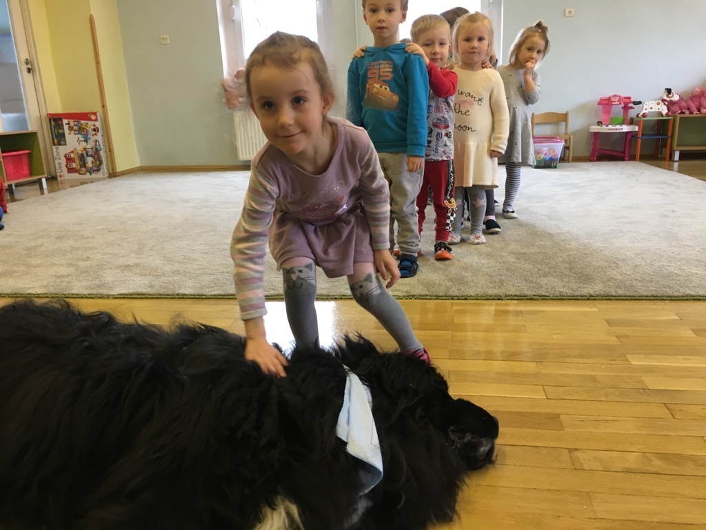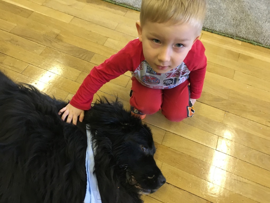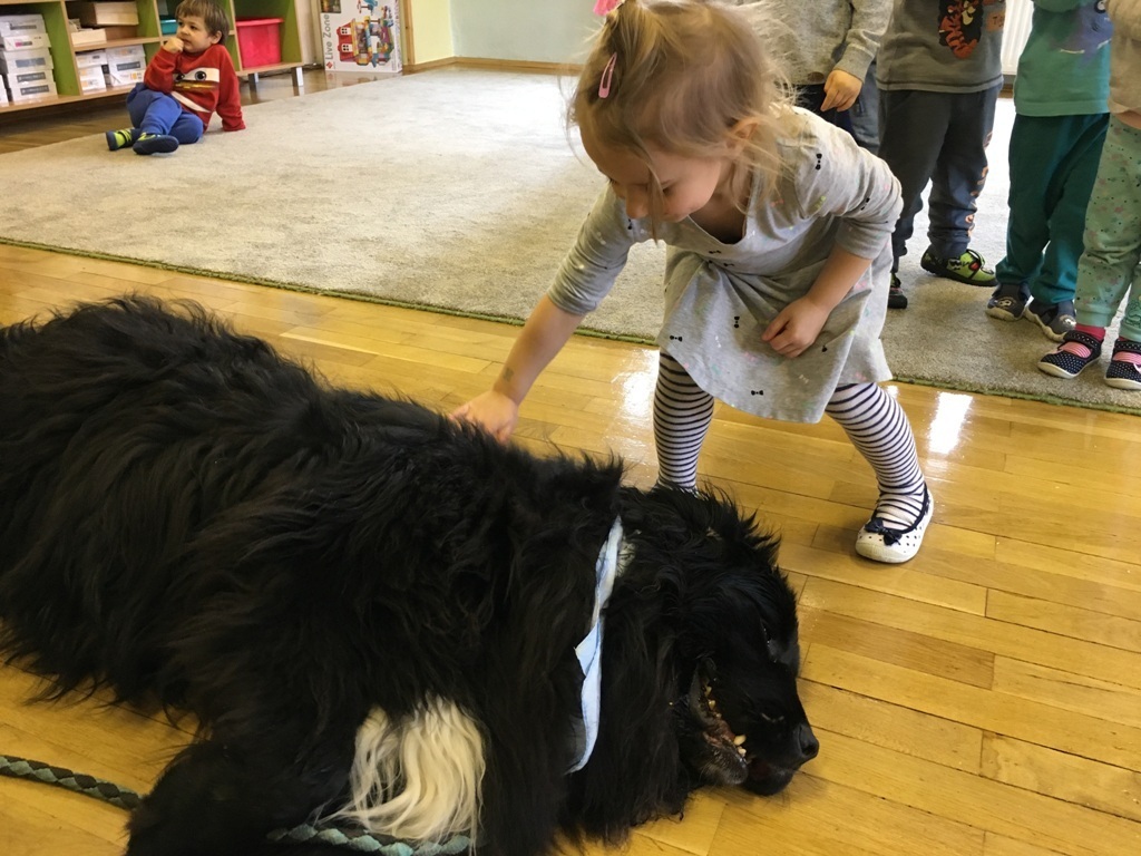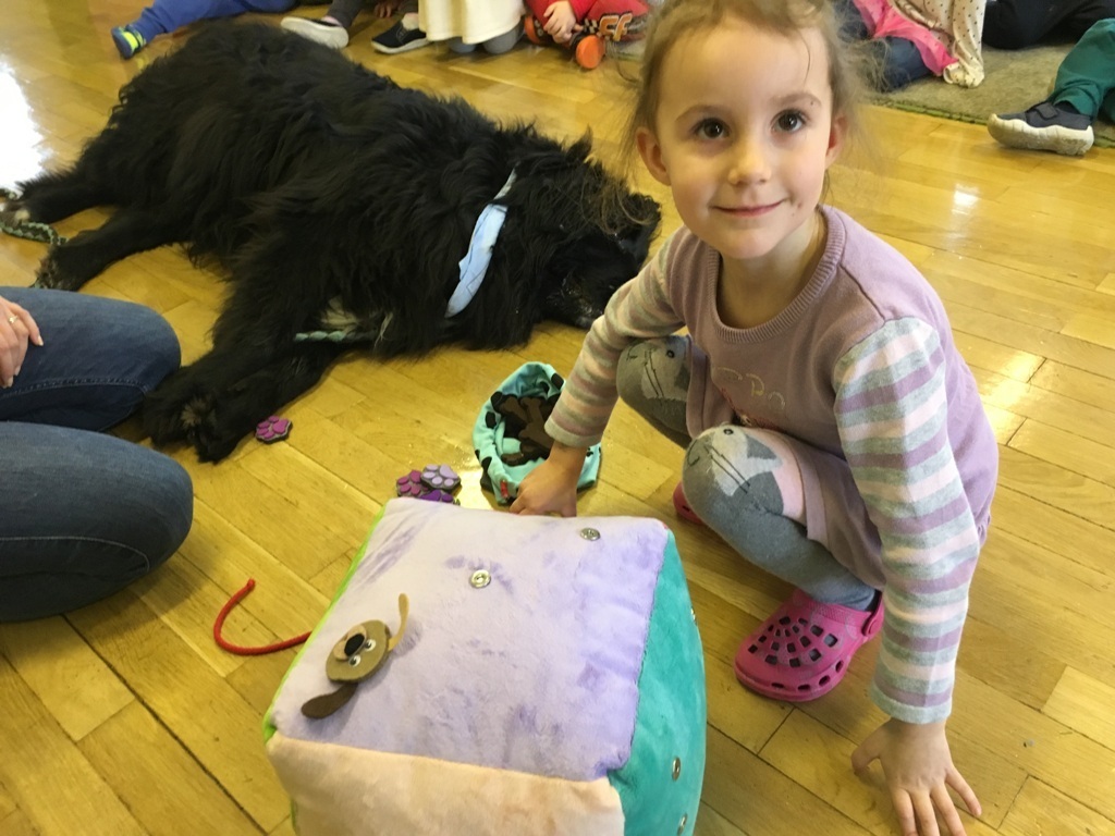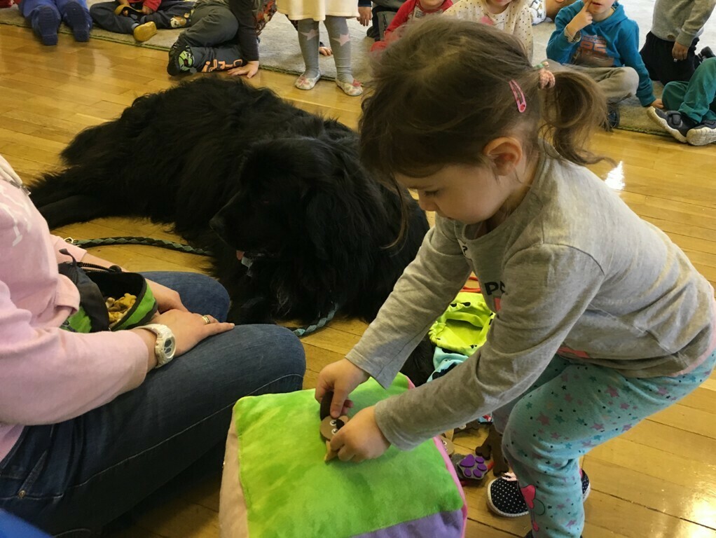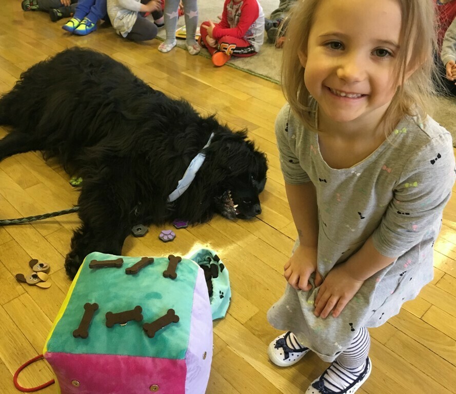 W miniony piątek odbyły się zajęcia z psem rasy Nowofundland o wdzięcznym imieniu Lena. Przedszkolaki rzucały dużą pluszową kostką, następnie miały za zadanie policzyć oczka i przyczepić wyznaczone filcowe elementy – psich kostek, pyszczków i łapek. Dzieci miały ogromną frajdę podejmując nowe wyzwania matematyczne i podając rozwiązanie. Na koniec zajęć Lena czekała na przytulanie i głaskanie, odprężająca ciepła i miękka sierść dostarczyła dzieciom nowych doznań, a nasz czworonożny przyjaciel to prawdziwa przytulanka!.