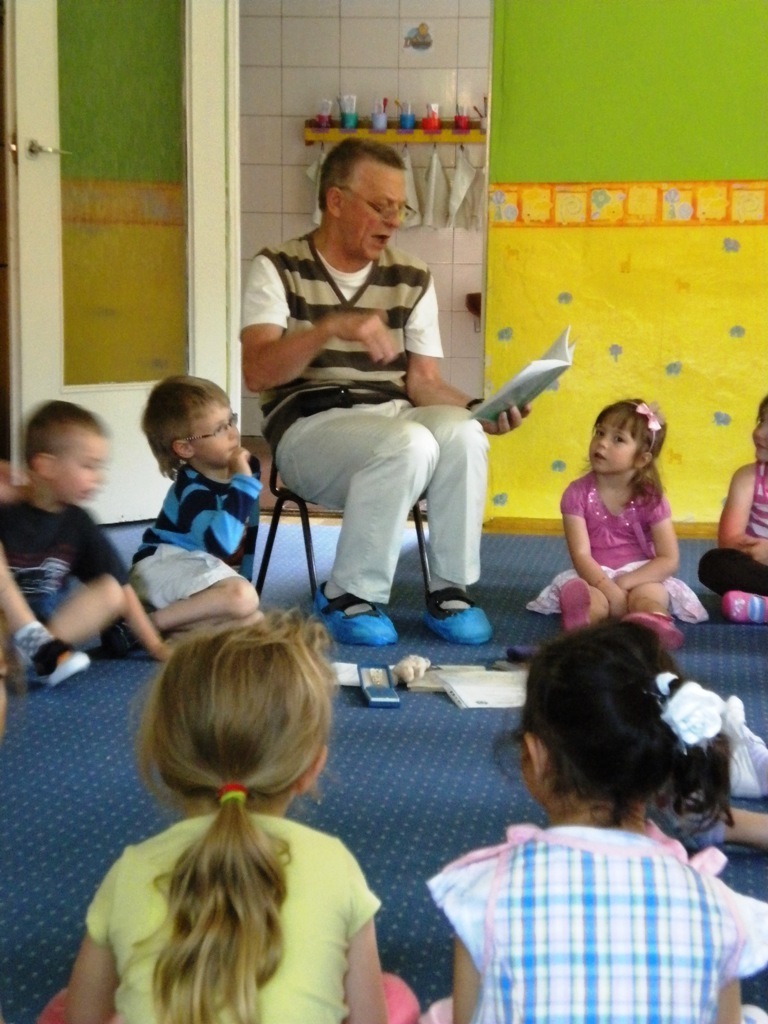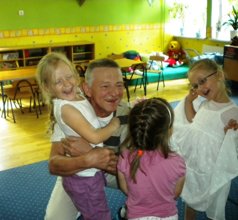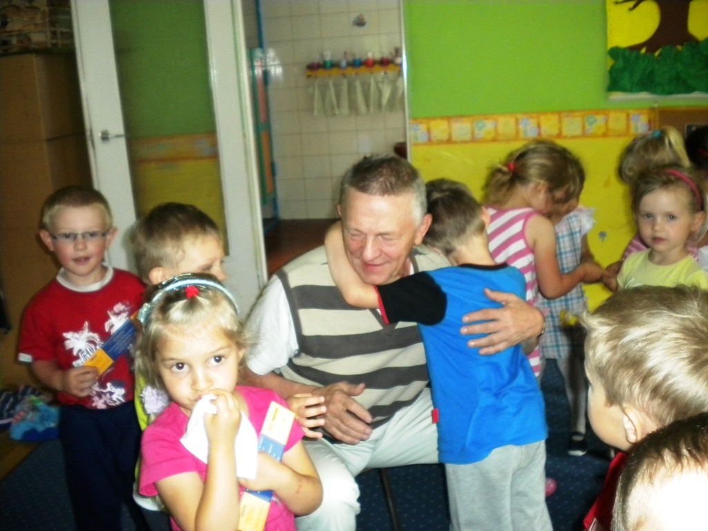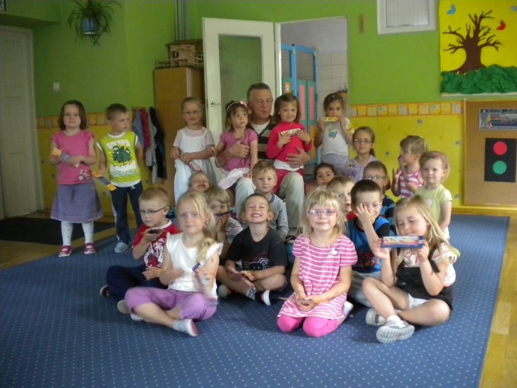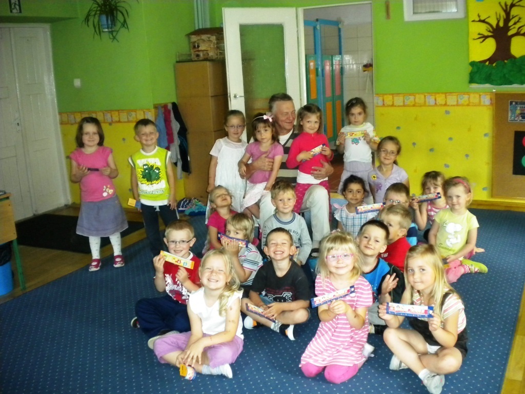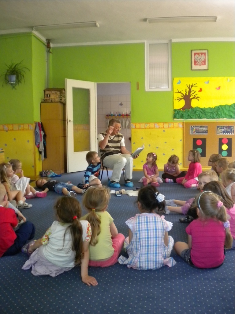 Zadanie jakie pan Ryszard sobie obrał, to czytanie dzieciom w szkołach i przedszkolach literatury pięknej. W naszym placówce przeczytał między innymi takie utwory literackie jak: „Lokomotywa”, „Rzepka”. Dzieci brały czynny udział podczas recytacji wierszy. W prezencie otrzymaliśmy od pana Ryszarda zakładki do książeczek, które każdego wieczoru przed snem czytają nam rodzice.
