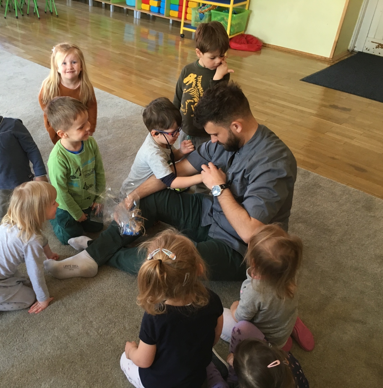 a także zachęcenie dzieci do dbania o własne zdrowie. Pan Doktor opowiedział o swojej pracy, pokazał dzieciom podstawowe narzędzia pracy jak stetoskop, fartuch, maseczka. Dzieci włączyły się w dyskusję, odpowiadając na pytania dotyczące zdrowego stylu życia, właściwego odżywiania oraz zachowania higieny - Smerfy doskonale wiedzą dlaczego trzeba myć ręce i zęby! Na koniec spotkania maluchy miały okazję użyć stetoskopu i posłuchać