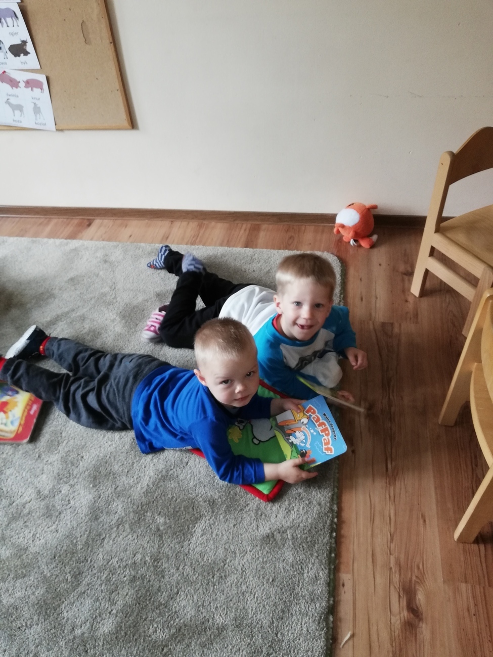 Przenosiliśmy się wtedy w świat marzeń i wyobrażaliśmy sobie, że jesteśmy bohaterami bajki. Przyszedł też czas na relaks. Wzięliśmy swoje ulubione książeczki i w ciszy tak jak w bibliotece oglądaliśmy je. Na koniec zbudowalismy z klocków księgarnie i wymienialiśmy się bądź kupowaliśmy książki.