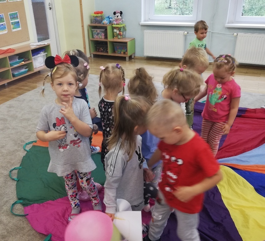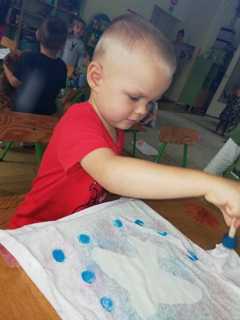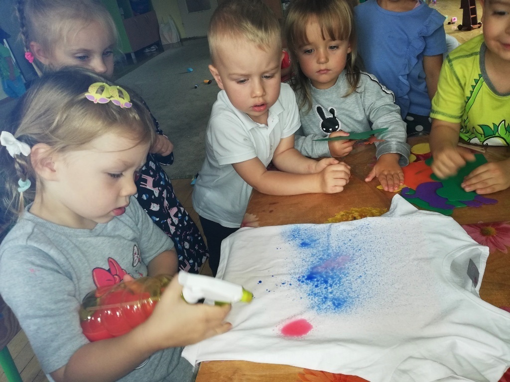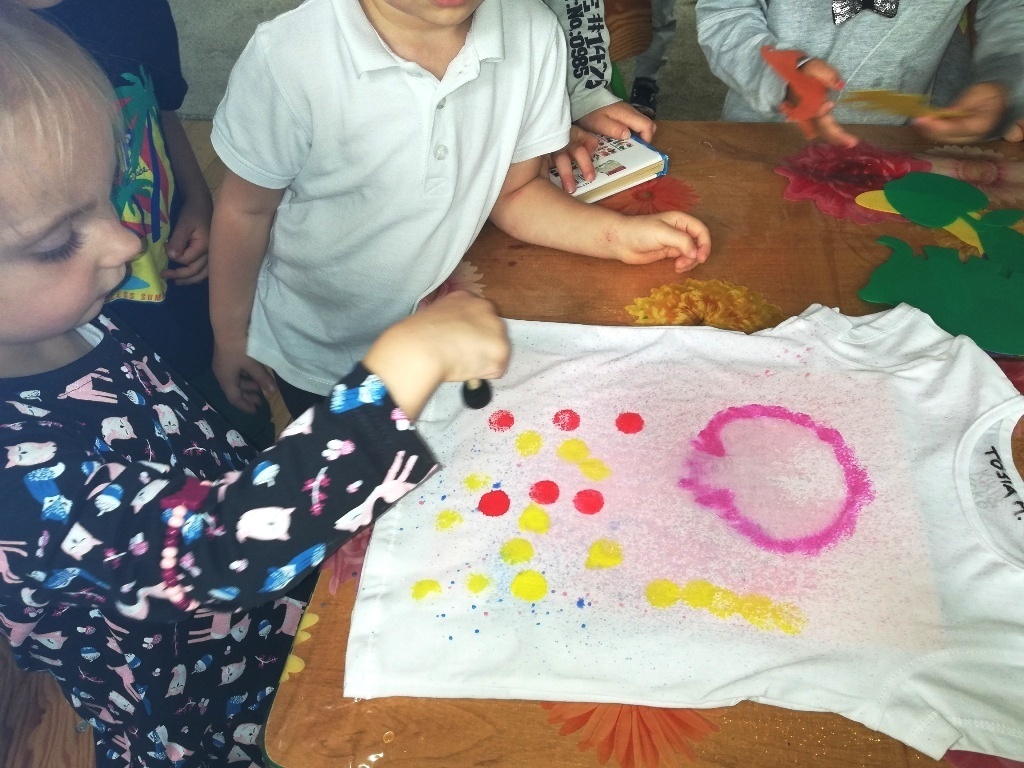 Szaleństwo kolorów w grupie II. Dzieci wraz z Panią Kasią poznawały kolory. Zabawy z chustą animacyjną sprawiły że śmiech i radość nie chciały nas opuścić. Nawet na zajęciach z języka angielskiego z panem Marcinem mówiliśmy o kolorach. Na koniec zajęć dzieciaczki miały szansę zmienić się w prawdziwych artystów. Każde z nich przemieniło się w malarza, który mógł samodzielnie stworzyć swoje dzieło. Przy pomocy pędzli do tapowania, spryskiwaczy, szablonów do odrysowania oraz farb do tkanin powstawały piękne dzieła na białych koszulkach. Jak wiadomo
