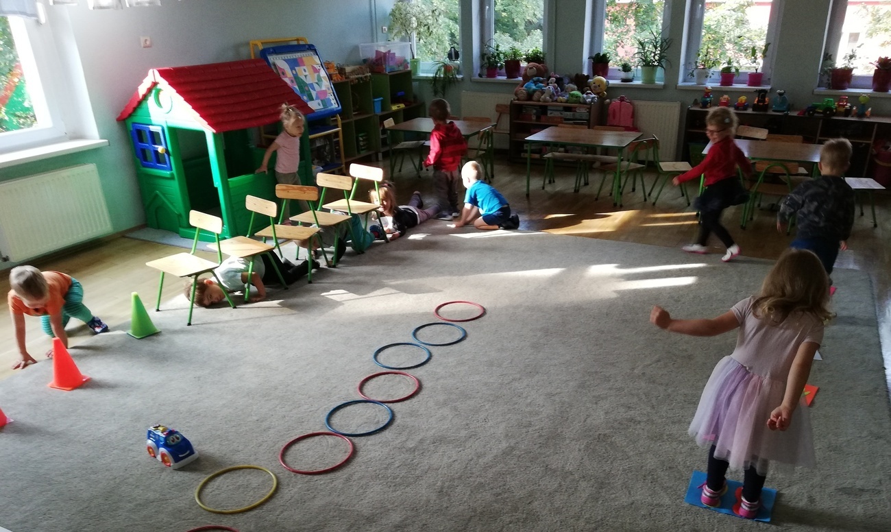 pod krzesełkami, skakanie do kółek, łapanie równowagi, biegi między pachołkami, skłonny
