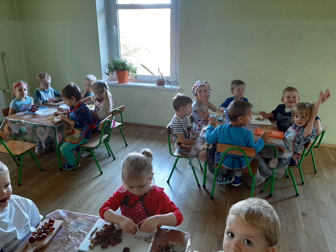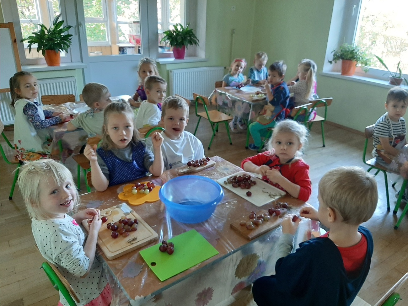 Smerfy już od rana były bardzo podekscytowane ponieważ tego dnia miały zrobić własnoręcznie sałatkę owocową. Każdy Smerf przyniósł jakiś wyznaczony owoc, deseczkę i fartuszek by móc coś przyrządzić własnoręcznie. Praca była bardzo trudna, gdyż musieliśmy wszystko dokładnie umyć, obrać i pokroić, oczywiście nikt nie narzekał. Wszyscy kroili i mieszali z ogromnym zaangażowaniem. Na koniec nasze Panie wszystko dobrze wymieszały w misce i dały nam na spróbowanie. Naszym zdaniem wszystko udało się doskonale.