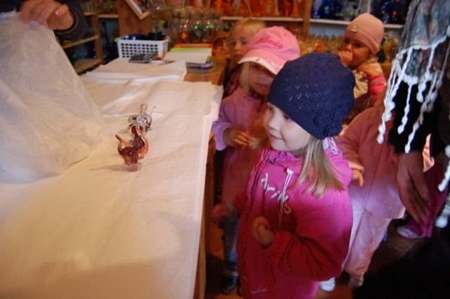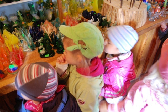 Pierwszym punktem naszego szlaku była Leśna Huta Szkła. Zobaczyliśmy tu tradycyjne metody wytopu szkła barwionego formowanego ręcznie, dawne narzędzia i formy kuglerskie. Poznaliśmy zawód hutnika szkła. W sklepie z pamiątkami mogliśmy podziwiać gotowe wyroby. Każde dziecko dokonało pamiątkowych zakupów.