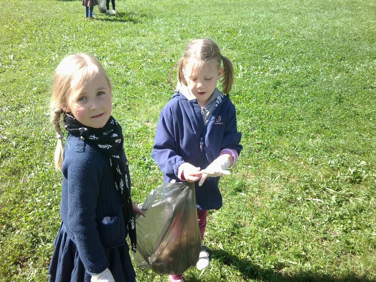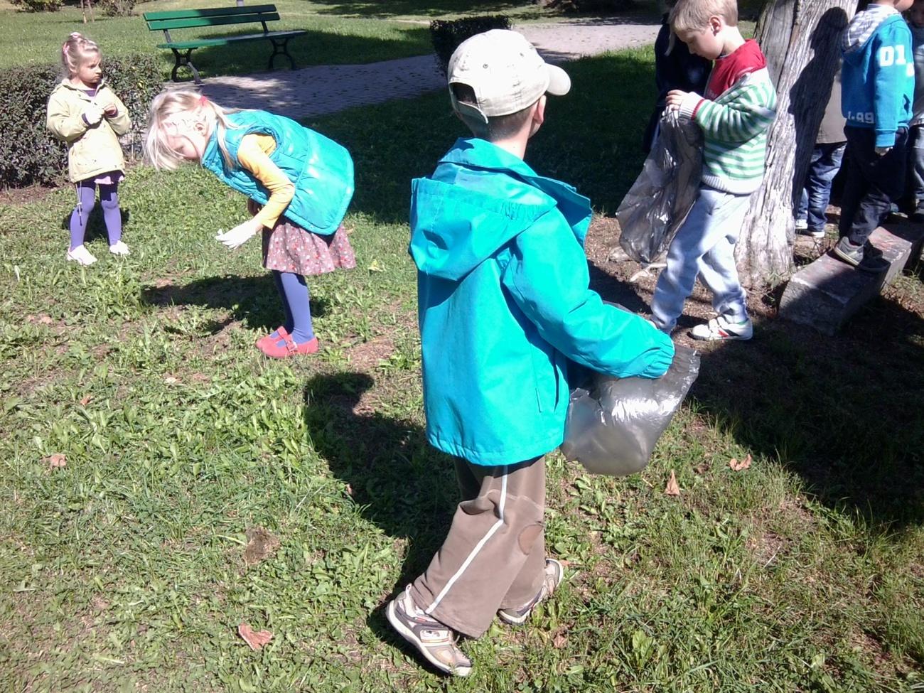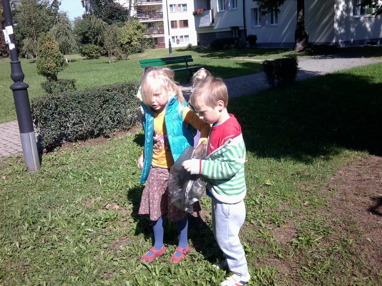 Zanim wzięliśmy się do pracy, nasze panie uprzedziły nas, jakie śmieci możemy sprzątać a czego podnosić nam nie wolno. I tak w naszych workach znalazły się stare gazety, papierki po cukierkach, batonikach, plastikowe butelki i nakrętki. Sami byliśmy zaskoczeni, ile uzbieraliśmy śmieci. Po tak ciężkiej pracy, mogliśmy pobawić się w parku. Wiele radości sprawiła nam zabawa w tak czystym miejscu. Teraz każdy z nas pilnuje by wszystkie śmieci trafiły do odpowiedniego kontenera. Można powiedzieć, że staliśmy się małymi strażnikami porządku- pewnie nie jeden dorosły mógłby się wiele od nas nauczyć.