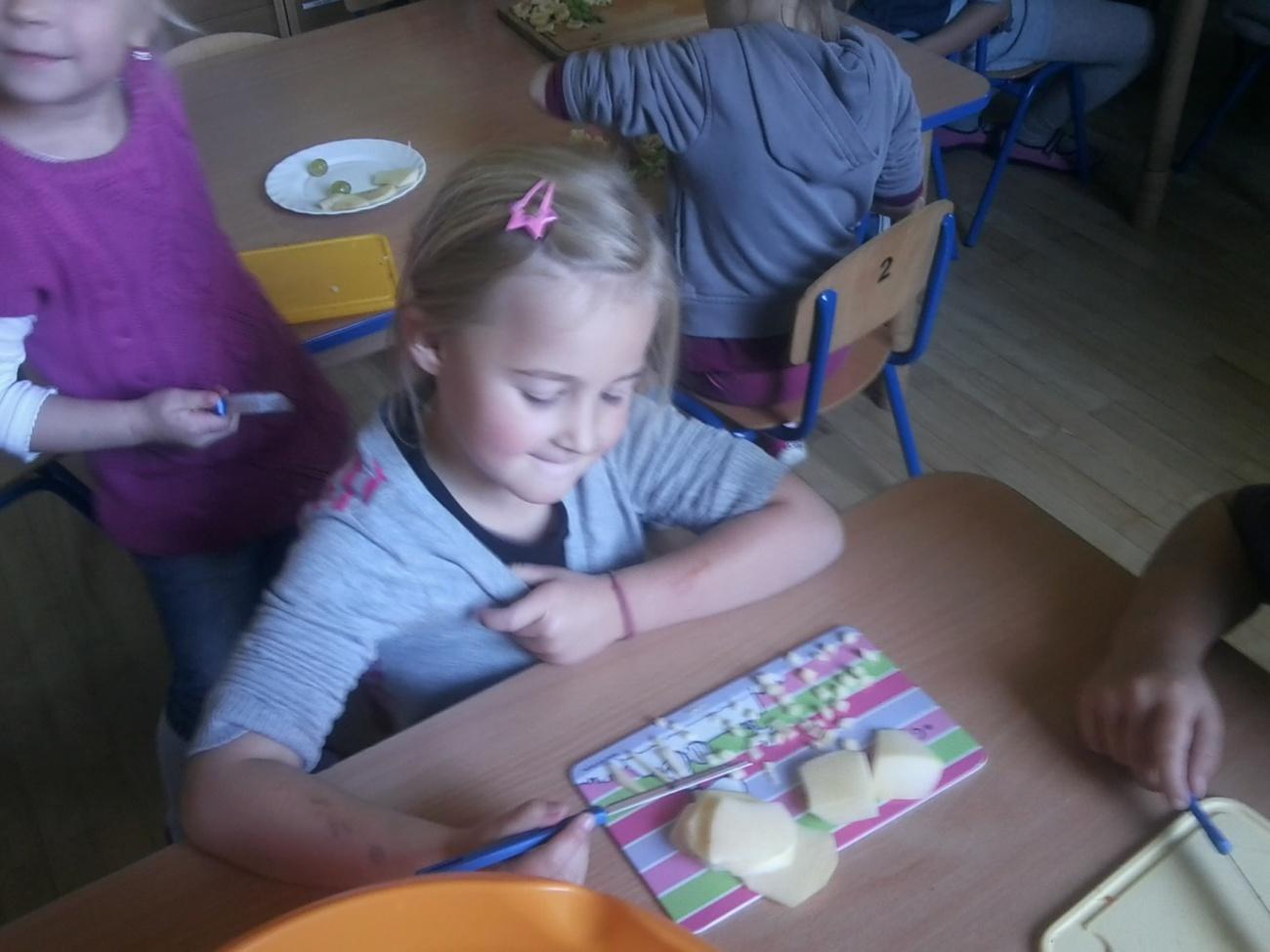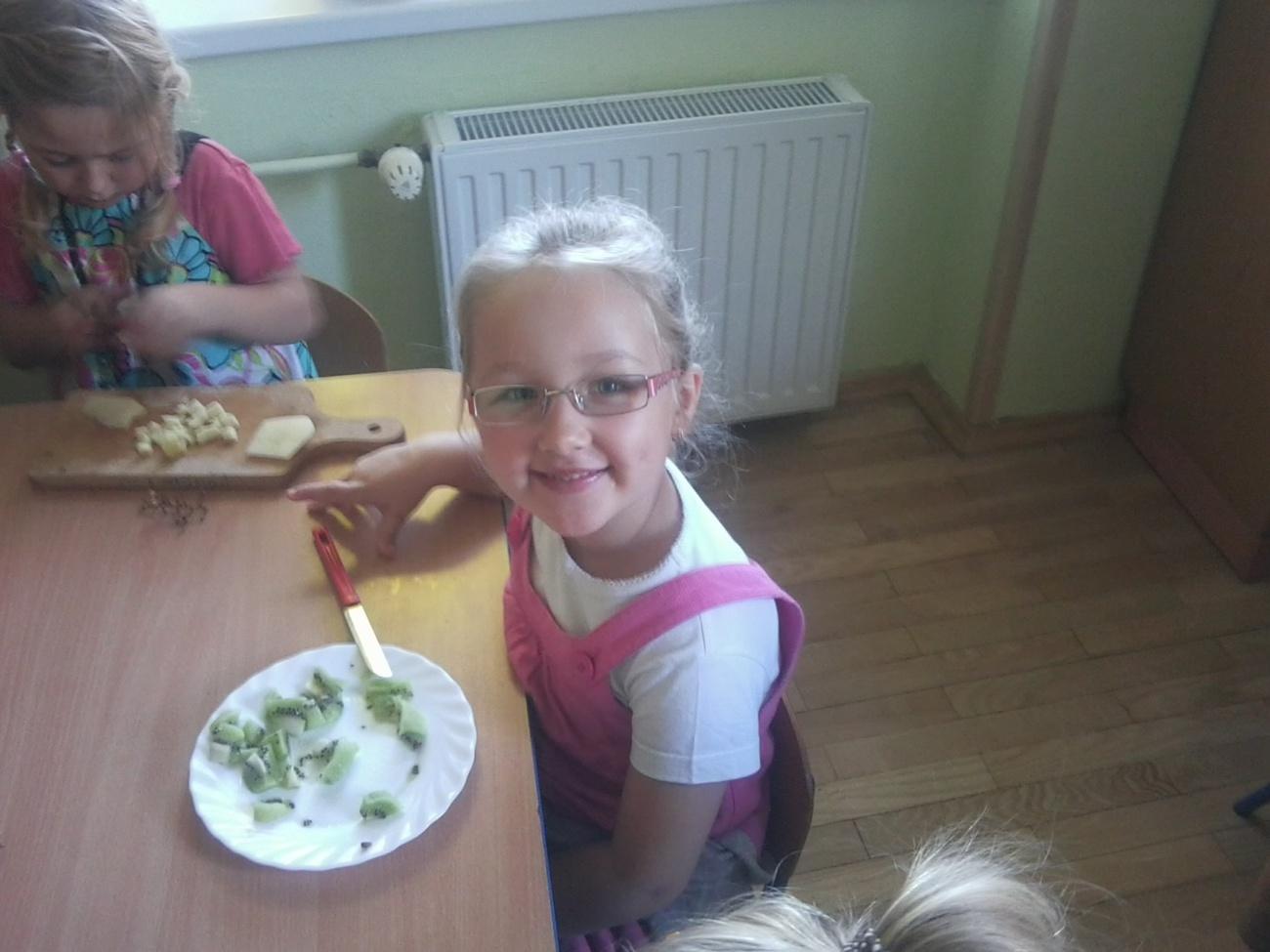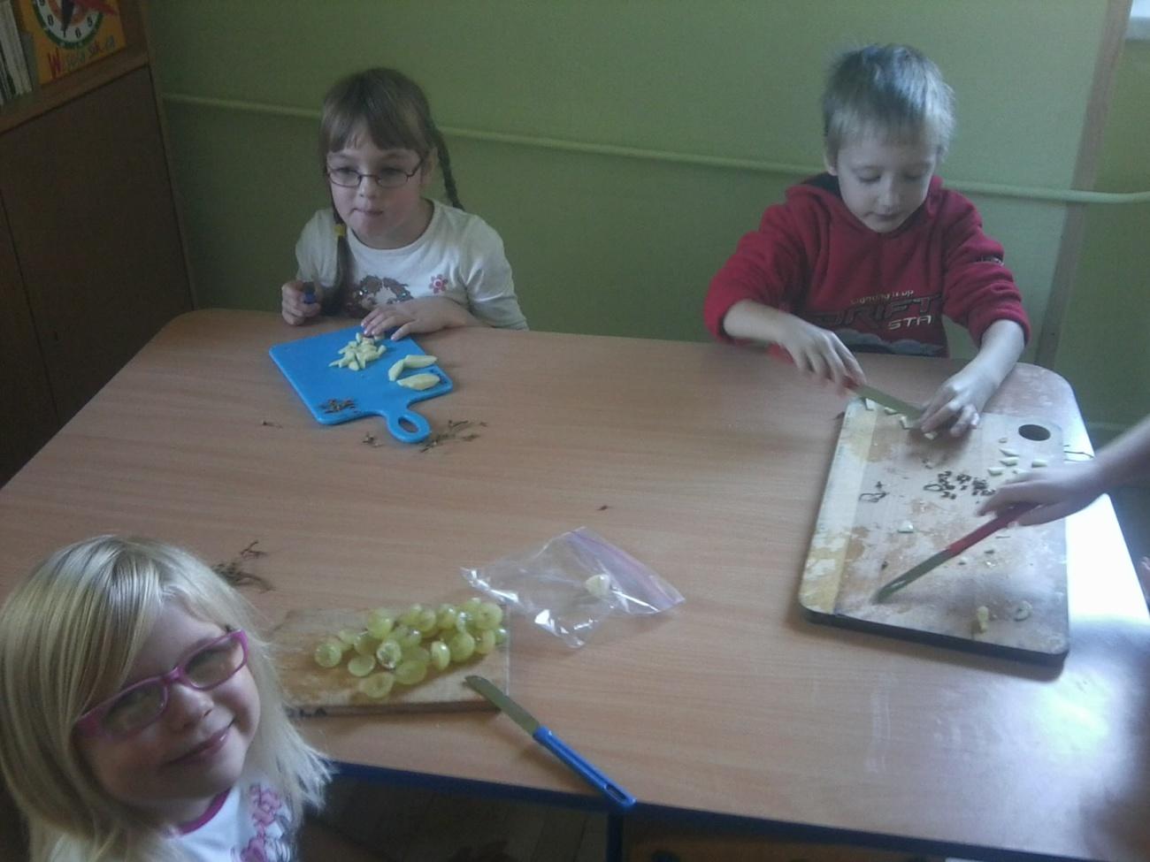 W piątek 19 października starszaki z grupy IV zabawiły się w mistrzów kuchni. W naszej sali urządziliśmy małe kuchcikowo i zaczęliśmy przygotowywać pyszną i przede wszystkim zdrową sałatkę owocową. Z przyniesionych owoców wśród których nie zabrakło jabłek, gruszek, kiwi, winogron i bananów stworzyliśmy wspaniałą witaminową kompozycję. Przed przystąpieniem do pracy, wszyscy dokładnie umyliśmy ręce i ochoczo zabraliśmy się do krojenia owoców. Każdy z nas pamiętał o zachowaniu zasad bezpieczeństwa, gdyż w końcu pracowaliśmy z nożami. Po pokrojeniu wszystkich składników, wymieszaliśmy je z jogurtem naturalnym by wszystko razem pięknie się połączyło i na koniec została nam najmilsza czynność – degustacja. Niektórzy z nas mieli cierpkie miny na widok owoców ale każdy pamiętał o tym jak wiele witamin w sobie zawiera tak aporcja sałatki. Teraz każdy z nas zastanawia się co znów możemy wspólnie przyrządzić.