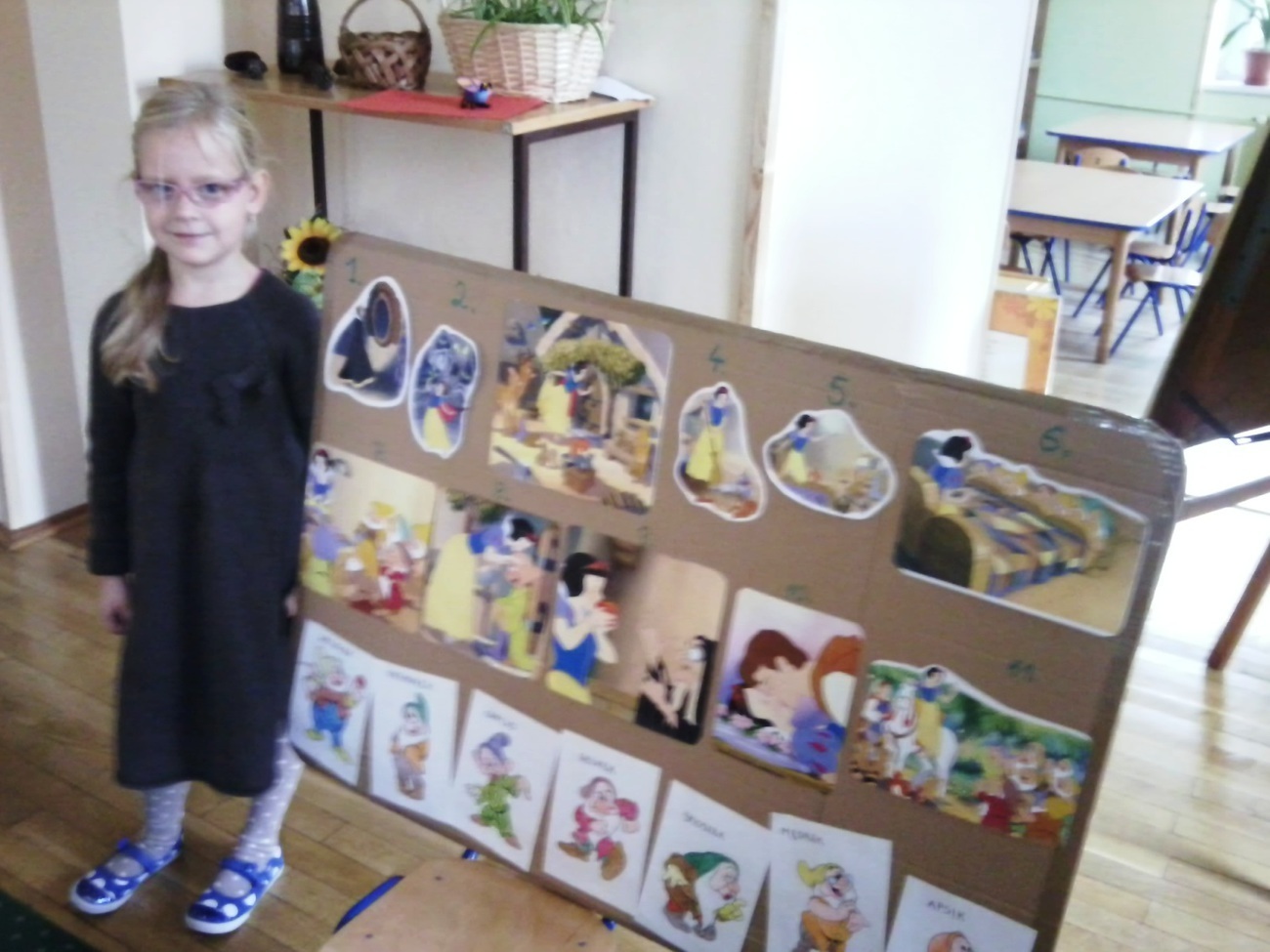 Jako pierwsza wystąpiła Bianka, ze znaną nam wszystkim bajką o Królewnie Śnieżce i siedmiu krasnoludkach. Wszyscy chętnie wysłuchali prezentacji koleżanki i na koniec każdy próbował zapamiętać imiona wszystkich krasnoludków: Mędrek, Gburek, Apsik...
