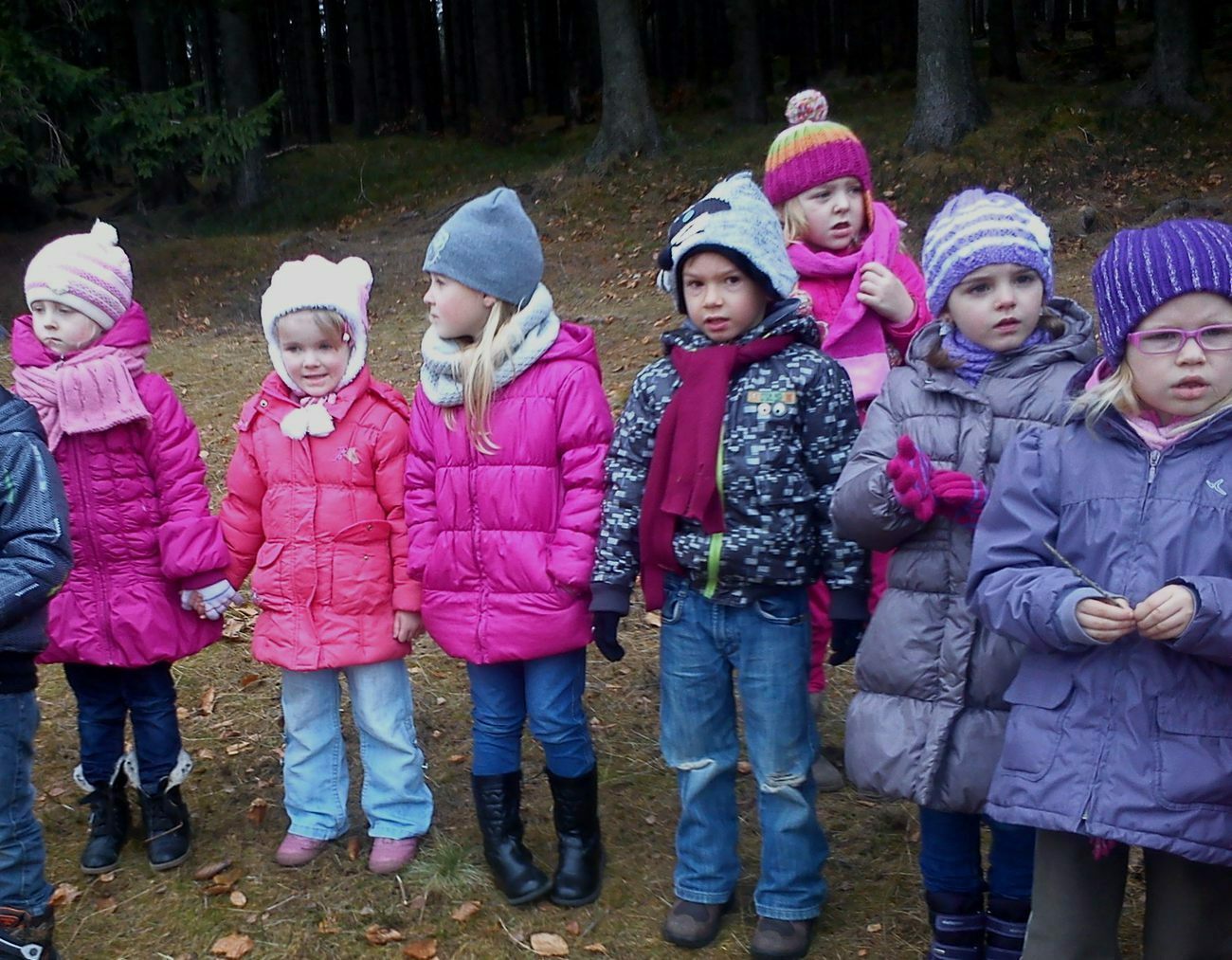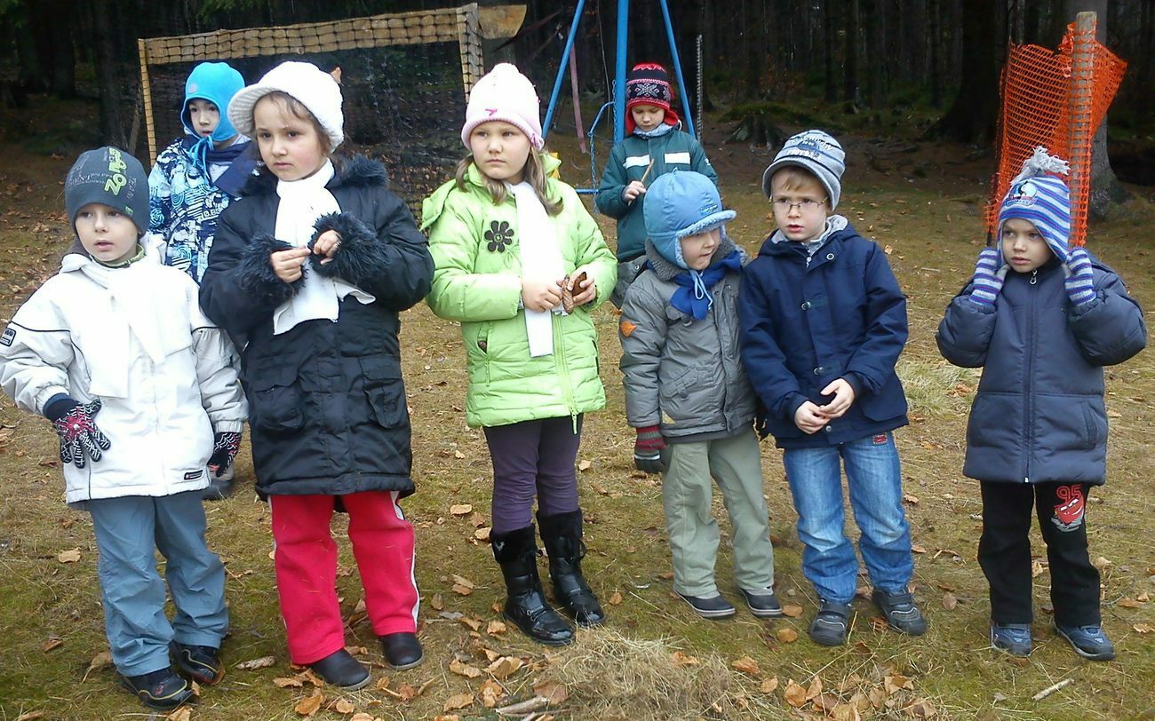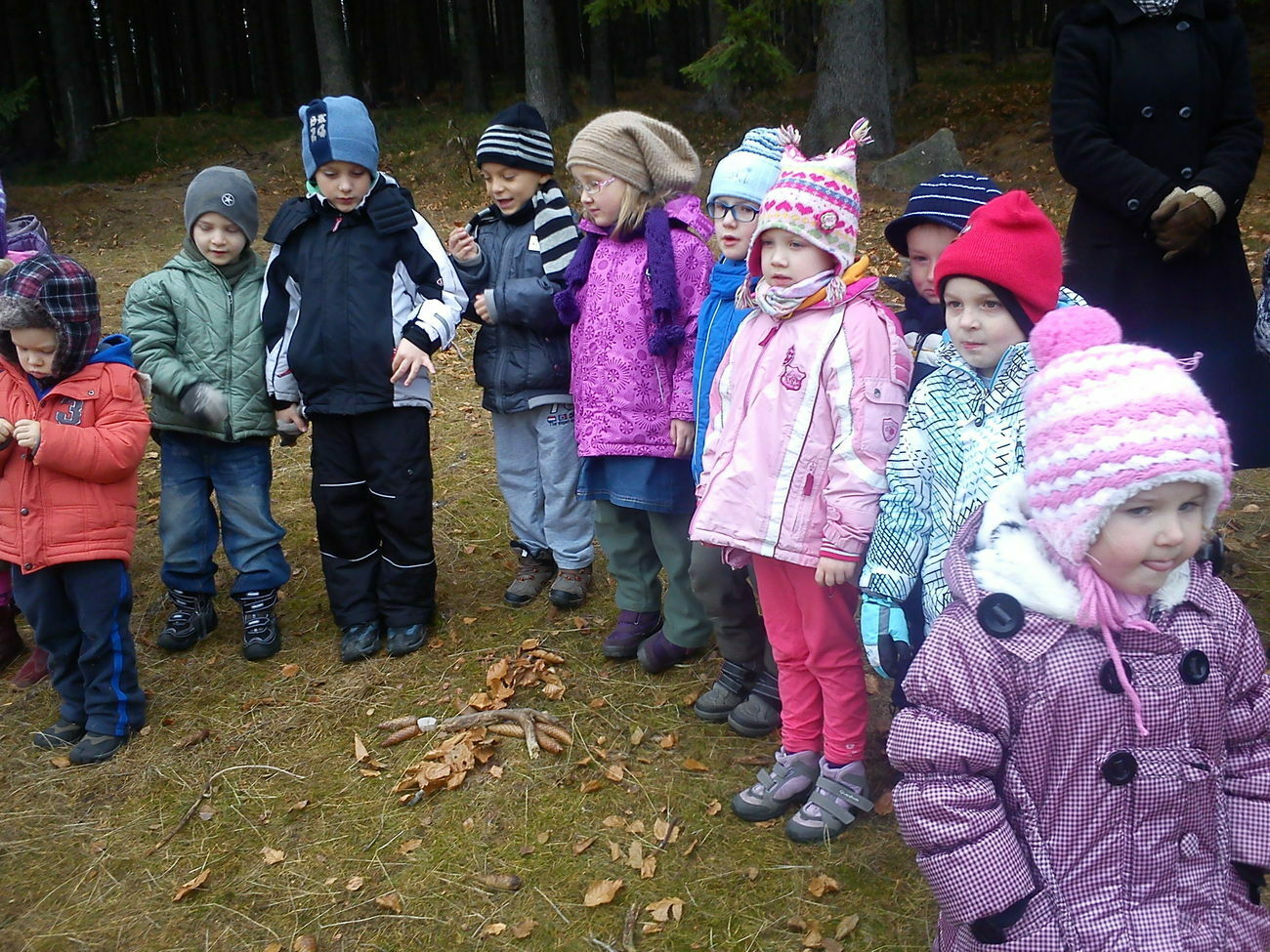 Następnie na dużej leśnej polanie dostaliśmy do wykonania specjalne zadanie. Podzieleni na cztery grupy, mieliśmy stworzyć z dostępnych materiałów: szyszek, liści, patyków i kory – obrazki przedstawiające: kwiat, motyla, ptaka i lisa. Gdy skończyliśmy wspólną pracę, okazało się, że zwierzęta te tworzą prosty łańcuch pokarmowy. Pani Ela wyjaśniła nam, co może zdarzyć się, gdy jedno z tych ogniw zniknie.