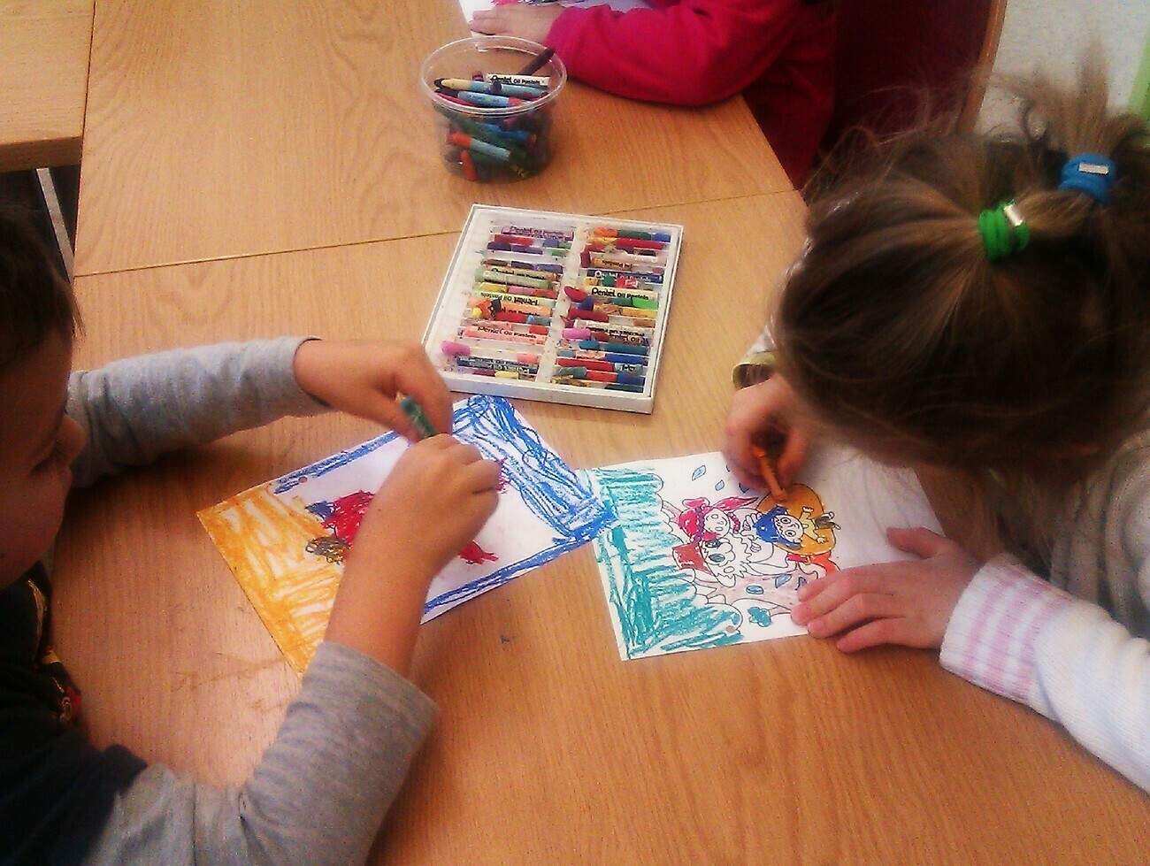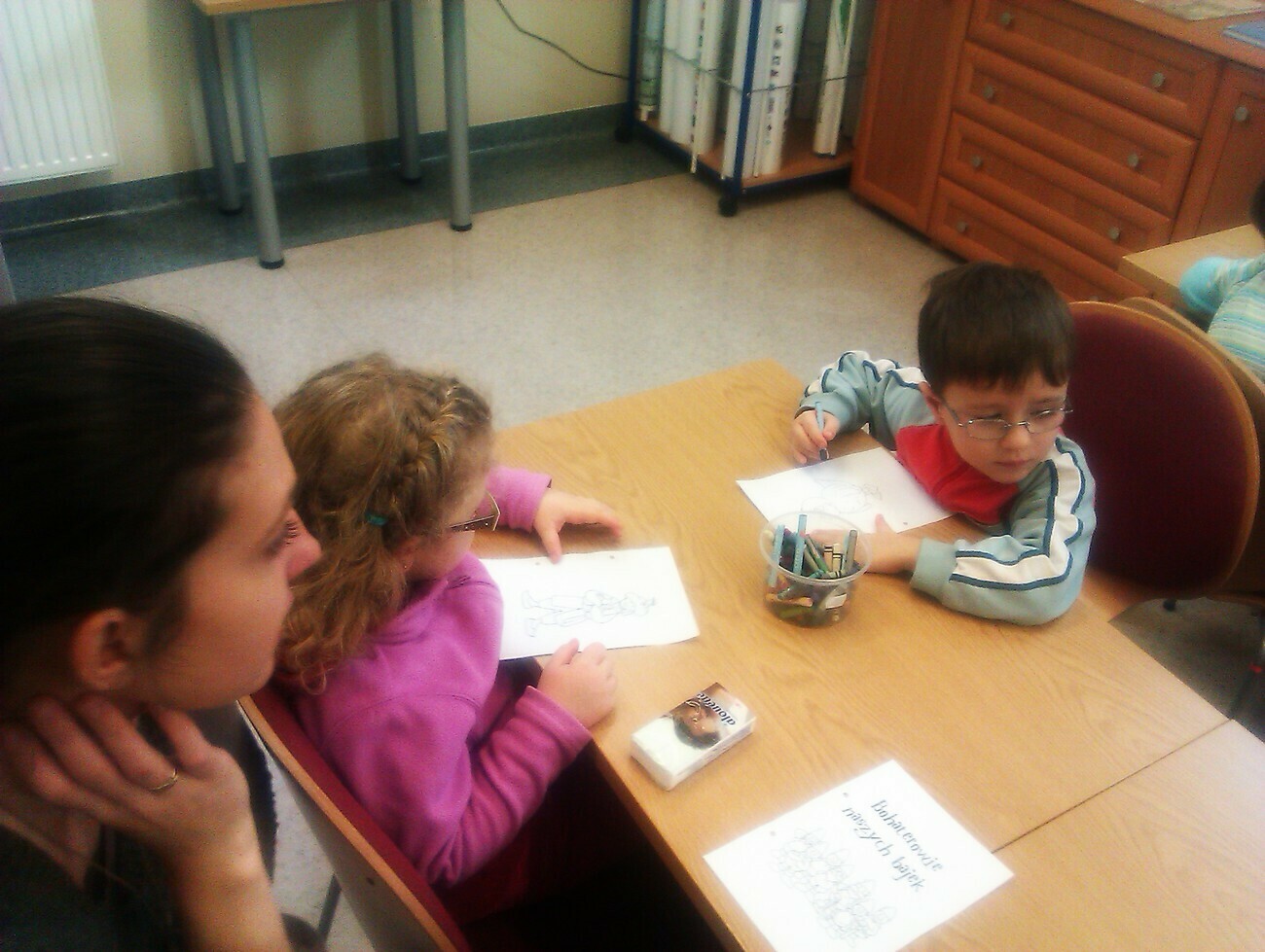 Później sami staliśmy się twórcami. Każdy otrzymał kolorowankę z zagadką. Odpowiedzi wskazywały kolejne strony. Następnie pani bibliotekarka sczepiła nam wszystkie kartki w naszej książeczce.