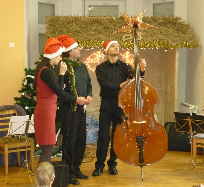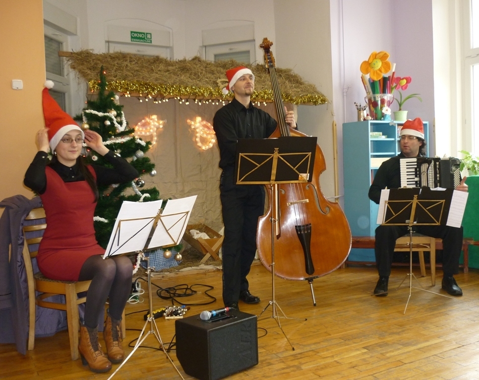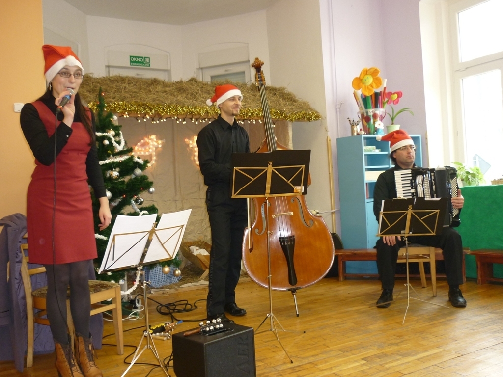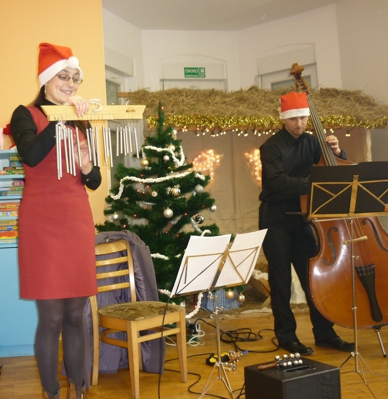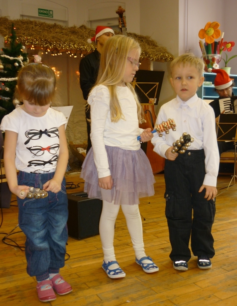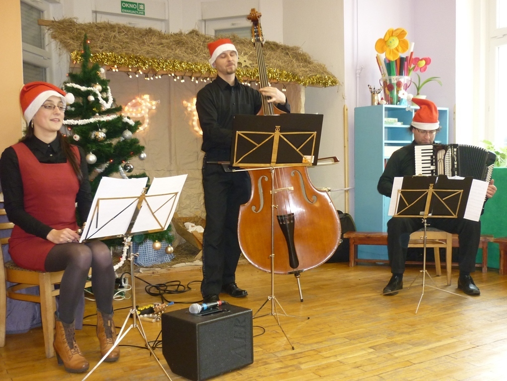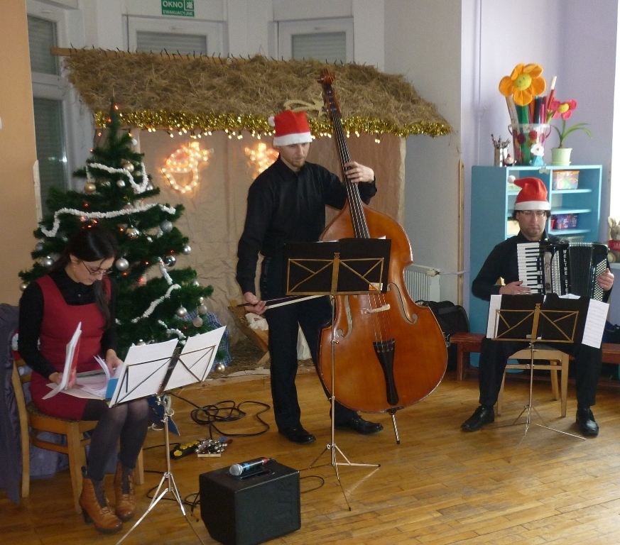 Z panią Dominiką oraz resztą muzyków przy akompaniamencie kontrabasu i akordeonu śpiewaliśmy kolędy. Poznaliśmy także nowy instrument: janczary. Niektóre z dzieci mogły na nich zagrać. Po koncercie udaliśmy się wszyscy na wigilijny obiad.