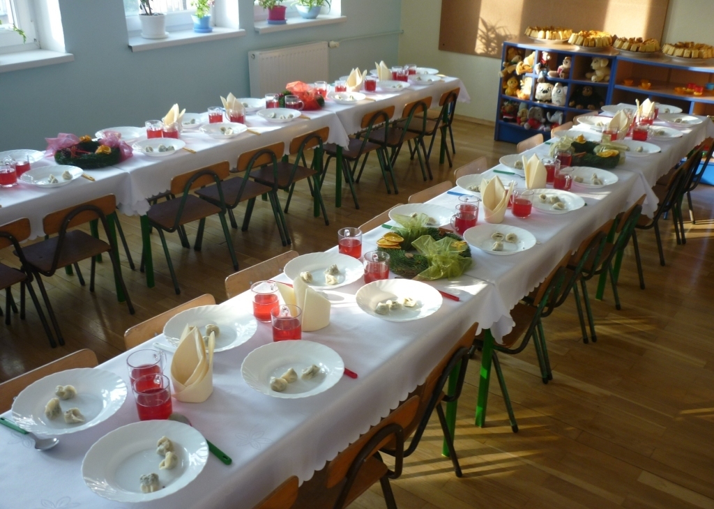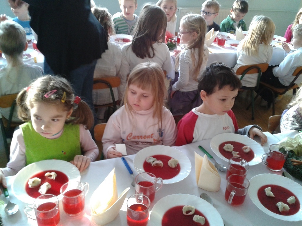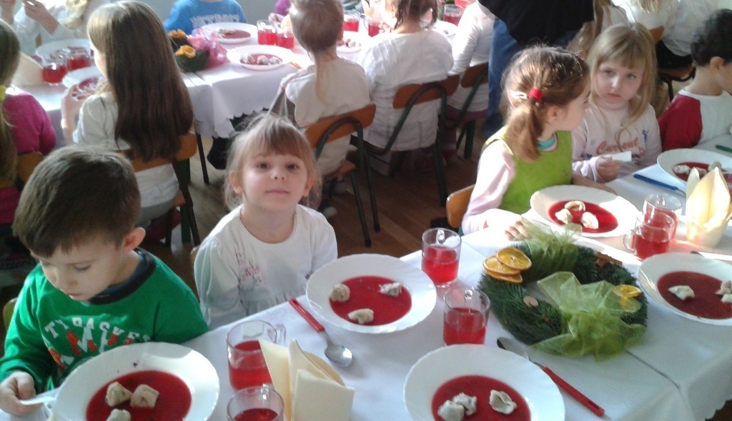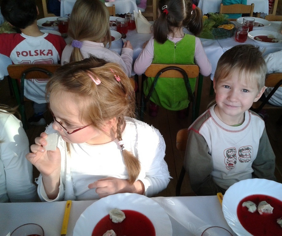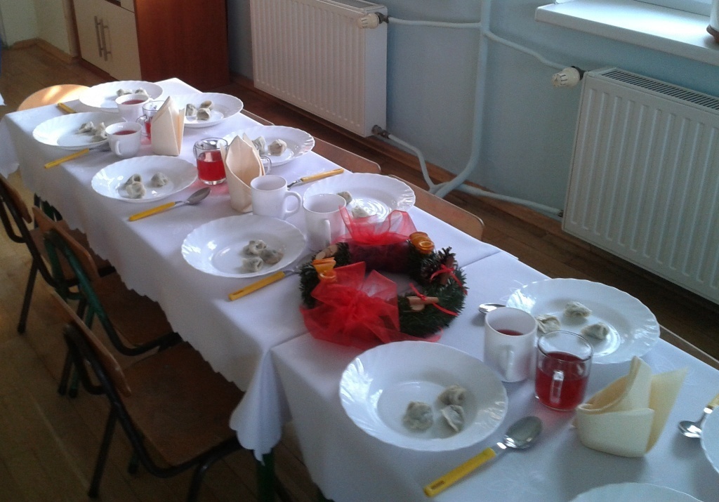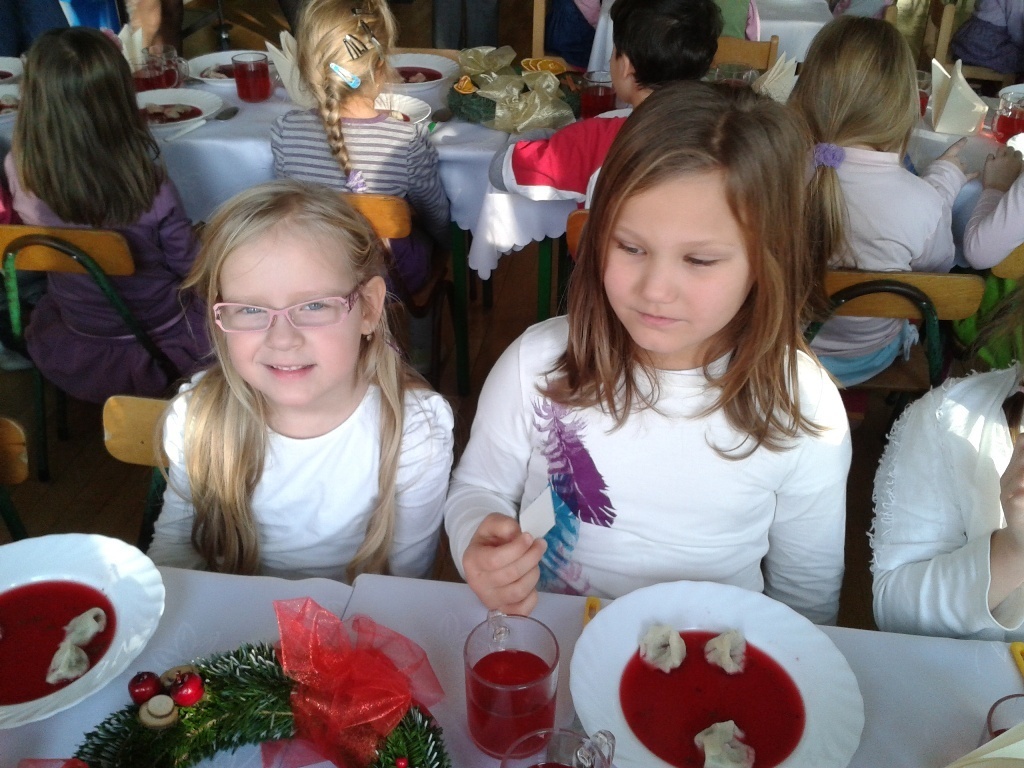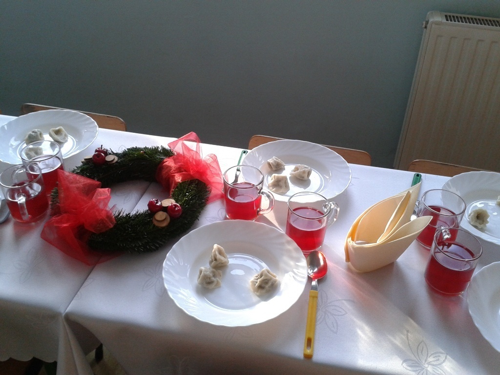 Sala została wcześniej przepięknie przygotowana (na stolikach leżały białe obrusy, a na nich świąteczne stroiki). Obiad rozpoczął się złożeniem życzeń i dzieleniem się opłatkiem oraz odśpiewaniem znanych nam kolęd.