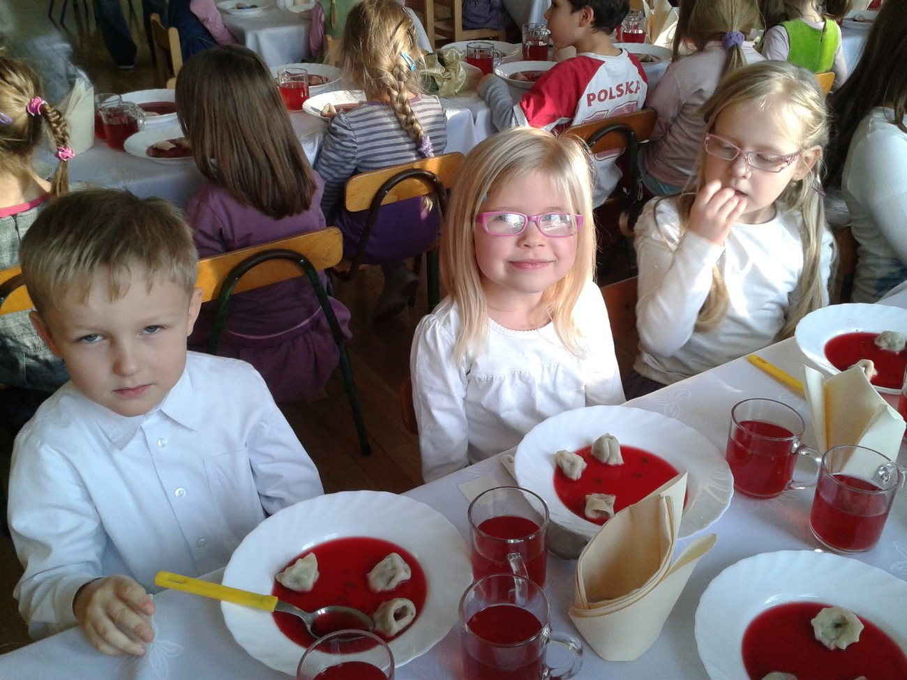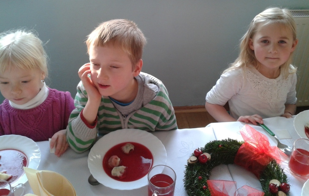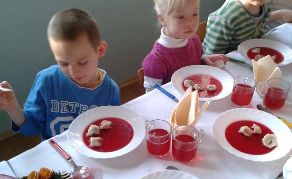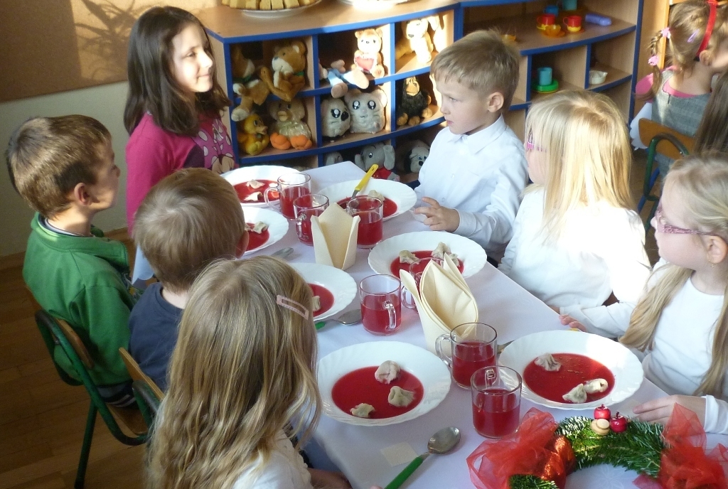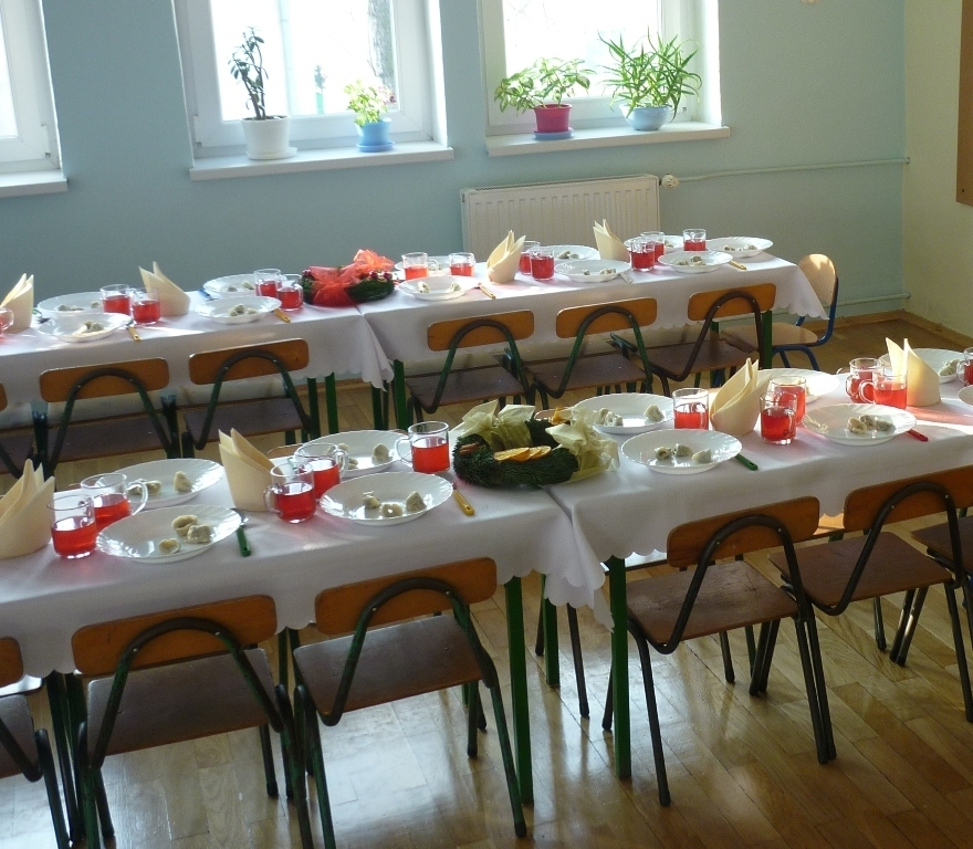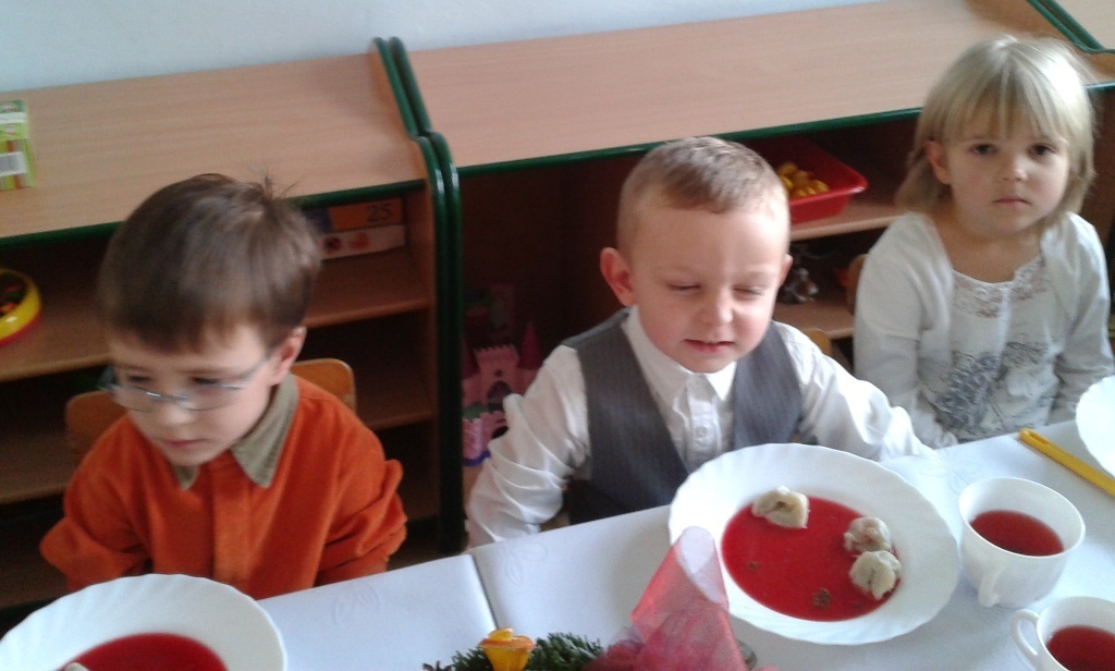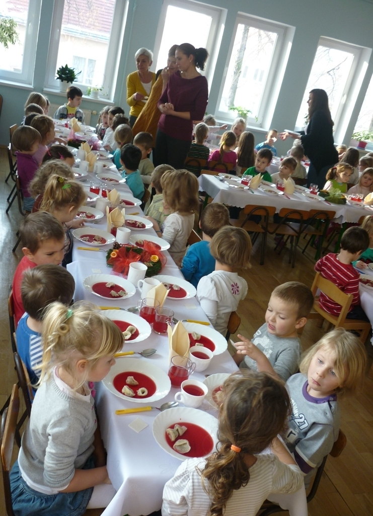 Sala została wcześniej przepięknie przygotowana (na stolikach leżały białe obrusy, a na nich świąteczne stroiki). Obiad rozpoczął się złożeniem życzeń i dzieleniem się opłatkiem oraz odśpiewaniem znanych nam kolęd.