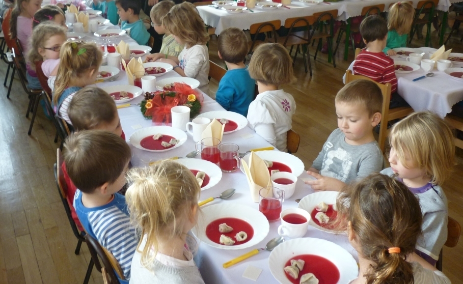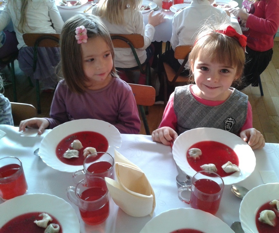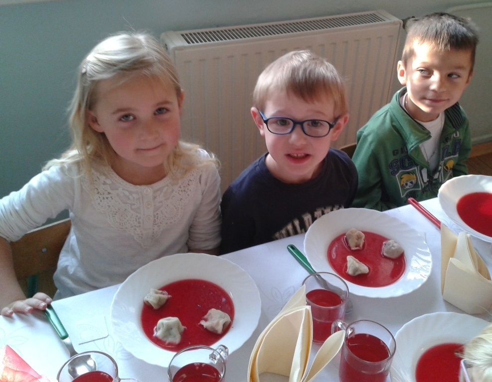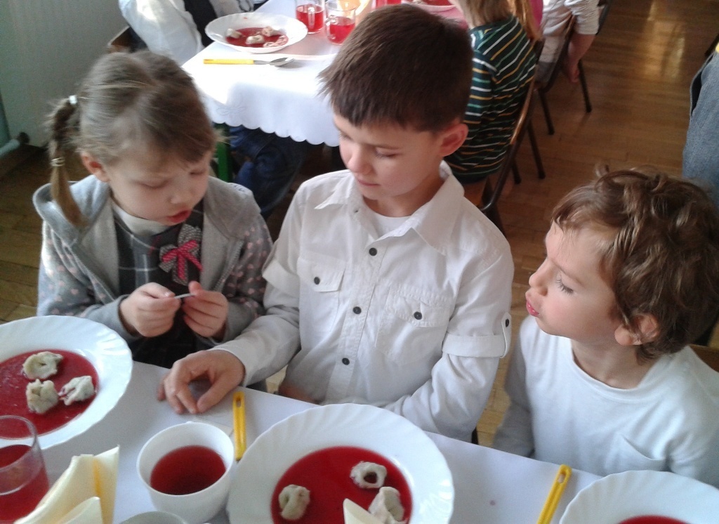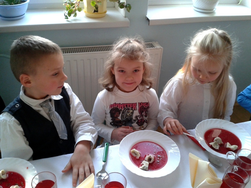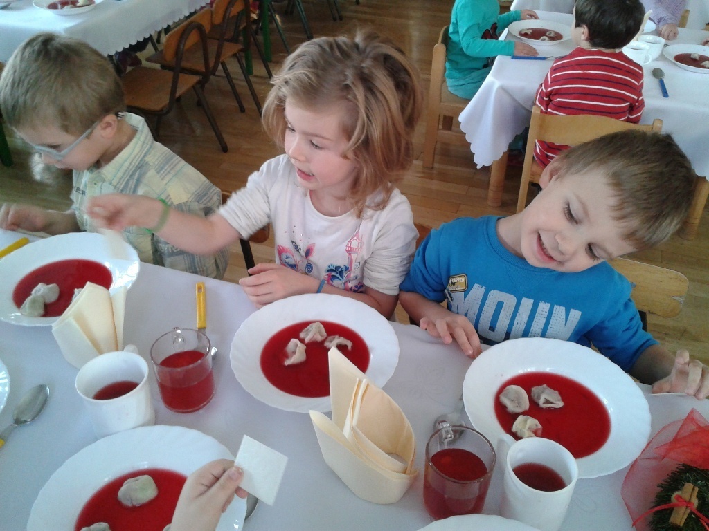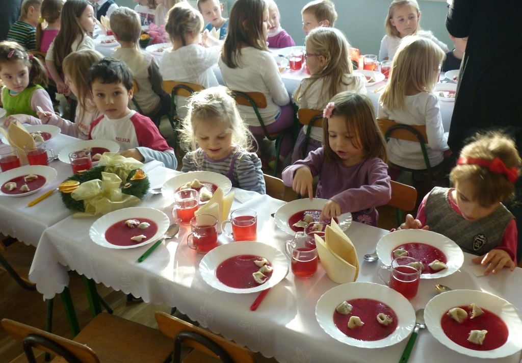 Sala została wcześniej przepięknie przygotowana (na stolikach leżały białe obrusy, a na nich świąteczne stroiki). Obiad rozpoczął się złożeniem życzeń i dzieleniem się opłatkiem oraz odśpiewaniem znanych nam kolęd.