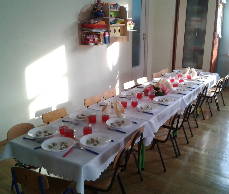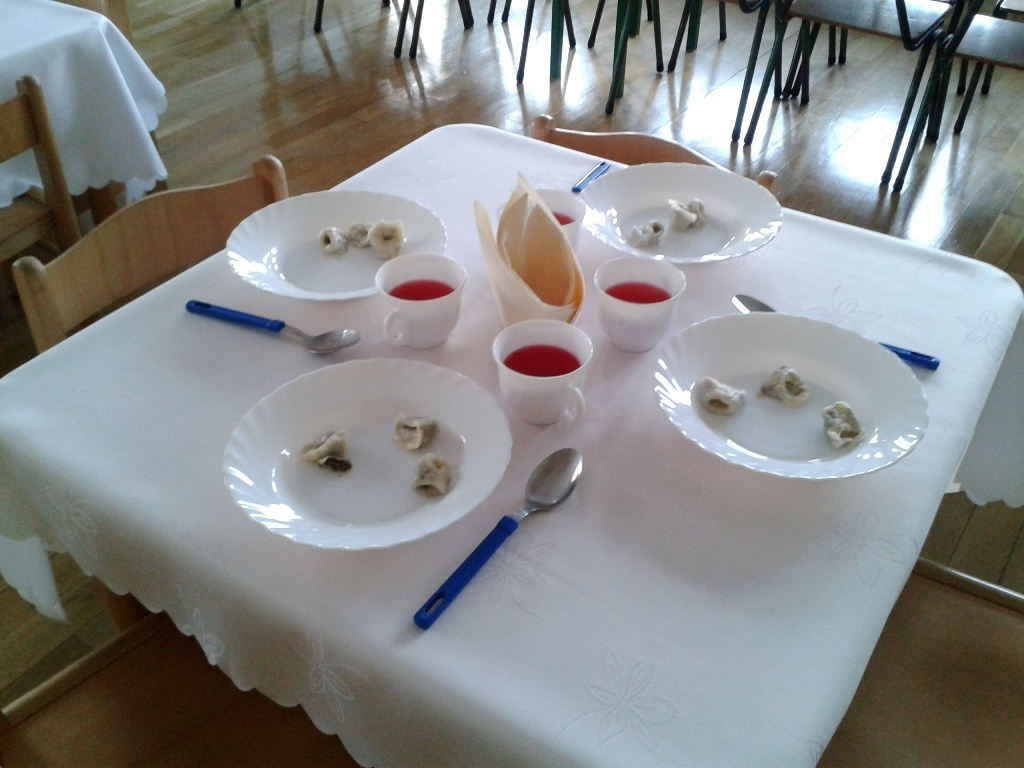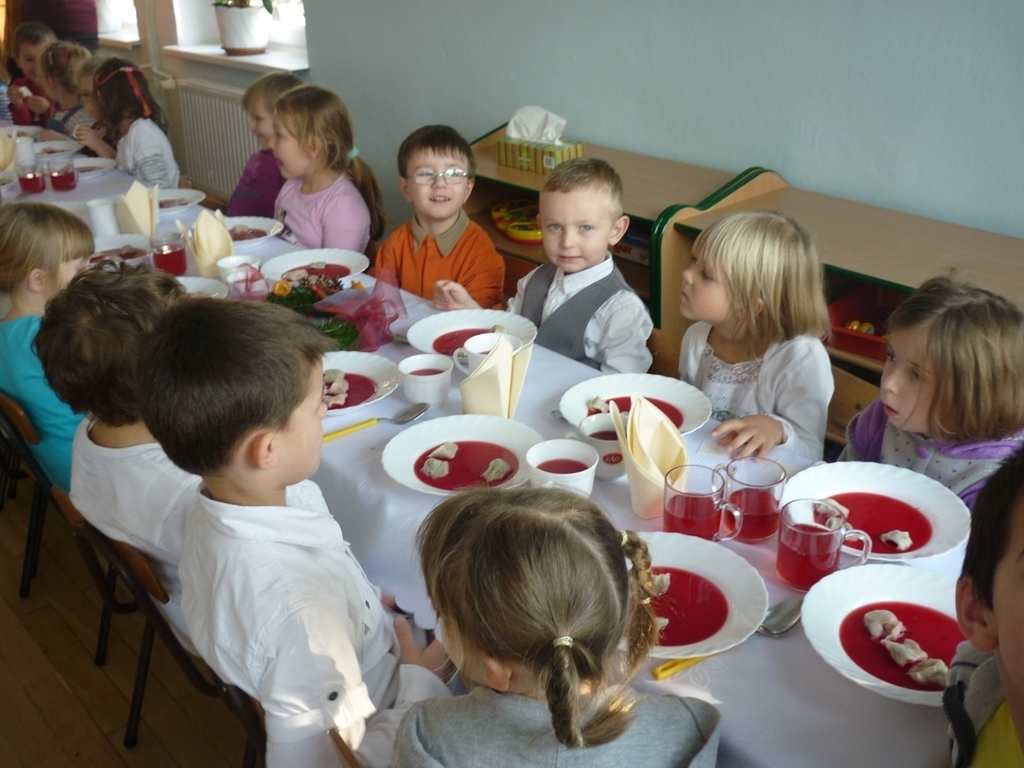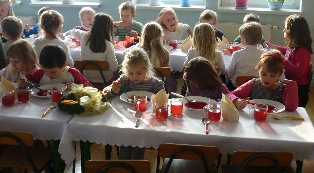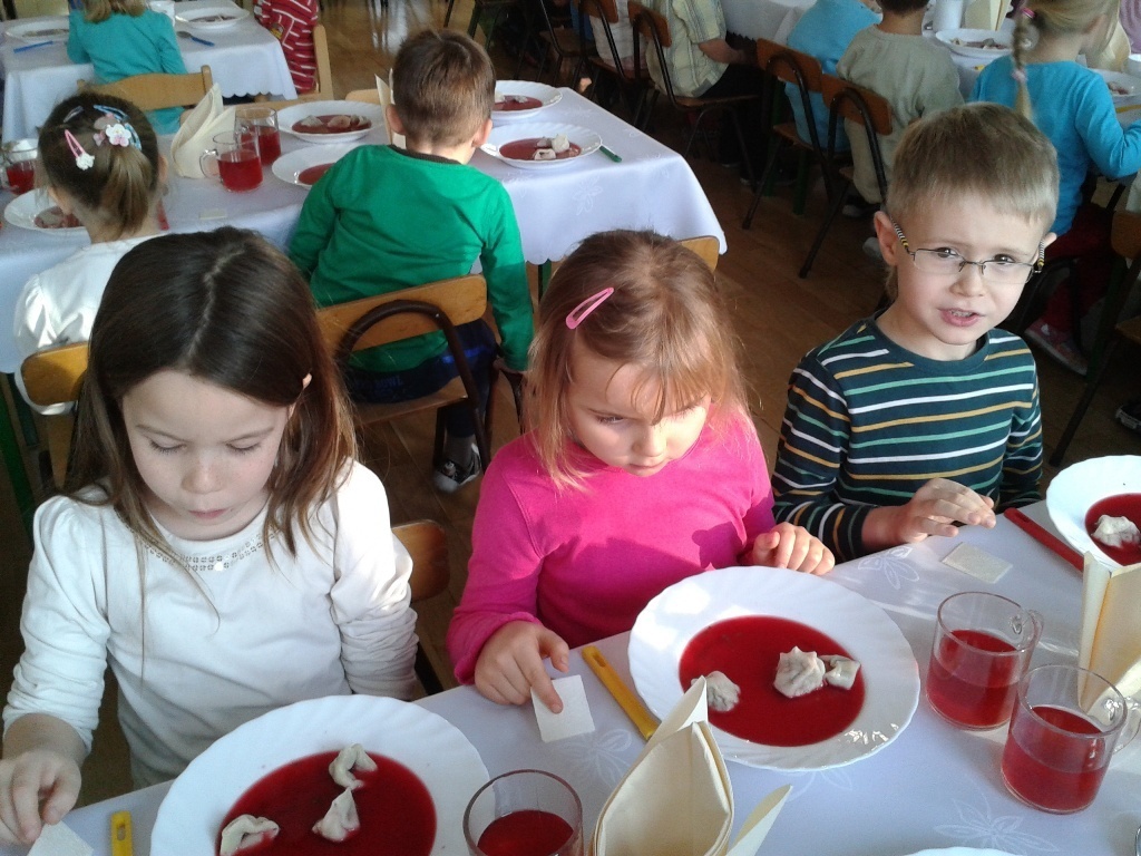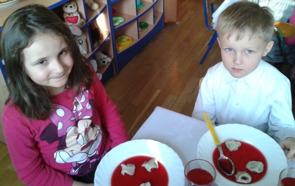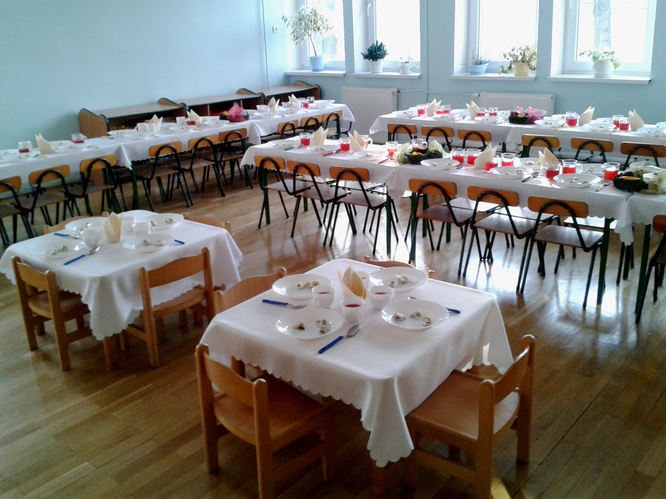 Sala została wcześniej przepięknie przygotowana (na stolikach leżały białe obrusy, a na nich świąteczne stroiki). Obiad rozpoczął się złożeniem życzeń i dzieleniem się opłatkiem oraz odśpiewaniem znanych nam kolęd.
