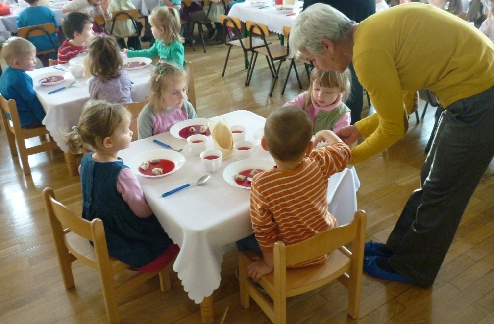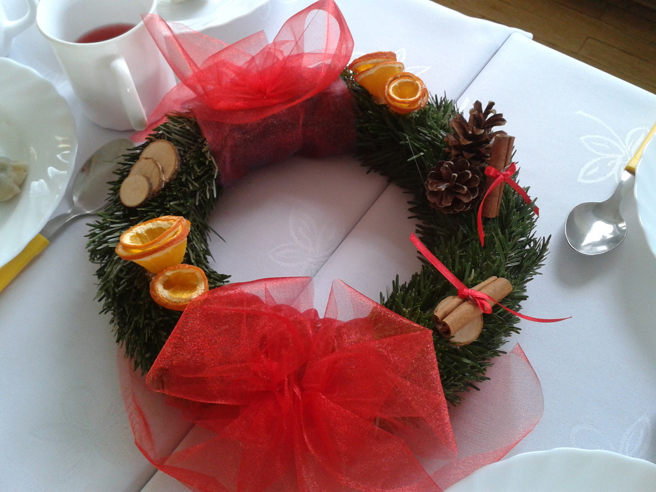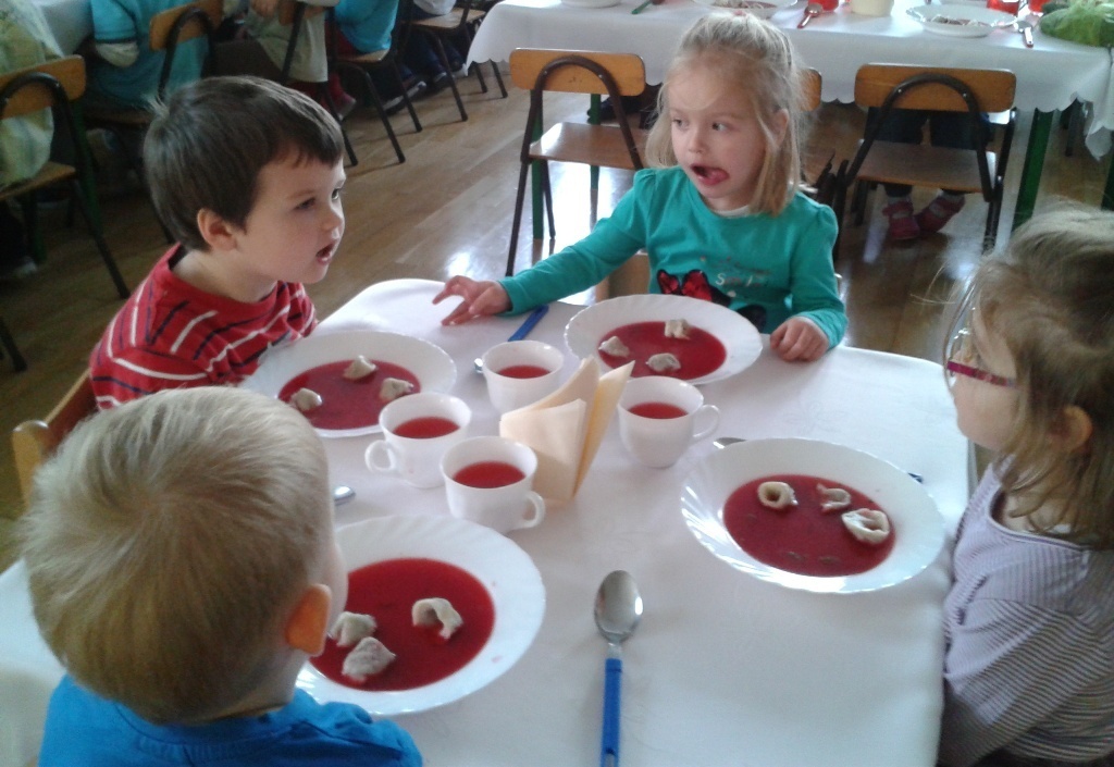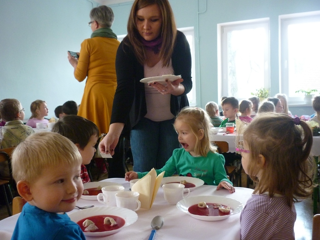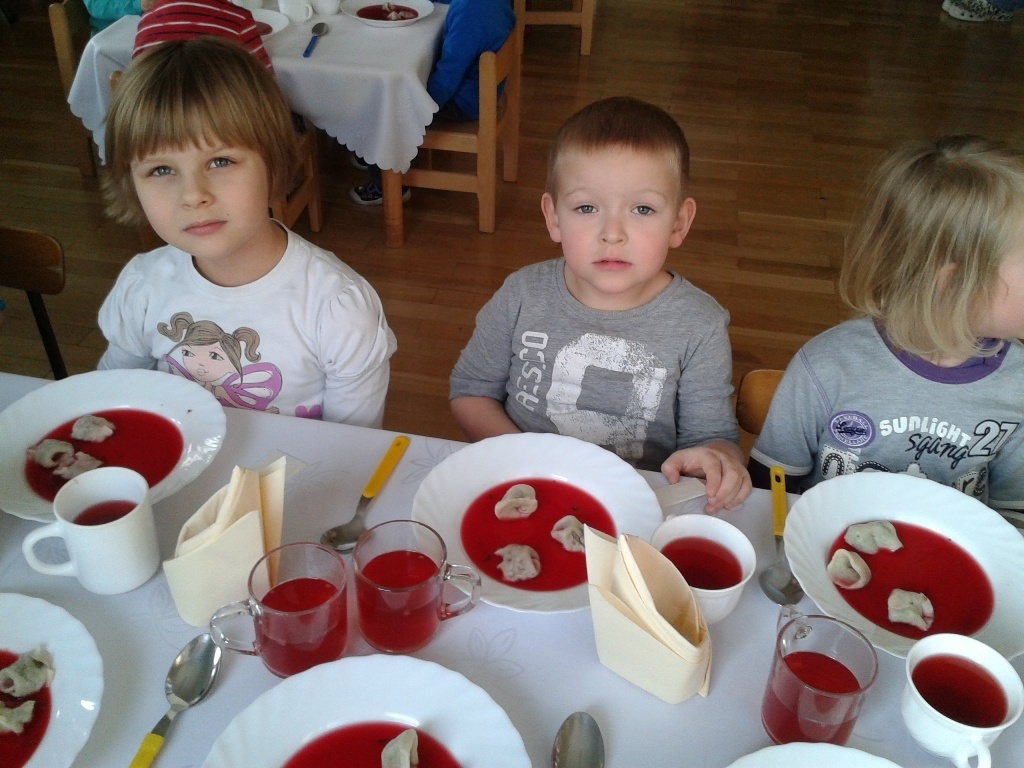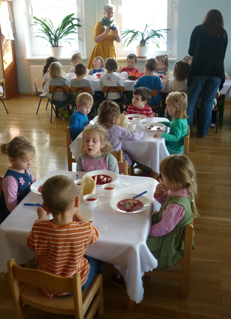 Sala została wcześniej przepięknie przygotowana (na stolikach leżały białe obrusy, a na nich świąteczne stroiki). Obiad rozpoczął się złożeniem życzeń i dzieleniem się opłatkiem oraz odśpiewaniem znanych nam kolęd.