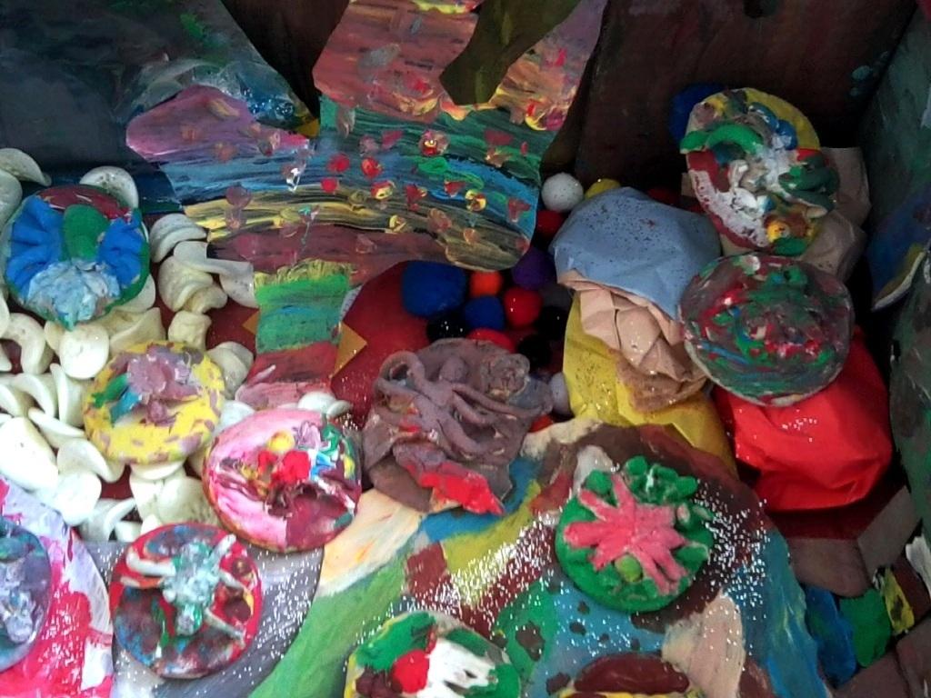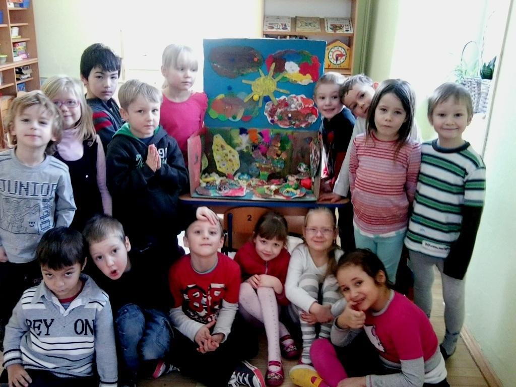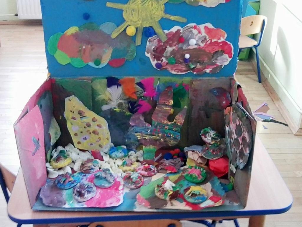 Następnie stworzyliśmy dla naszych „ milusińskich” ich własną planetę, na której spokojnie mogły przebywać. Do stworzenia „ Spiderlandii”- bo tak nazwaliśmy planetę pająków wykorzystaliśmy kartony, farby, klej, kolorowe pompony, papier i kolorową gąbkę a nawet brokat. Tak powstało dość dziwne i niezwykłe miejsce.