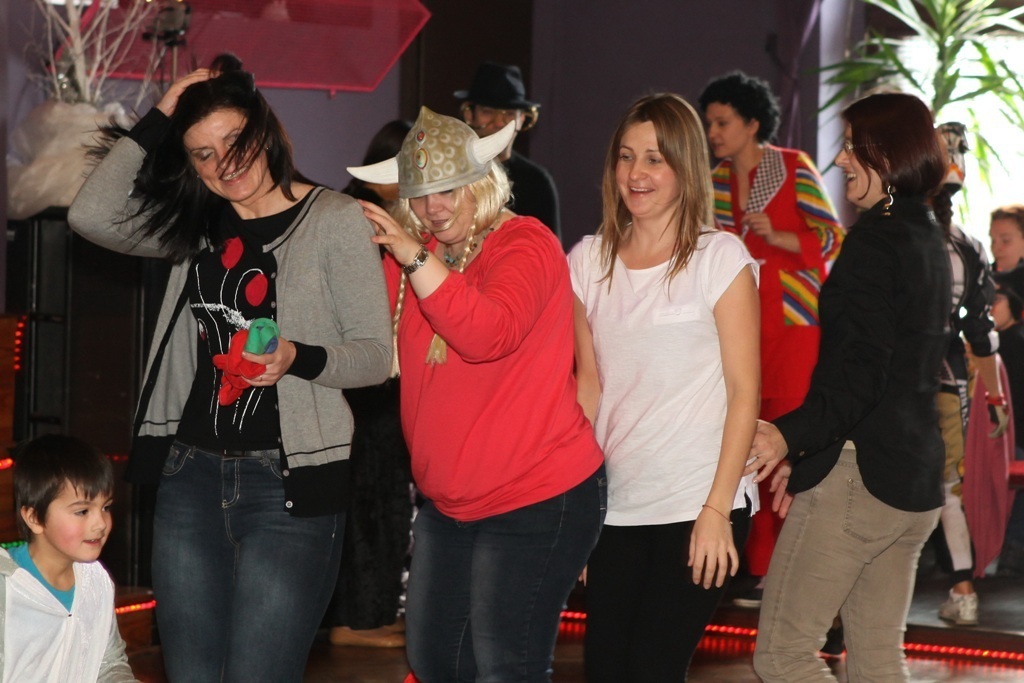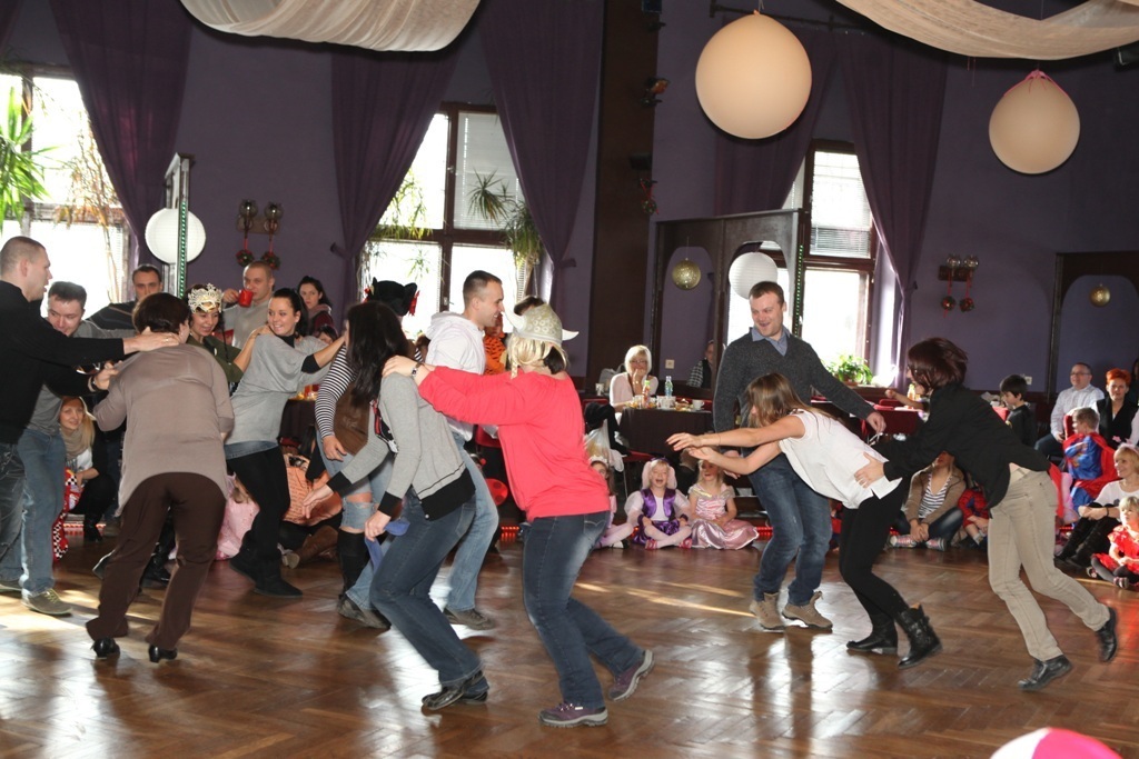 Rozpoczęliśmy tradycyjnym tanecznym korowodem dookoła sali... a później jeden taniec za drugim: stare przeboje i najnowsze hity, piosenki i zabawy przedszkolne, które wszyscy znamy i lubimy. Prowadzący maskaradę pan Piotr nie dał nam odetchnąć ani na moment!