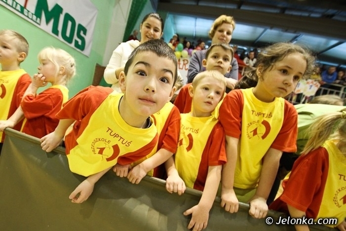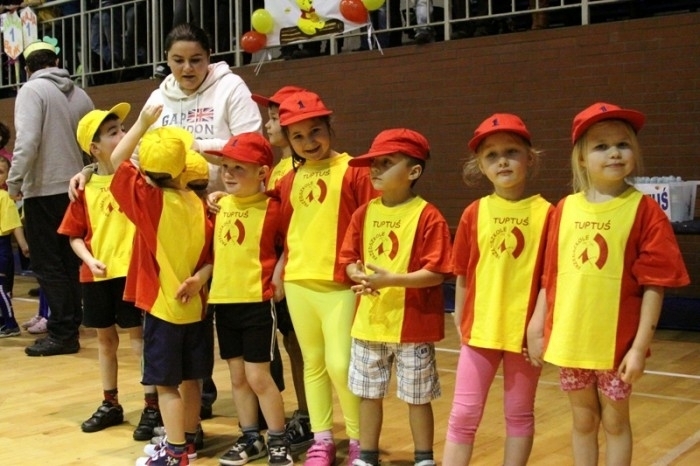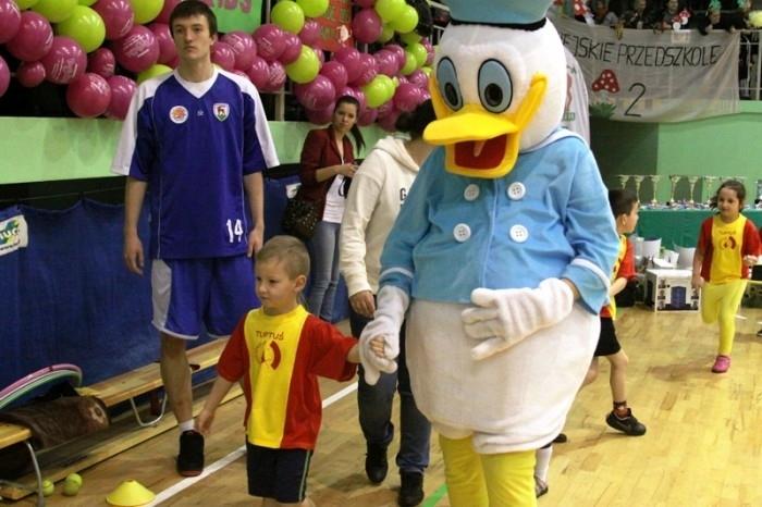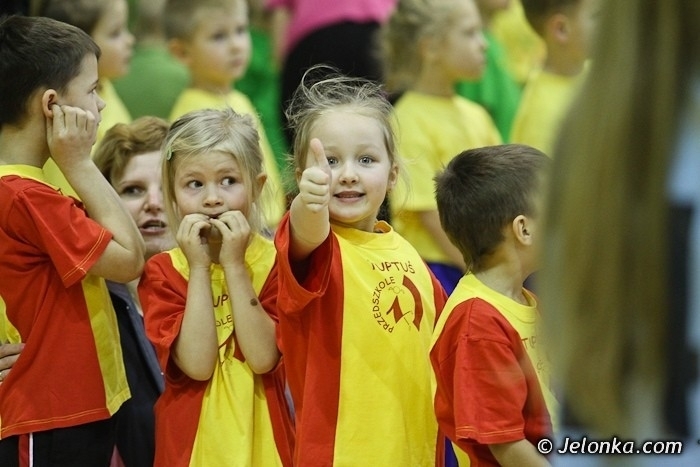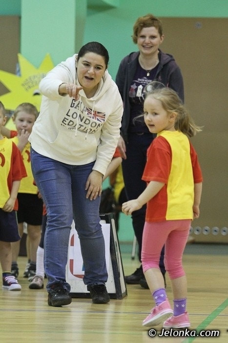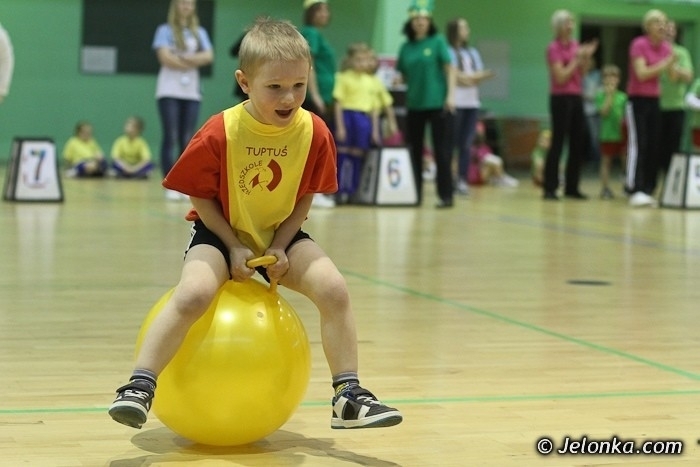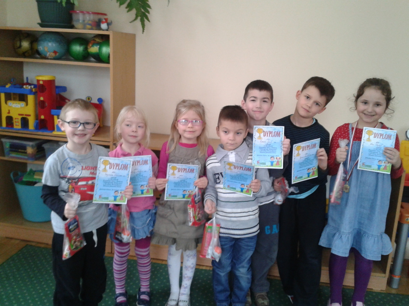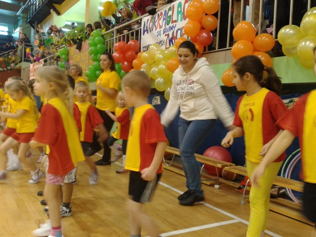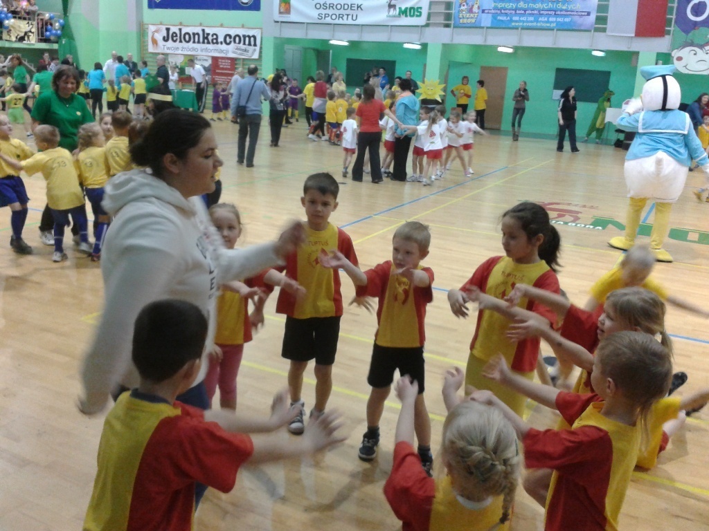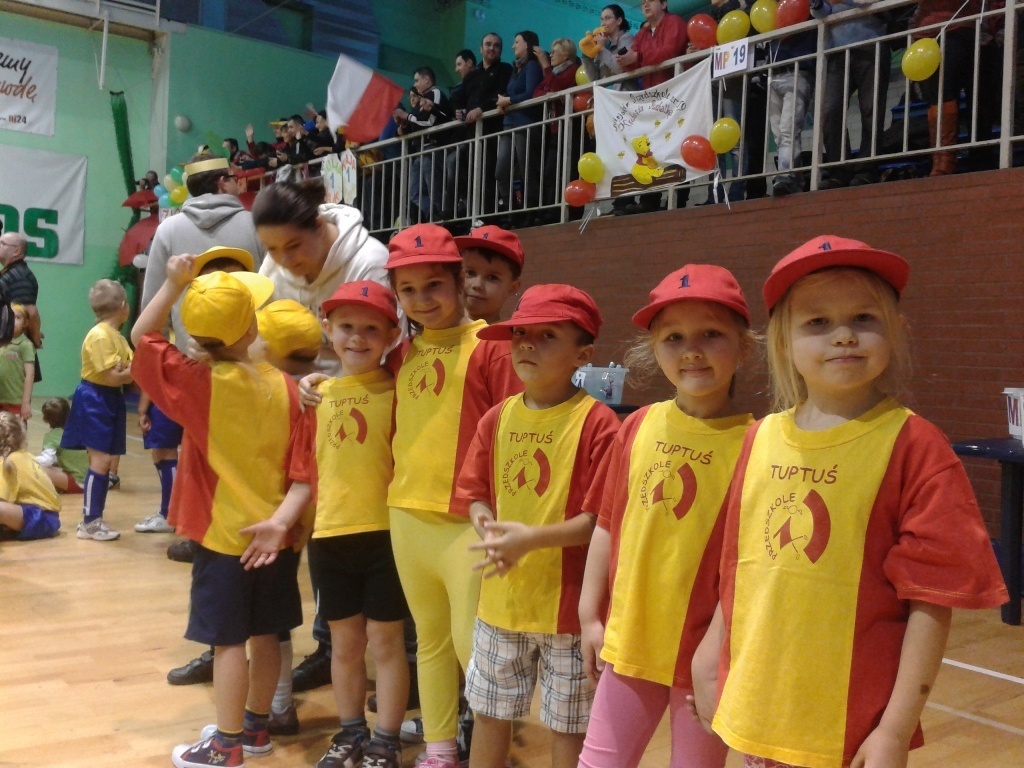 Każdy z nas starał się jak najlepiej wypaść i jak najszybciej wykonać zadania, jednak na uwadze cały czas mieliśmy to, że najważniejsza jest dobra zabawa. Konkurencje były różne, od zbierania i chowania woreczków, po ślizgi na kocach i ławeczce. Bardzo nam pomagał doping kibiców, w tym też oczywiście tych najważniejszych - naszych Rodziców. Całą imprezę towarzyszyły nam również maskotki z bajek, był smok, który się z nami gimnastykował, kaczor Donald i znane nam myszki : Miki i Mini. Po skończonych konkurencjach przyszedł najprzyjemniejszy moment - rozdanie nagród. Kiedy wyczytano nasze przedszkole, dumnie stanęliśmy na podium i z wielką przyjemnością odebraliśmy wspaniały puchar i medale dla każdego z nas. Potem była chwila dla reporterów, bo wszyscy robili nam zdjęcia - jak prawdziwym gwiazdom.
