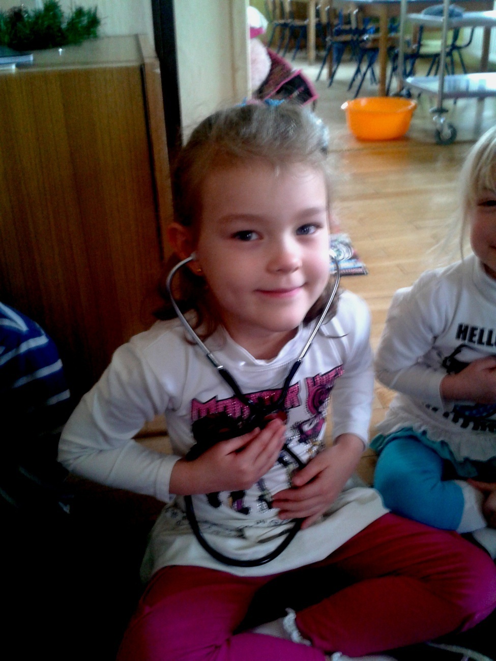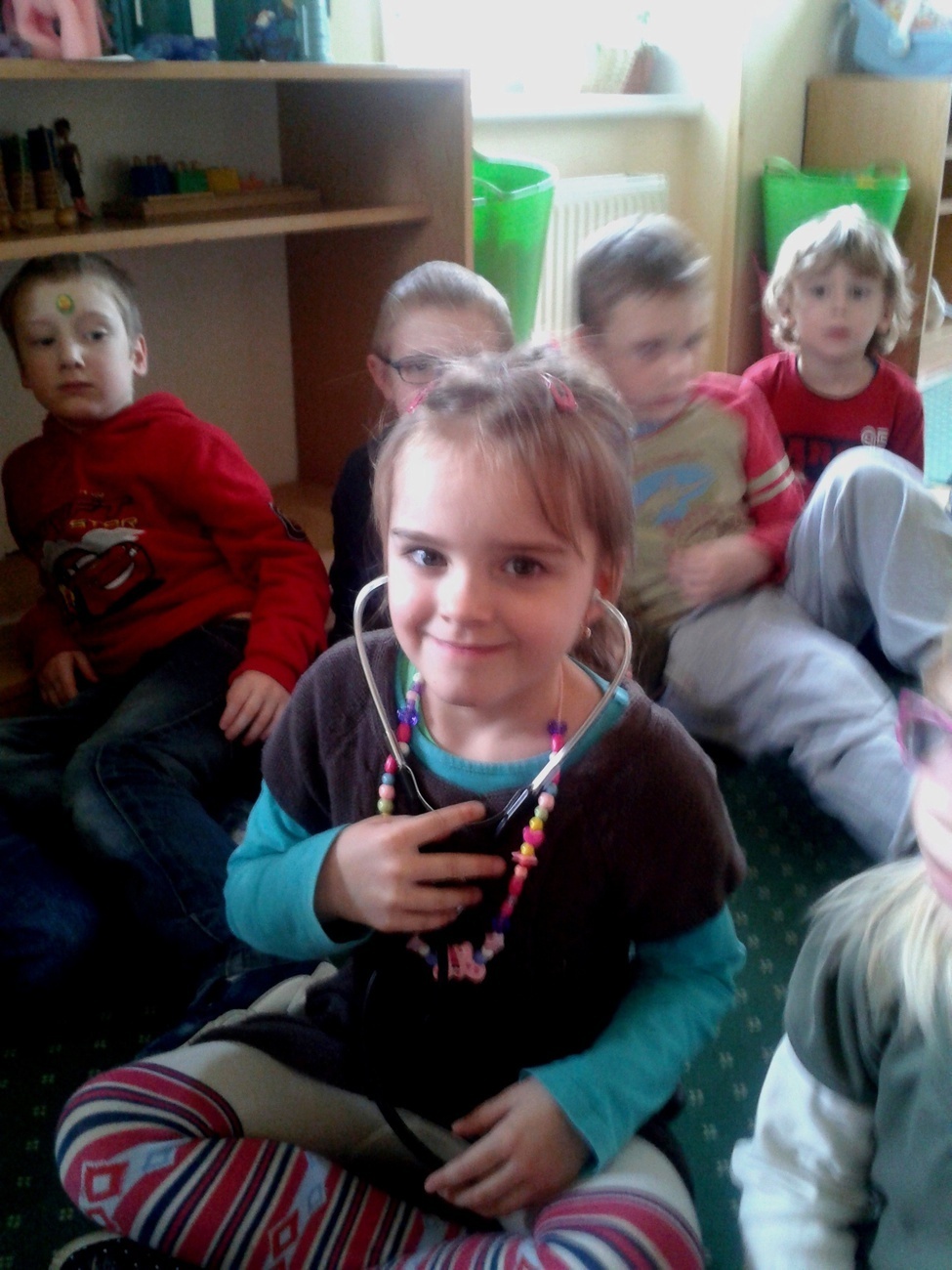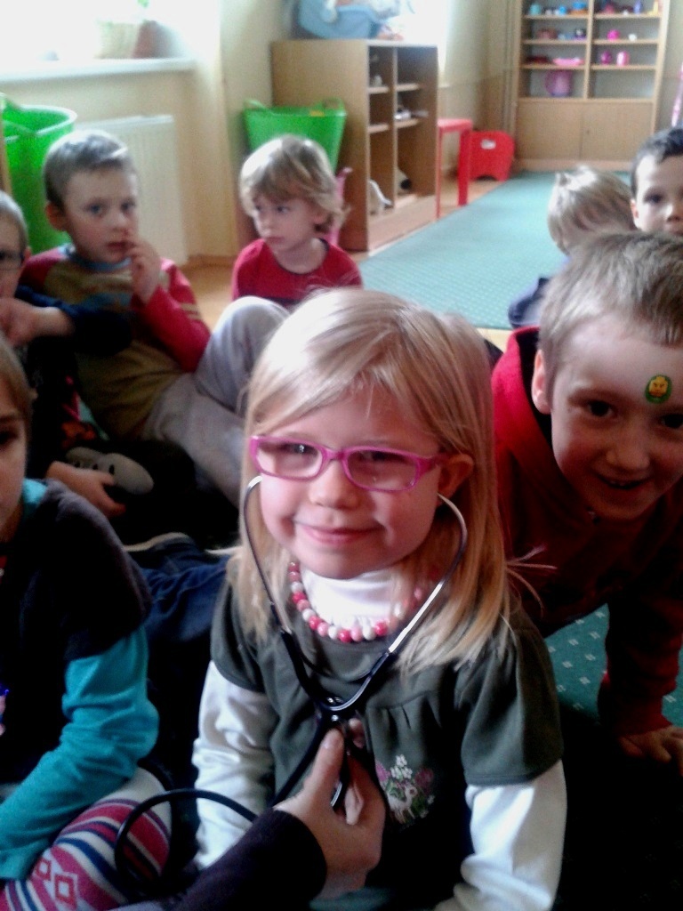 Podczas ferii mieliśmy również okazję posłuchać jak bije nasze serce. Udało nam się to dzięki pomocy stetoskopu. Podczas tego eksperymentu wszyscy musieli być bardzo cicho, żeby każdy mógł wyraźnie usłyszeć rytm własnego serca. Dalsza część ferii upłynęła nam na wspólnej zabawie i integracji z dziećmi z innych grup. Nasze panie obiecały, że to koniec doświadczeń z jajkiem i że następnym razem dowiem się jak bez użycia rąk można wcisnąć jajko do butelki - ale to już chyba jakieś czary.
