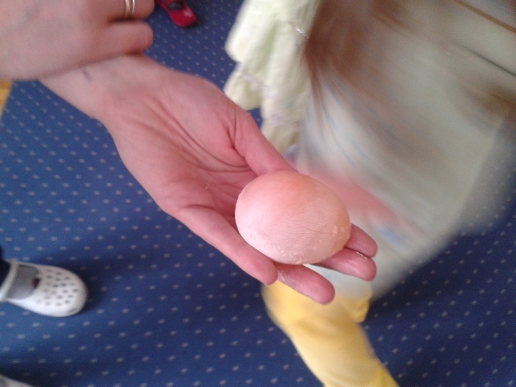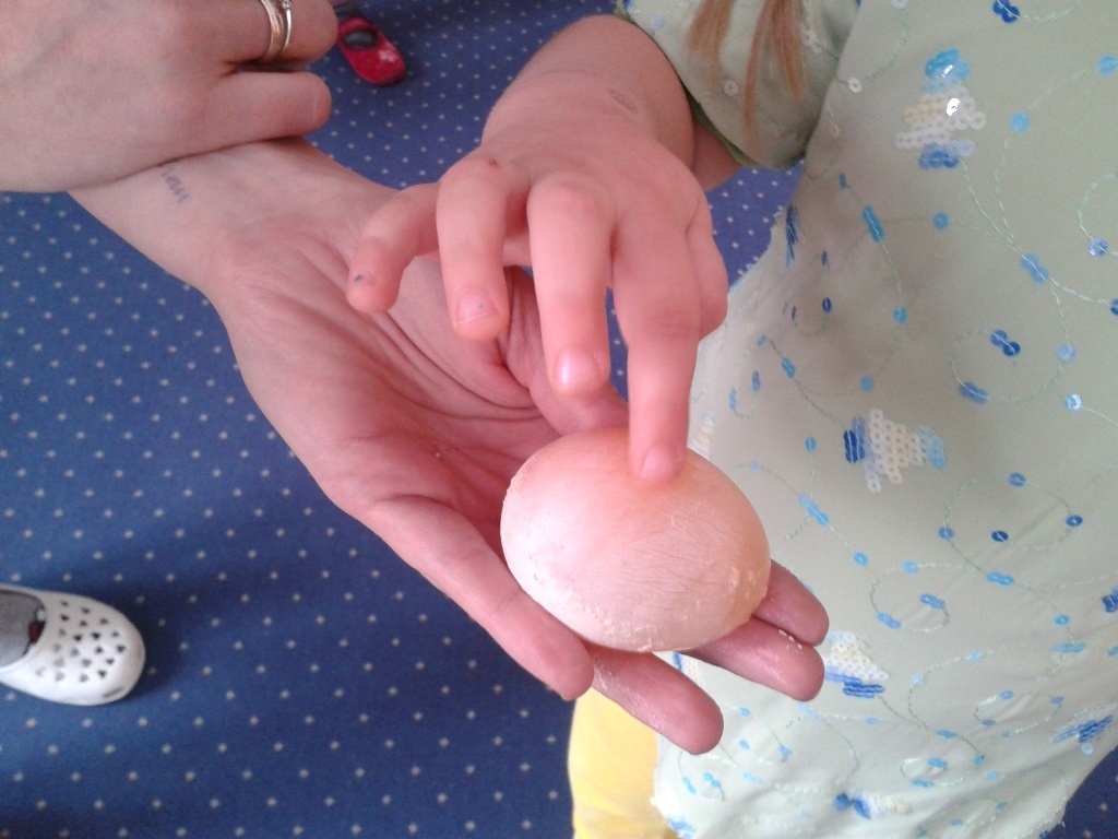 Dowiedzieliśmy się między innymi dlaczego jajko nie tonie w słonej wodzie i w czym to ciekawe zjawisko możemy jeszcze wykorzystać. Na wynik drugiego doświadczenia musieliśmy cierpliwie poczekać do następnego dnia. W pierwszej kolejności umieściliśmy jajko w naczyniu wypełnionym octem i odstawiliśmy je na całą noc w ustronne miejsce. Na drugi dzień, po wyjęciu jajka z naczynia mogliśmy zobaczyć, że skorupka zrobiła się miękka i bardzo delikatna a nawet straciła swój kolor. Następnie prześwietliliśmy jajko latarka by móc zajrzeć jak wygląda ono od środka. Teraz wiemy jak wygląda surowe żółtko i białko bez rozbijania jajka.