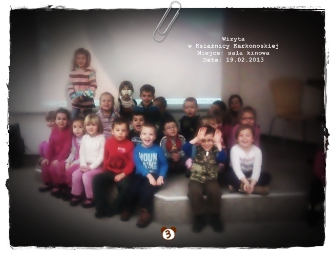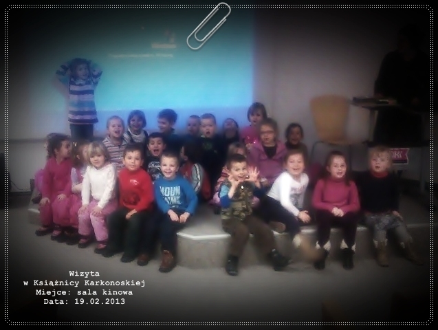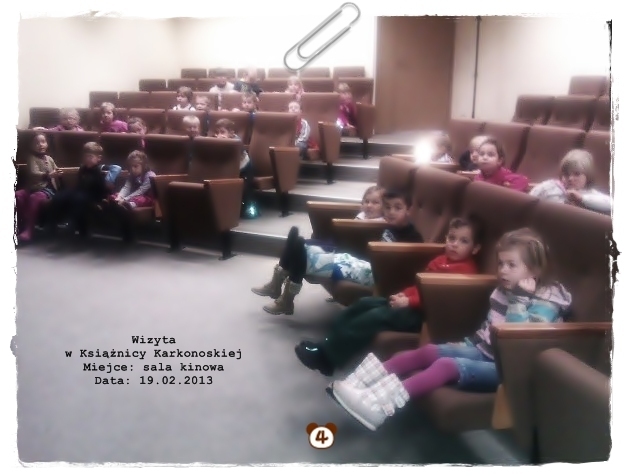 Panie bibliotekarki tym razem zaprosiły nas w miejsce inne niż wszystkie. Była to mała sala kinowa. Na samym wstępie odbyła się krótka pogadanka na temat zasad obowiązujących w „bibliotecznym kinie”. A kiedy już wszyscy wygodnie zasiedliśmy w fotelach, światło zgasło i rozległy się pierwsze dźwięki. Na dużym ekranie pojawił się „kosmiczny” obraz. Jako pierwszą obejrzeliśmy bajkę z cyklu Był sobie kosmos. Wraz z głównymi bohaterami rozpoczęliśmy kosmiczną podróż po wszechświecie. Przenieśliśmy się na planetę Omega, gdzie poznaliśmy jej mieszkańców, którzy zmagając się z obcymi cywilizacjami, starali się utrzymać ład i porządek w kosmosie . Po króciutkiej przerwie grubiutki miś o klapniętym uszku opowiedział nam jeszcze kilka zimowych historyjek z udziałem swoich przyjaciół: Prosiaczka, Króliczka i Zajączków. Na koniec serdecznie podziękowaliśmy paniom z biblioteki i umówiliśmy się na kolejny bajkowy seans. Uśmiechnięci i pełni wrażeń powróciliśmy do naszego przedszkola.
