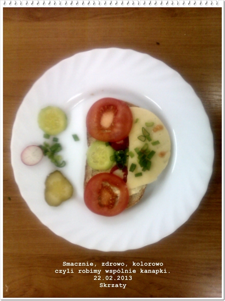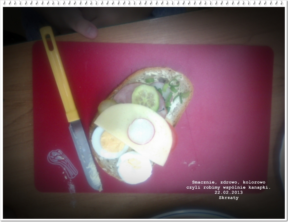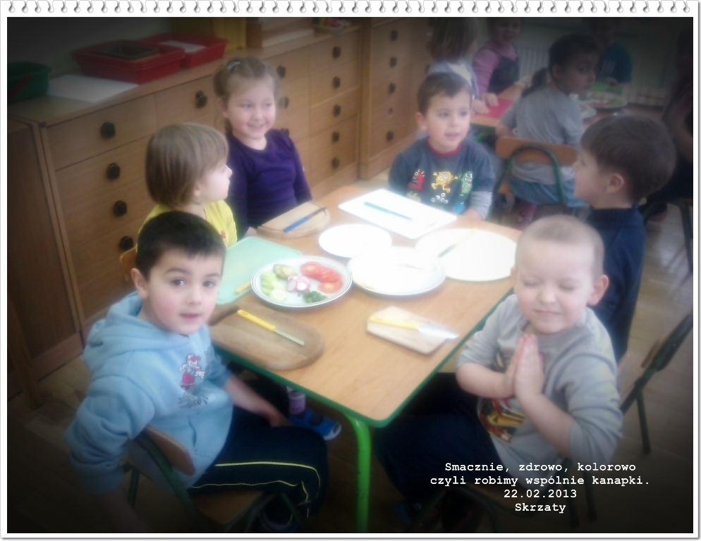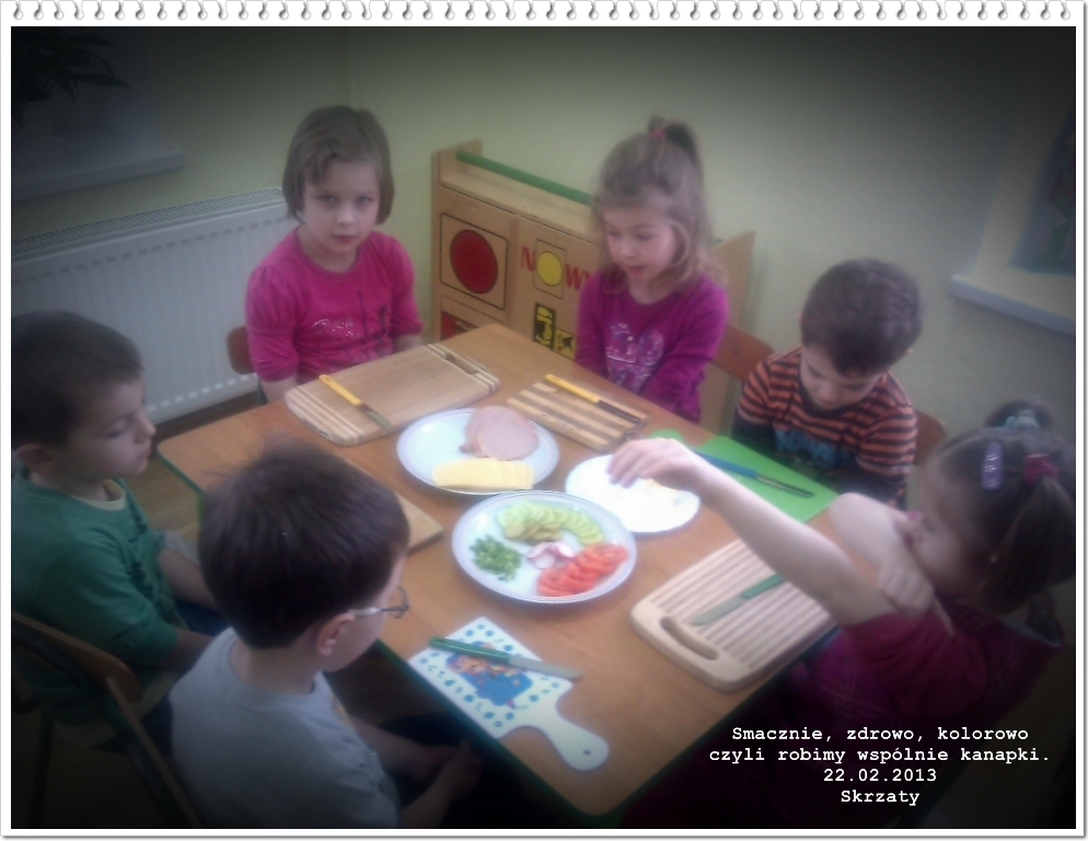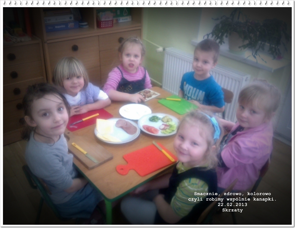 Po interesującej wizycie w kuchni nabraliśmy ochoty na gotowanie. W piątek 22.02.2013 r. pełni zapału, z dużym zaangażowaniem wszyscy razem zabraliśmy się do pracy: każdy miał skomponować sobie kanapkę z wybranych produktów. Najpierw starannie umyliśmy rączki i przygotowaliśmy stanowiska pracy. Następnie przy użyciu noży smarowaliśmy masłem pieczywo, a później układaliśmy na nim wędlinę, ser, jajko i warzywne dodatki takie jak: sałata, ogórek, rzodkiewka, pomidor, szczypiorek. Po ciężkiej lecz przyjemnej pracy z ogromnym apetytem przystąpiliśmy do kosztowania kanapek. Były przepyszne! Być może w przyszłości niektóre Skrzaty zostaną kucharzami i będą przyrządzać wspaniałe dania (tak jak nasze panie z kuchni).