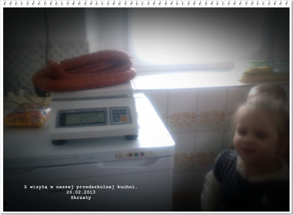Dnia 20.02.2013 roku w ramach zajęć dydaktycznych z cyklu „Poznajemy zawód kucharza” zwiedziliśmy kuchnię w przedszkolu i zapoznaliśmy się z jej wyglądem oraz wyposażeniem. Panie kucharki chętnie wyjaśniły i pokazały nam, na czym polega ich codzienna praca. Mieliśmy możliwość porównać wielkość garnków i niektórych naczyń, w których przygotowywane są posiłki dla wszystkich przedszkolaków. Dużym zainteresowaniem cieszyły się: elektryczna obieraczka do ziemniaków (przypominająca wyglądem kosmiczny pojazd) oraz magazyny, gdzie przechowywane są na półkach, w skrzyniach czy w lodówkach zakupione produkty. Na końcu serdecznie podziękowaliśmy paniom, wręczając wcześniej przygotowaną przez nas „laurkową książeczkę”.