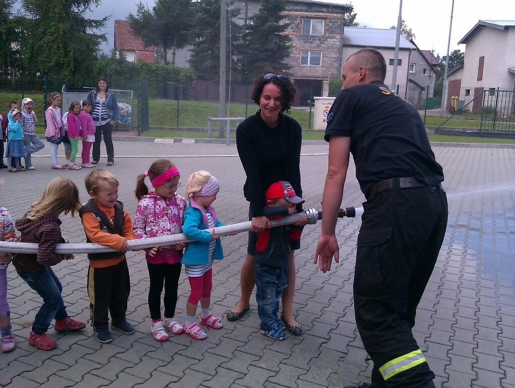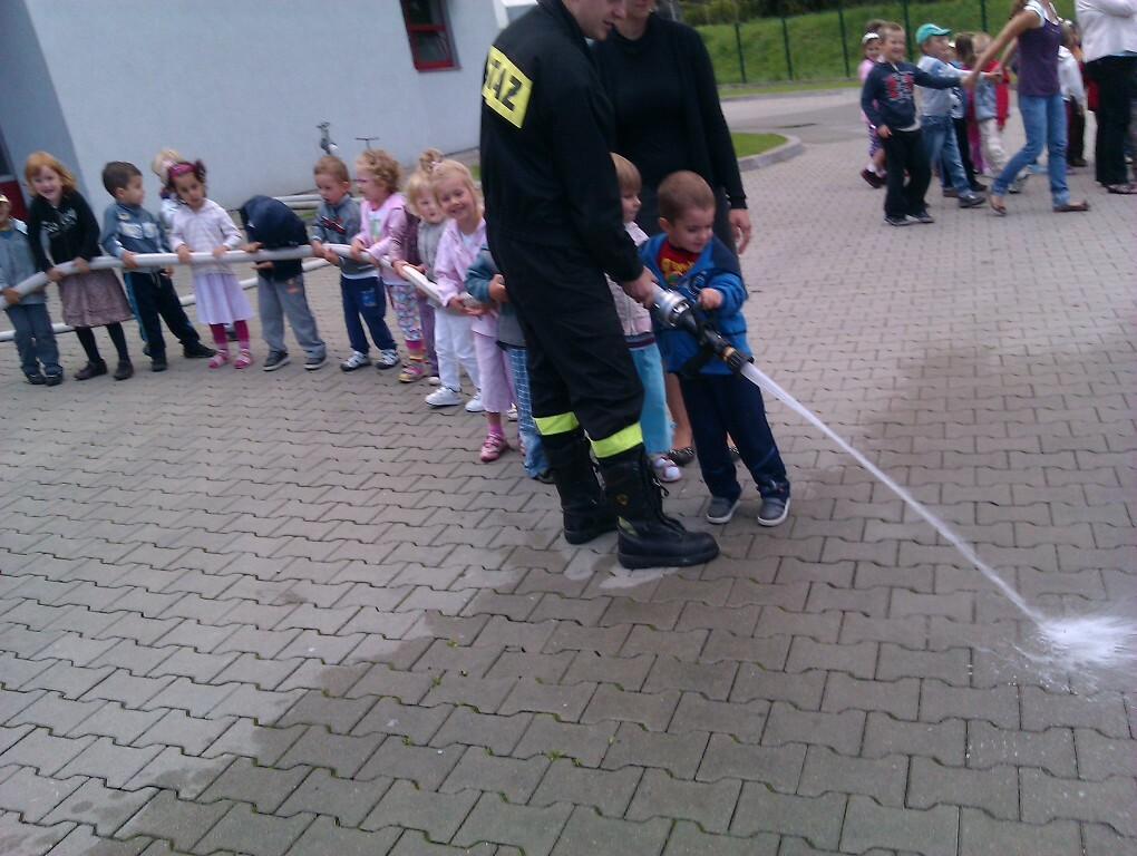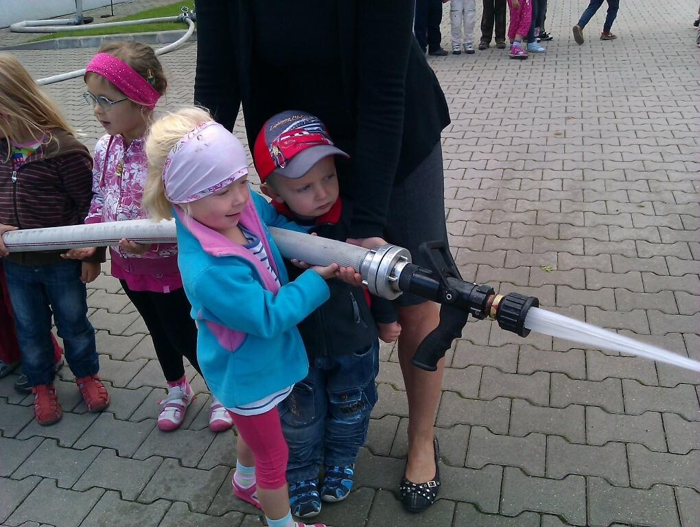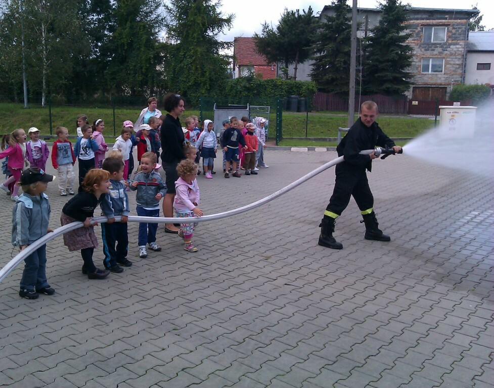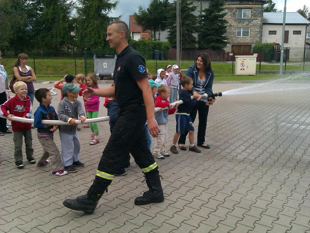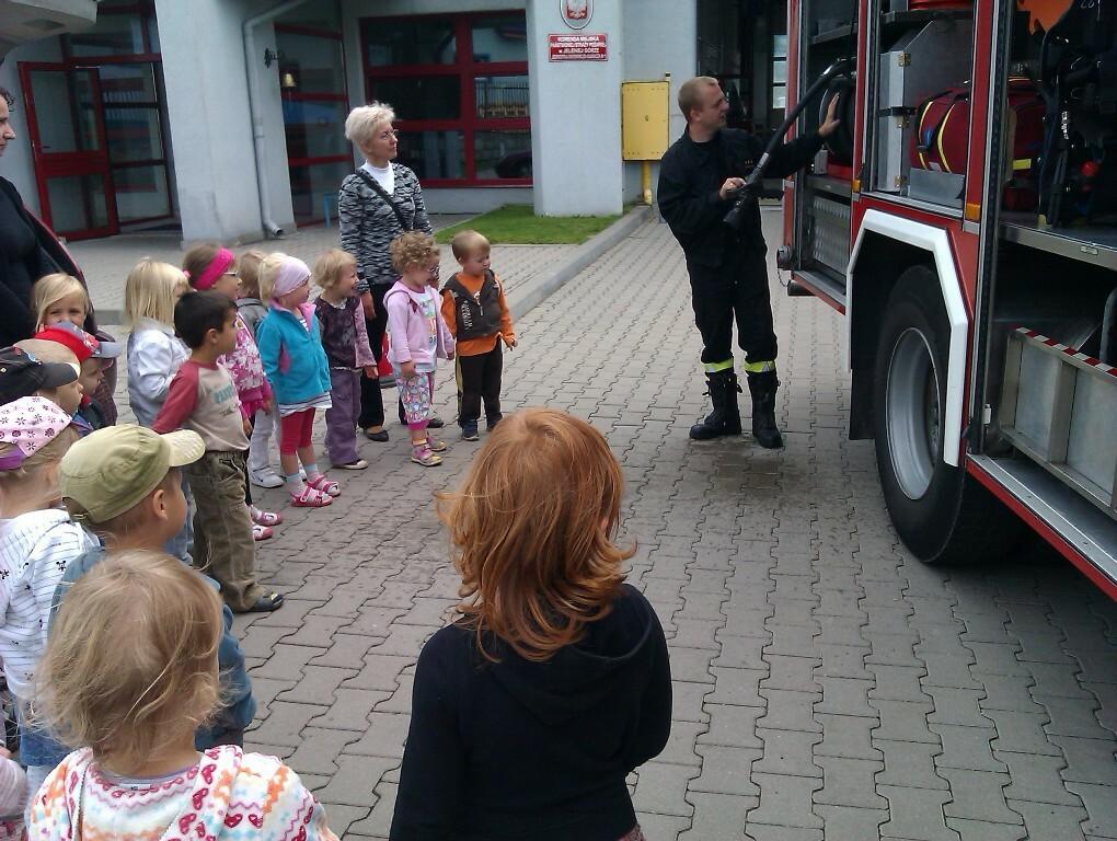 Dzień, w którym miała odbyć się wycieczka do Straży Pożarnej na tzw. Sokolikach od początku nie zapowiadał się dobrze, gdyż pogoda płatała nam figle. Od rana z nieba padała lekka mżawka. Nie byliśmy pewni czy w ogóle się odbędzie, jednakże na nasze szczęście przed samym wyjazdem przestało siąpić. Kiedy przyjechaliśmy na miejsce oczom naszym ukazała się wspaniała, nowo wybudowana remiza strażacka. Wszystkie dzieci, te duże i te małe, przywitał wóz strażacki, specjalnie dla nas wystawiony na zewnątrz. Przedszkolaki trafiły pod skrzydła dwóch najlepszych strażaków, którzy z ogromną cierpliwością i humorem wyjaśniali, na czym polega ta ciężka praca. Zobaczyliśmy wielki beczkowóz wożący zapasy wody do pożaru, łódź nurków również pracujących w straży i ogromne wozy strażackie. Aczkolwiek największą atrakcją dla dzieci stał się zwykły wąż strażacki podłączony do hydrantu na placu przed Remizą. Panowie strażacy pozwolili każdemu potrzymać wąż i pokierować strumieniem wody, który to, co chwilę dziwnym trafem to się zwiększał, to zmniejszał. Zarówno starszaki jak i maluszki były zachwycone naszą wyprawą i w drodze powrotnej w autobusie zdało się słyszeć jedynie głosy przedszkolaków, które w przyszłości koniecznie chciały zostać strażakami.