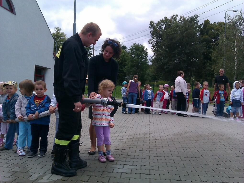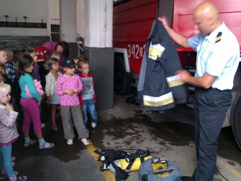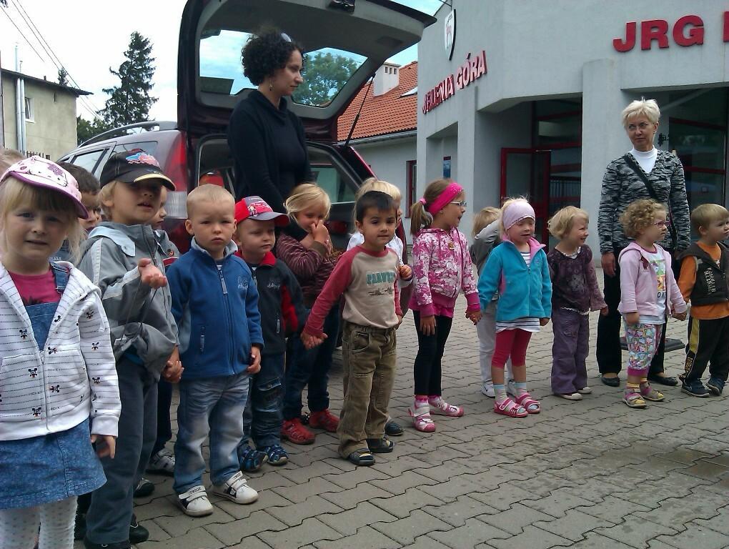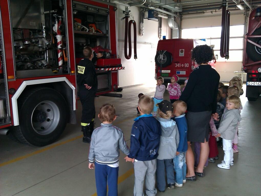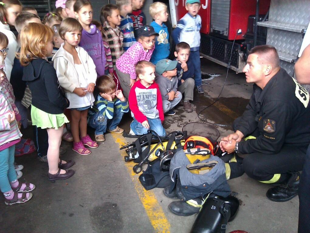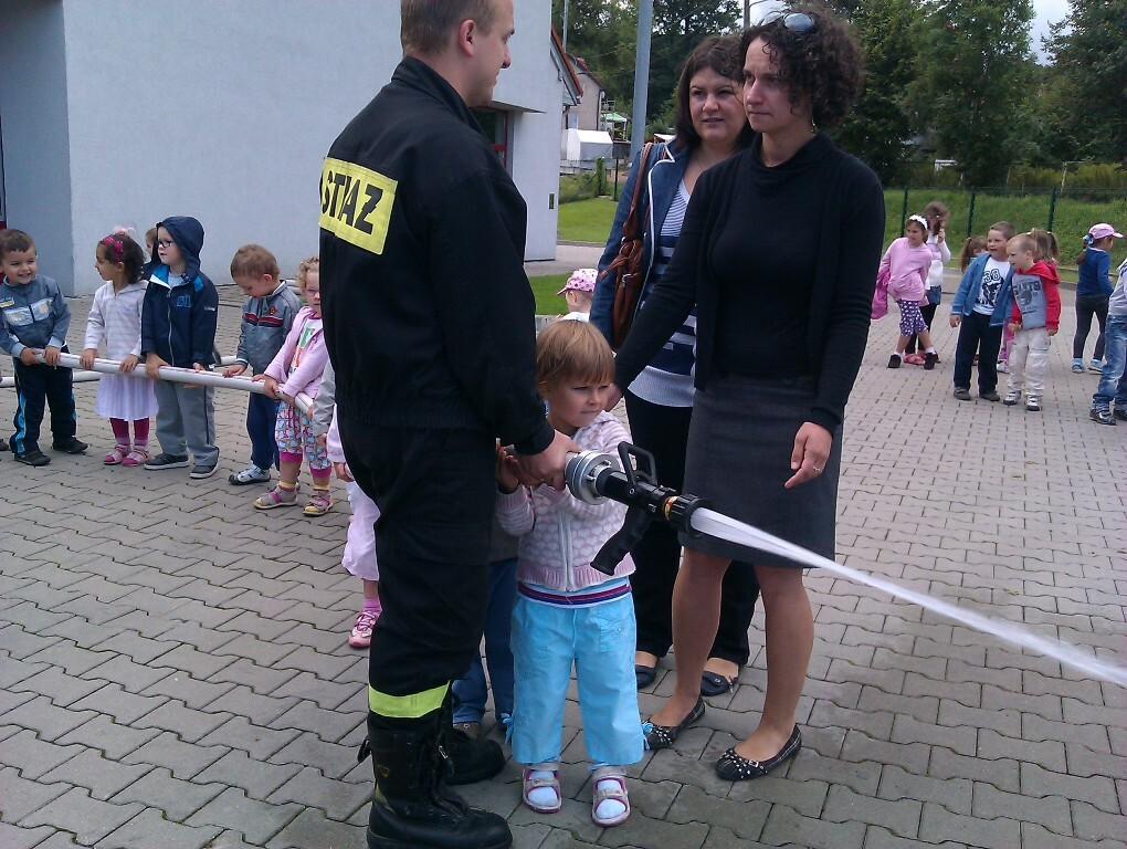 Dzień, w którym miała odbyć się wycieczka do Straży Pożarnej na tzw. Sokolikach od początku nie zapowiadał się dobrze, gdyż pogoda płatała nam figle. Od rana z nieba padała lekka mżawka. Nie byliśmy pewni czy w ogóle się odbędzie, jednakże na nasze szczęście przed samym wyjazdem przestało siąpić. Kiedy przyjechaliśmy na miejsce oczom naszym ukazała się wspaniała, nowo wybudowana remiza strażacka. Wszystkie dzieci, te duże i te małe, przywitał wóz strażacki, specjalnie dla nas wystawiony na zewnątrz. Przedszkolaki trafiły pod skrzydła dwóch najlepszych strażaków, którzy z ogromną cierpliwością i humorem wyjaśniali, na czym polega ta ciężka praca. Zobaczyliśmy wielki beczkowóz wożący zapasy wody do pożaru, łódź nurków również pracujących w straży i ogromne wozy strażackie. Aczkolwiek największą atrakcją dla dzieci stał się zwykły wąż strażacki podłączony do hydrantu na placu przed Remizą. Panowie strażacy pozwolili każdemu potrzymać wąż i pokierować strumieniem wody, który to, co chwilę dziwnym trafem to się zwiększał, to zmniejszał. Zarówno starszaki jak i maluszki były zachwycone naszą wyprawą i w drodze powrotnej w autobusie zdało się słyszeć jedynie głosy przedszkolaków, które w przyszłości koniecznie chciały zostać strażakami.