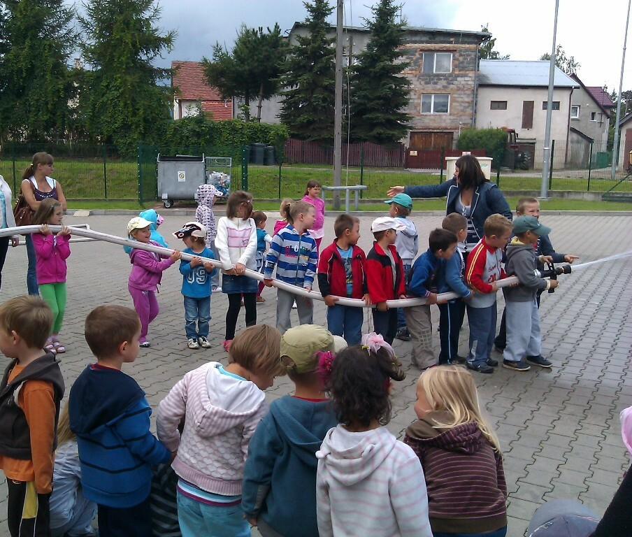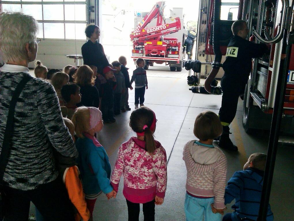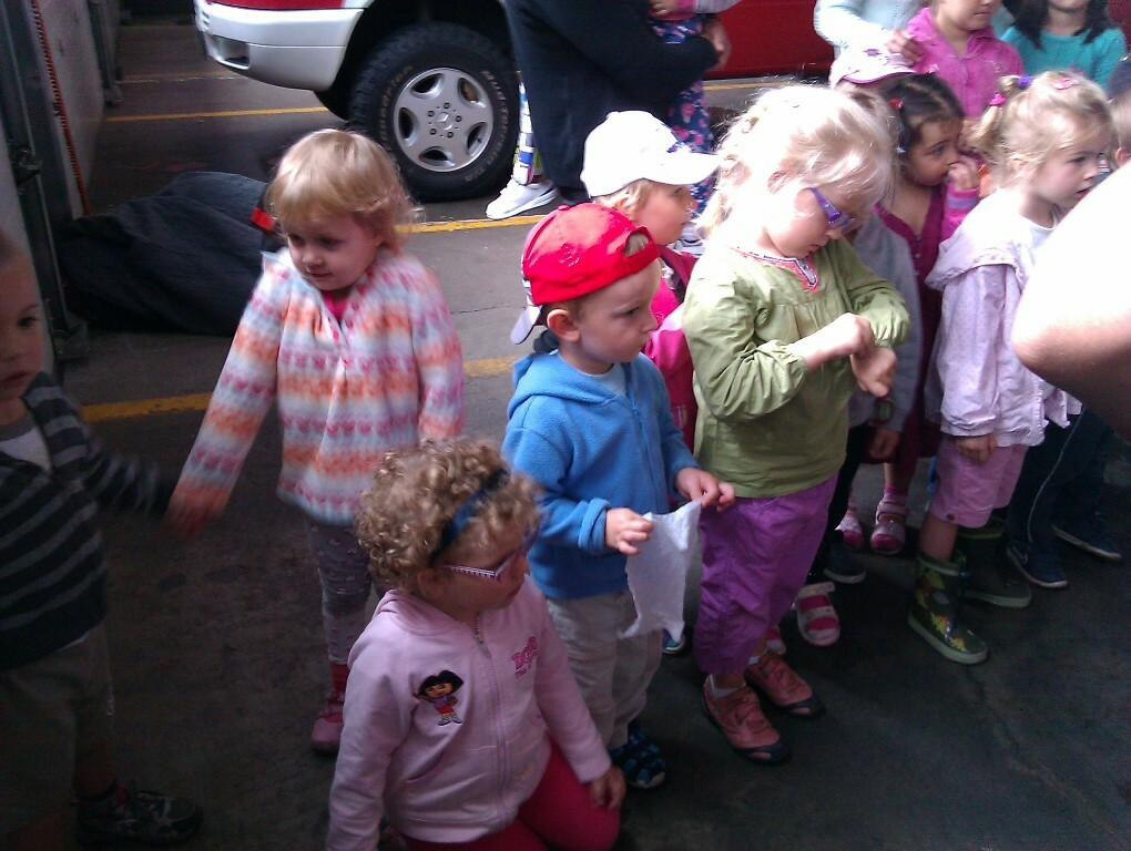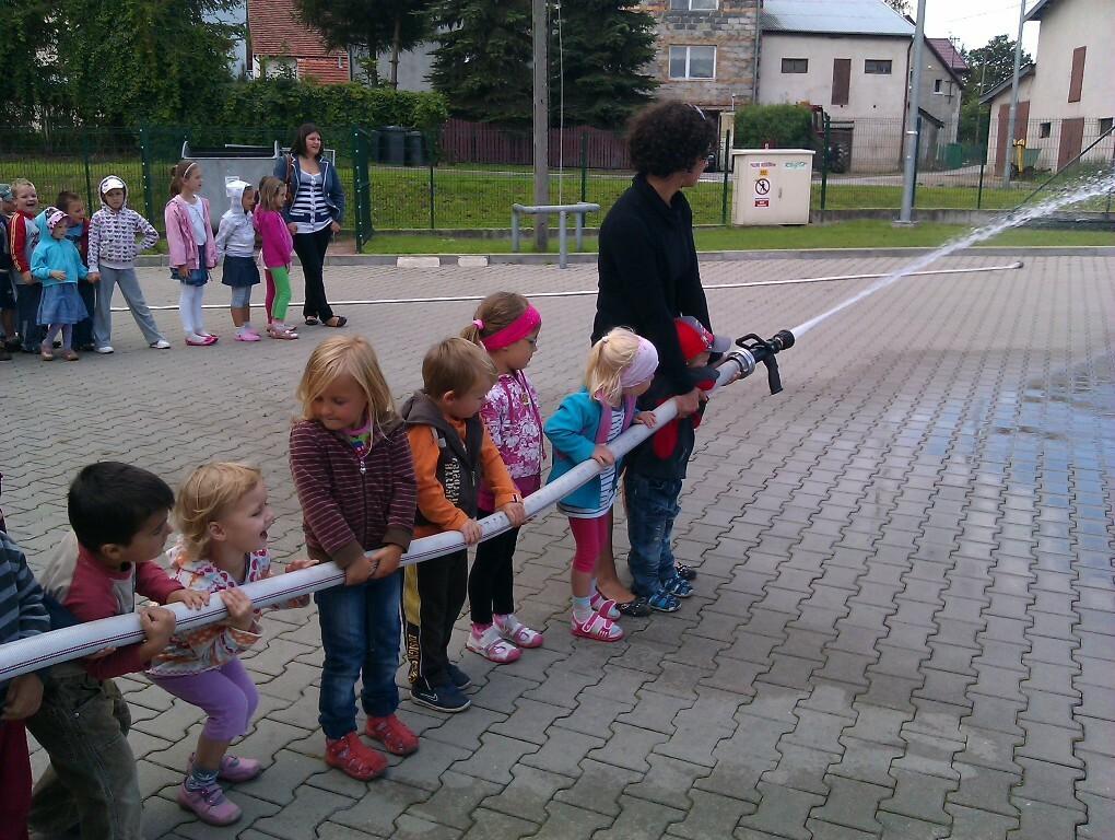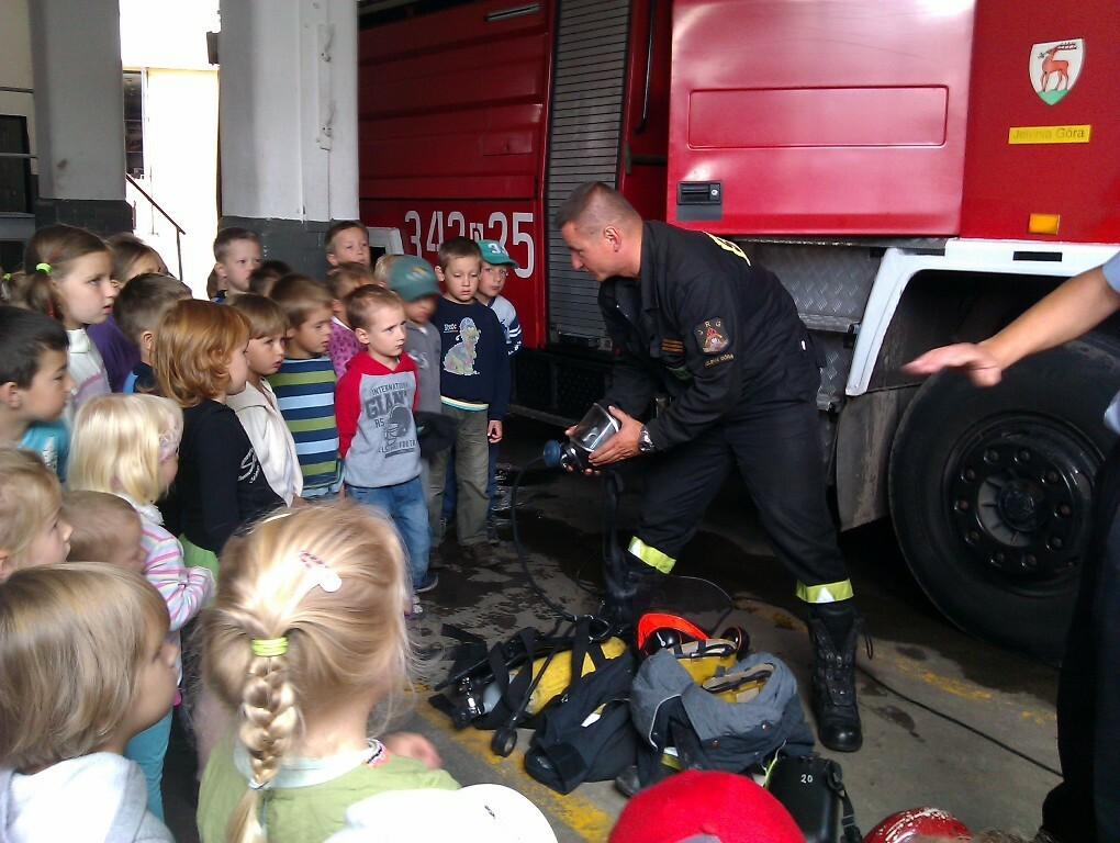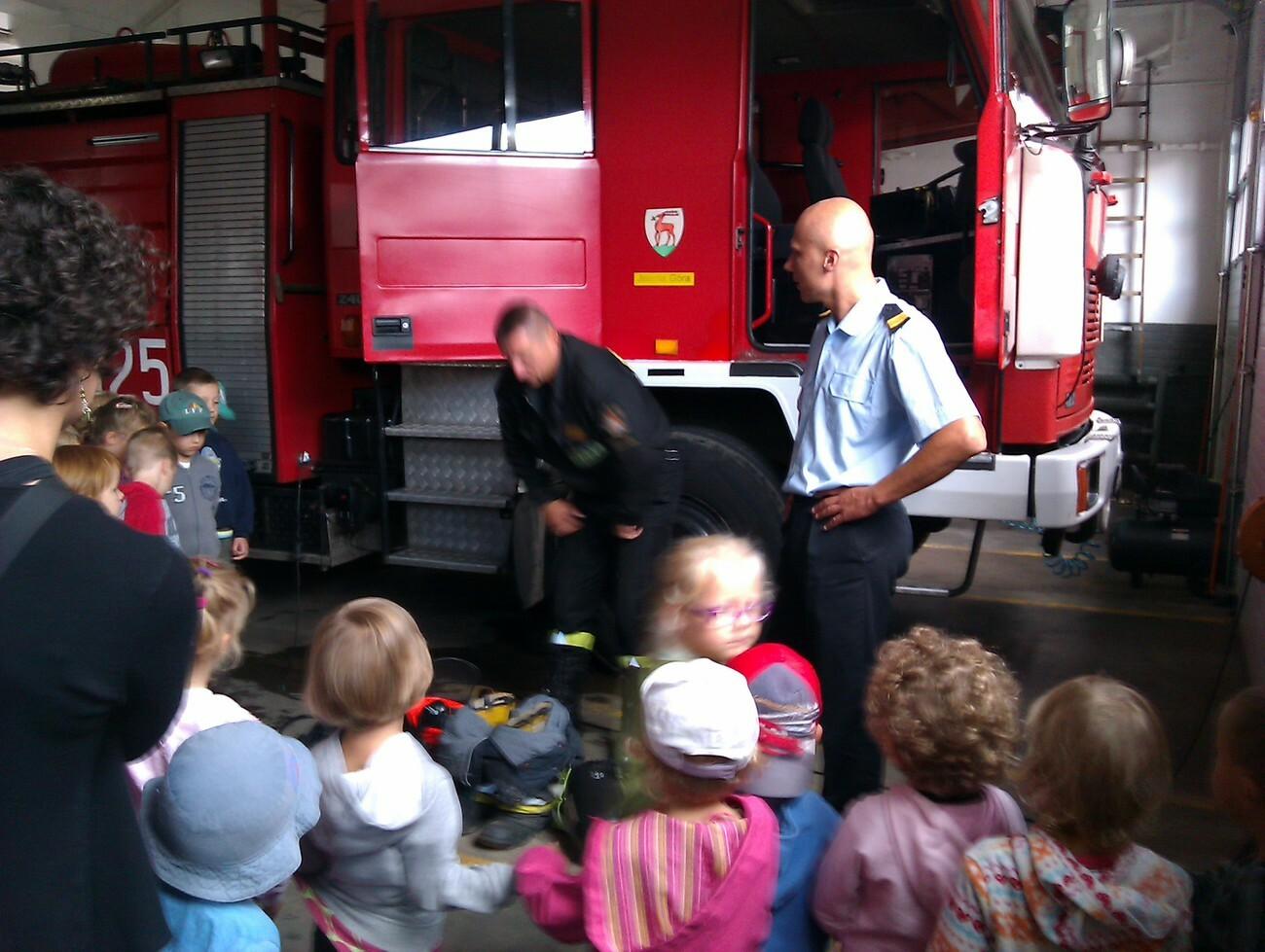 Dzień, w którym miała odbyć się wycieczka do Straży Pożarnej na tzw. Sokolikach od początku nie zapowiadał się dobrze, gdyż pogoda płatała nam figle. Od rana z nieba padała lekka mżawka. Nie byliśmy pewni czy w ogóle się odbędzie, jednakże na nasze szczęście przed samym wyjazdem przestało siąpić. Kiedy przyjechaliśmy na miejsce oczom naszym ukazała się wspaniała, nowo wybudowana remiza strażacka. Wszystkie dzieci, te duże i te małe, przywitał wóz strażacki, specjalnie dla nas wystawiony na zewnątrz. Przedszkolaki trafiły pod skrzydła dwóch najlepszych strażaków, którzy z ogromną cierpliwością i humorem wyjaśniali, na czym polega ta ciężka praca. Zobaczyliśmy wielki beczkowóz wożący zapasy wody do pożaru, łódź nurków również pracujących w straży i ogromne wozy strażackie. Aczkolwiek największą atrakcją dla dzieci stał się zwykły wąż strażacki podłączony do hydrantu na placu przed Remizą. Panowie strażacy pozwolili każdemu potrzymać wąż i pokierować strumieniem wody, który to, co chwilę dziwnym trafem to się zwiększał, to zmniejszał. Zarówno starszaki jak i maluszki były zachwycone naszą wyprawą i w drodze powrotnej w autobusie zdało się słyszeć jedynie głosy przedszkolaków, które w przyszłości koniecznie chciały zostać strażakami.