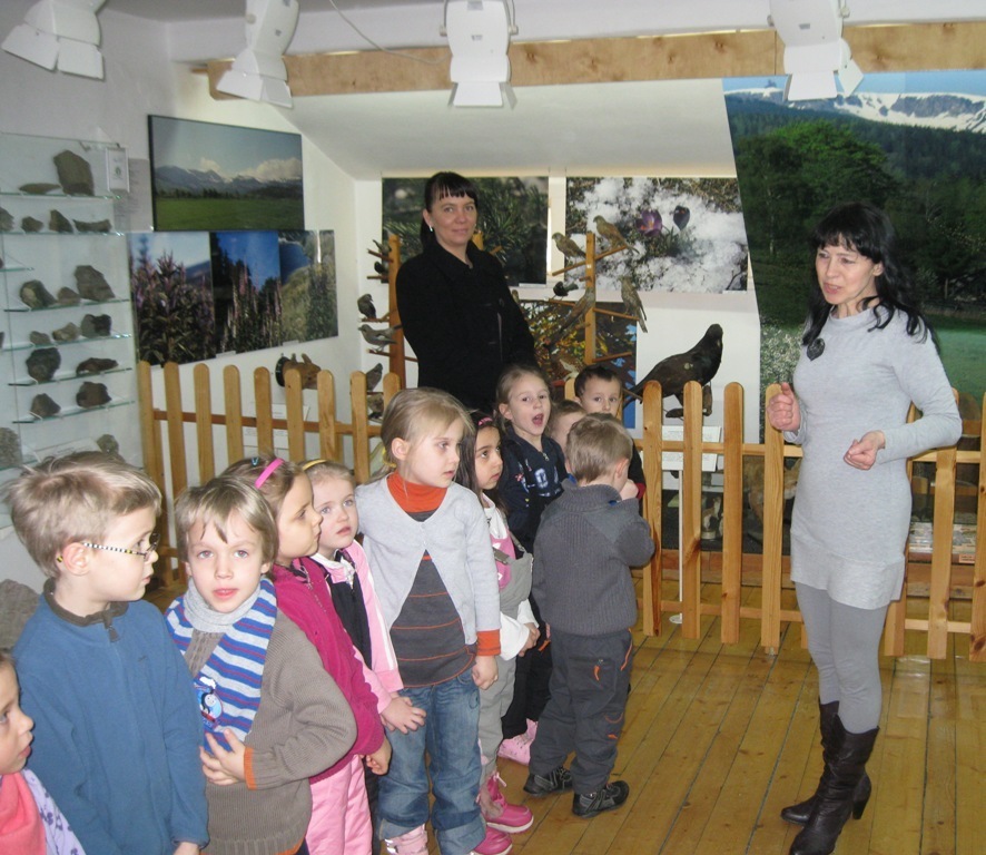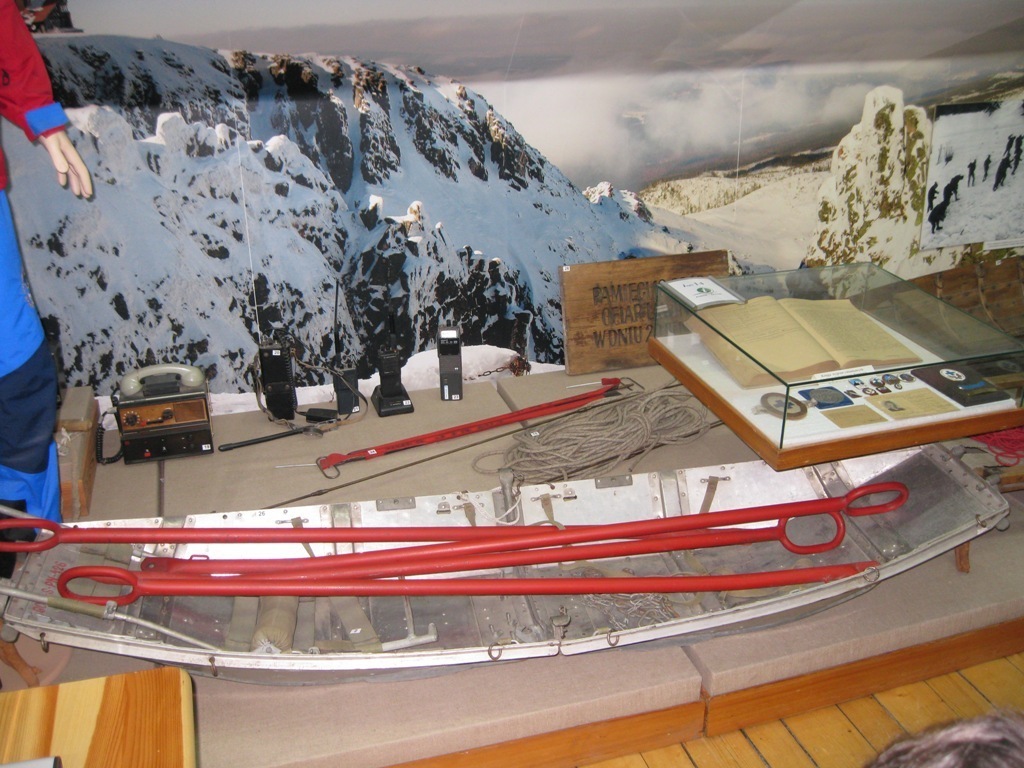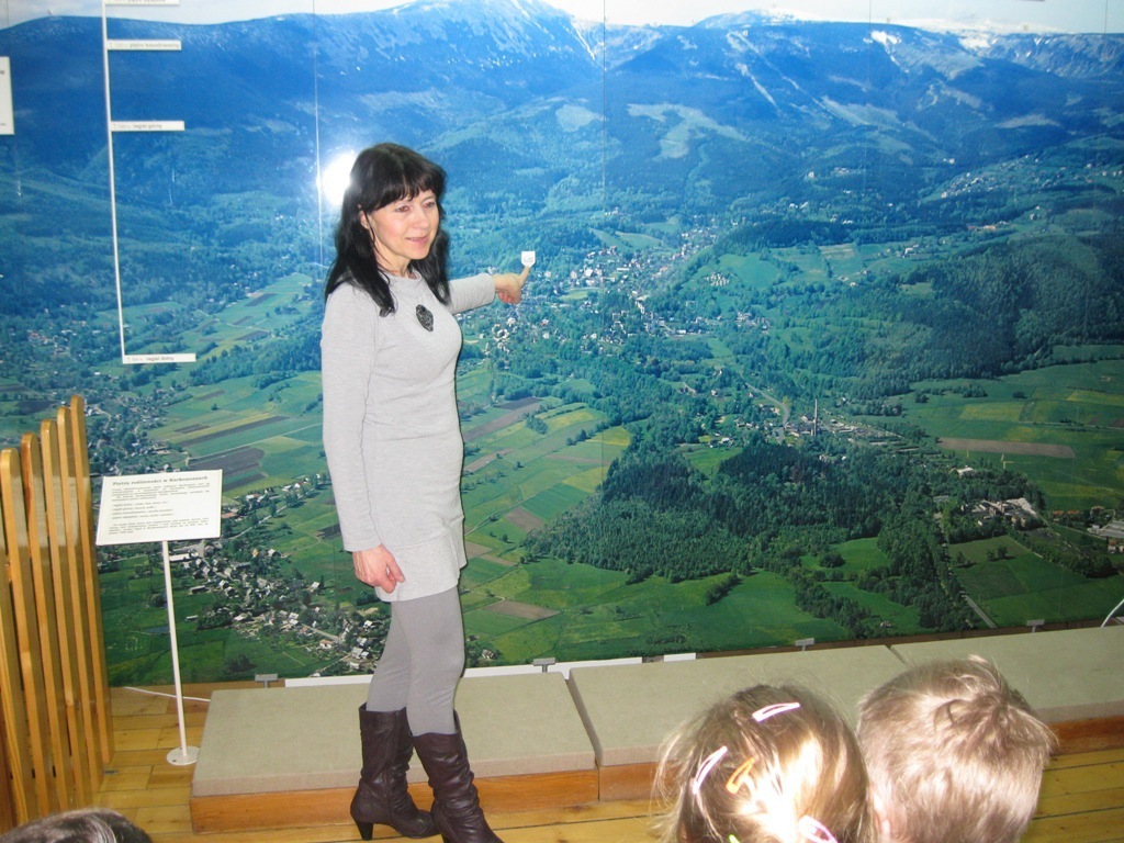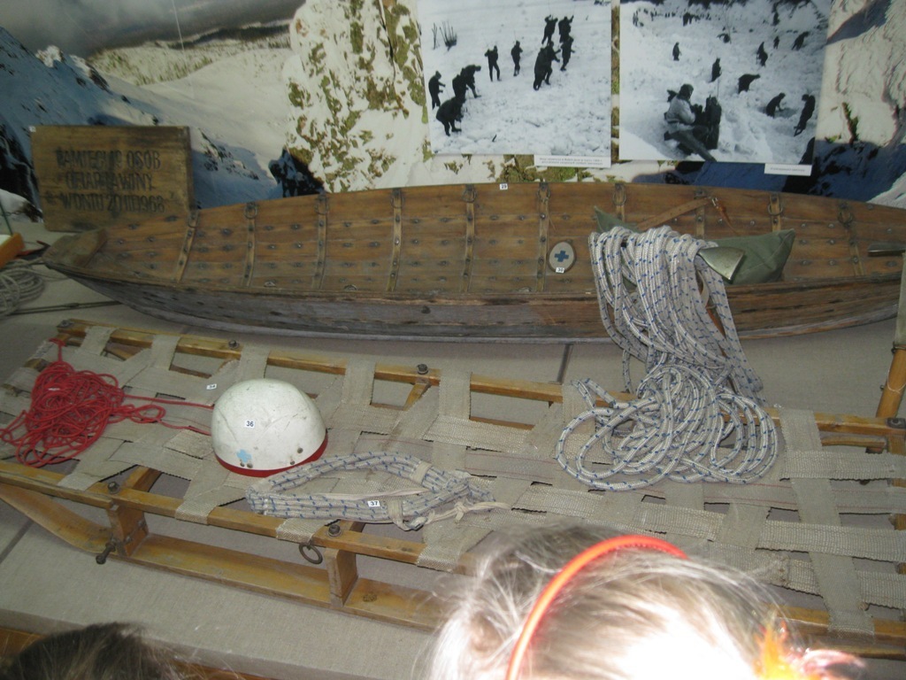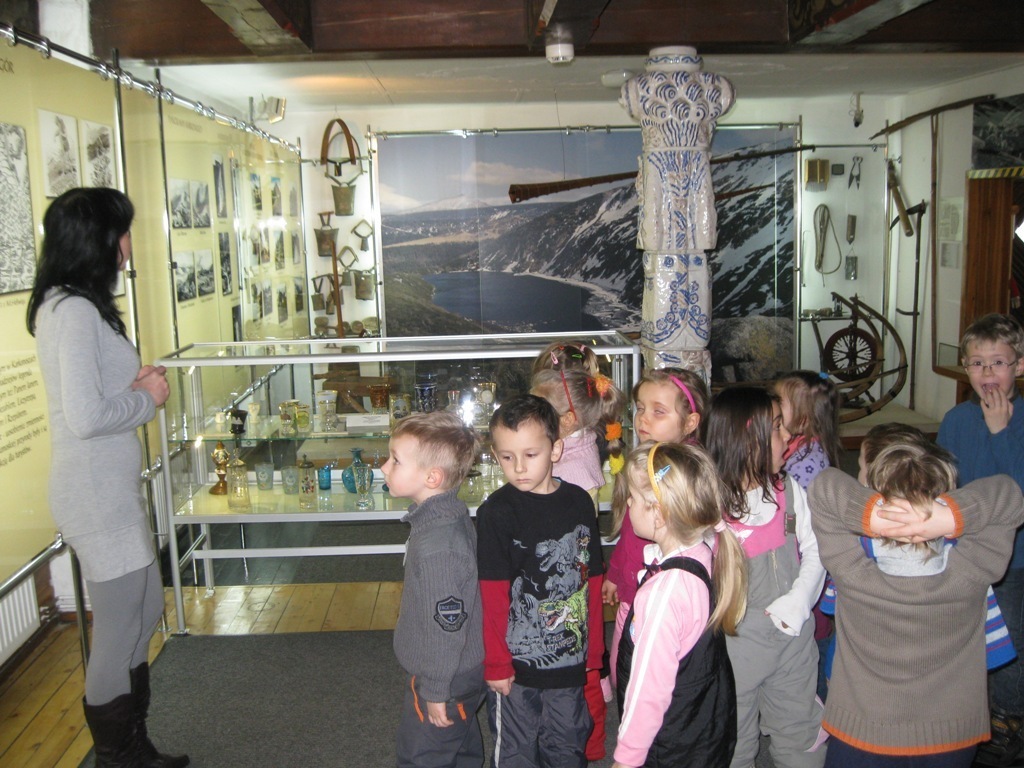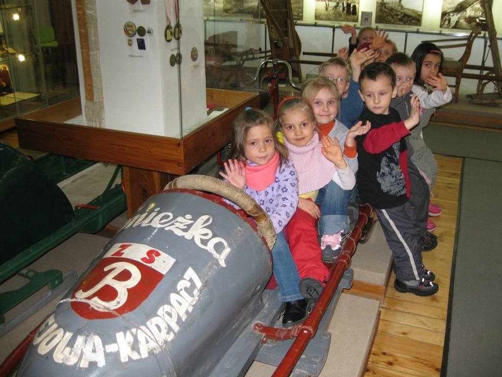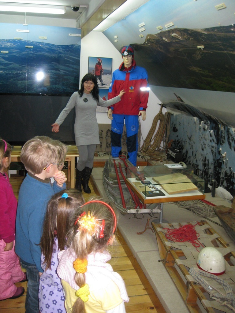 Kolejnym punktem wyprawy było Muzeum Sportu, gdzie oprócz wystawy sprzętów sportowych można było zobaczyć zwierzęta występujące w naszym rejonie. Ciekawym punktem wystawy było również zgromadzone wyposażenie ratowników górskich (od starych lin, po urządzenia służące do komunikacji). Na zakończenie pani przewodnik zaprosiła dzieci do wspólnego opowiadania legendy o Duchu Gór i śpiewania. Pełni wrażeń wróciliśmy do przedszkola.