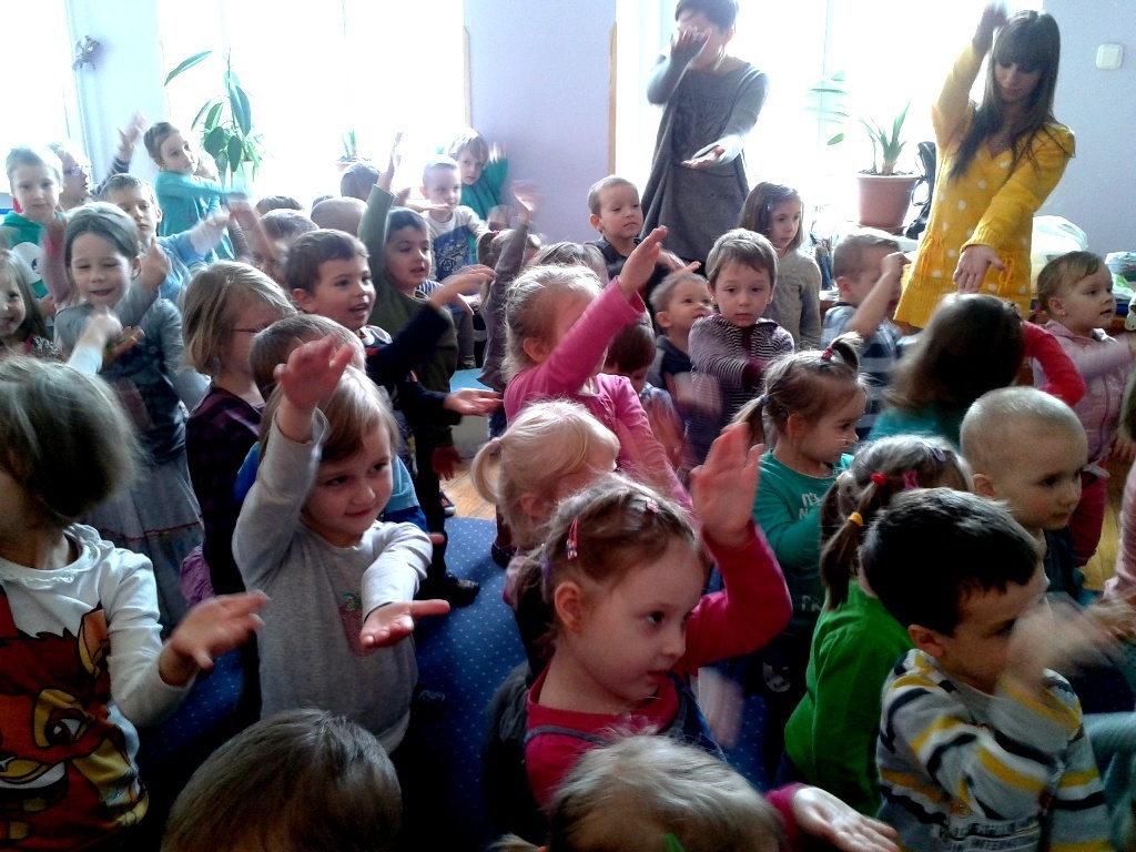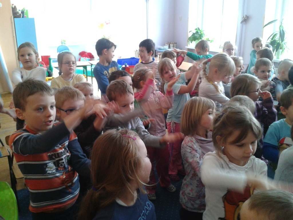 I tak na waltorni można wygrywać dźwięki naśladujące podmuchy wiatru, skrzypce brzmiały jak liście spadające z drzew, a dźwięki pianina naśladowały burzę. Zabrakło nam tylko odgłosów padającego deszczu. W to zostały zaangażowane wszystkie dzieci. Zgodnie z podanym rytmem przez prowadzącą, dzieci wystukiwały rytm uderzając rękoma o swoje nogi.