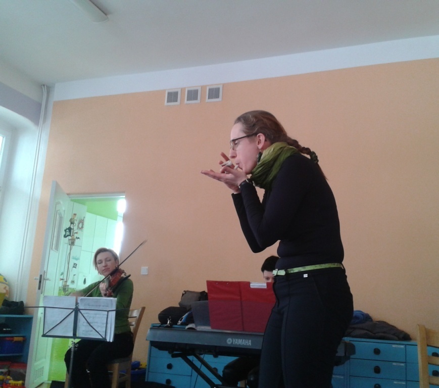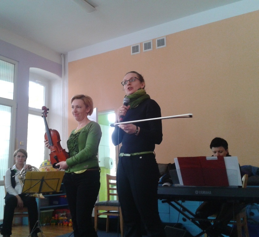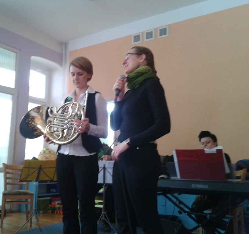 W wesoły i słoneczny nastrój wprowadziły nas: p. Róża grająca na pianinie, p. Agata grająca na skrzypcach oraz p. Gosia grająca na waltorni.