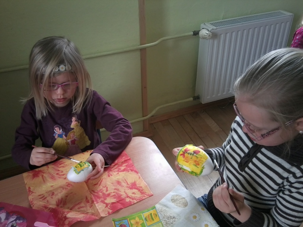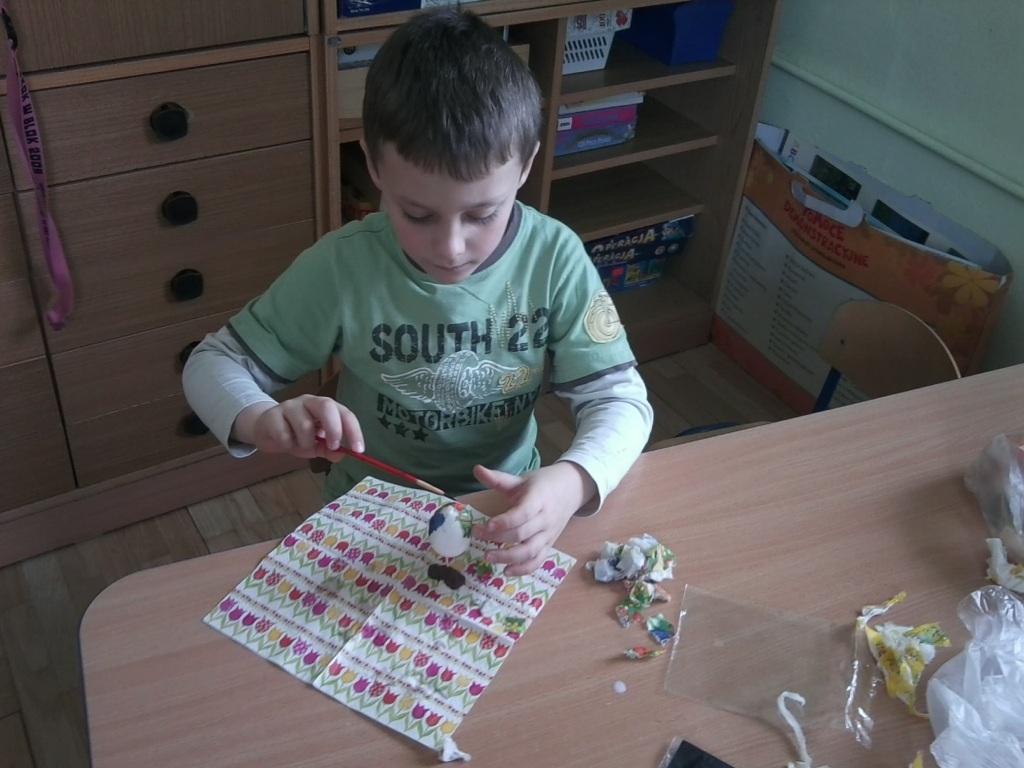 Podobno ta technika pracy pochodzi aż z Syberii i to bardzo ciekawe że teraz my mogliśmy nią pracować. Nasze zadanie polegało na ozdobieniu jaj ze styropianu i nadanie im świątecznego wyglądu kolorowych pisanek. Praca nie była łatwa, ale każdy z nas bardzo się starał przez co wykonaliśmy wspaniałe, kolorowe jajeczka. Jesteśmy przekonani, że nasze prace ozdobiły niejeden świąteczny stół.