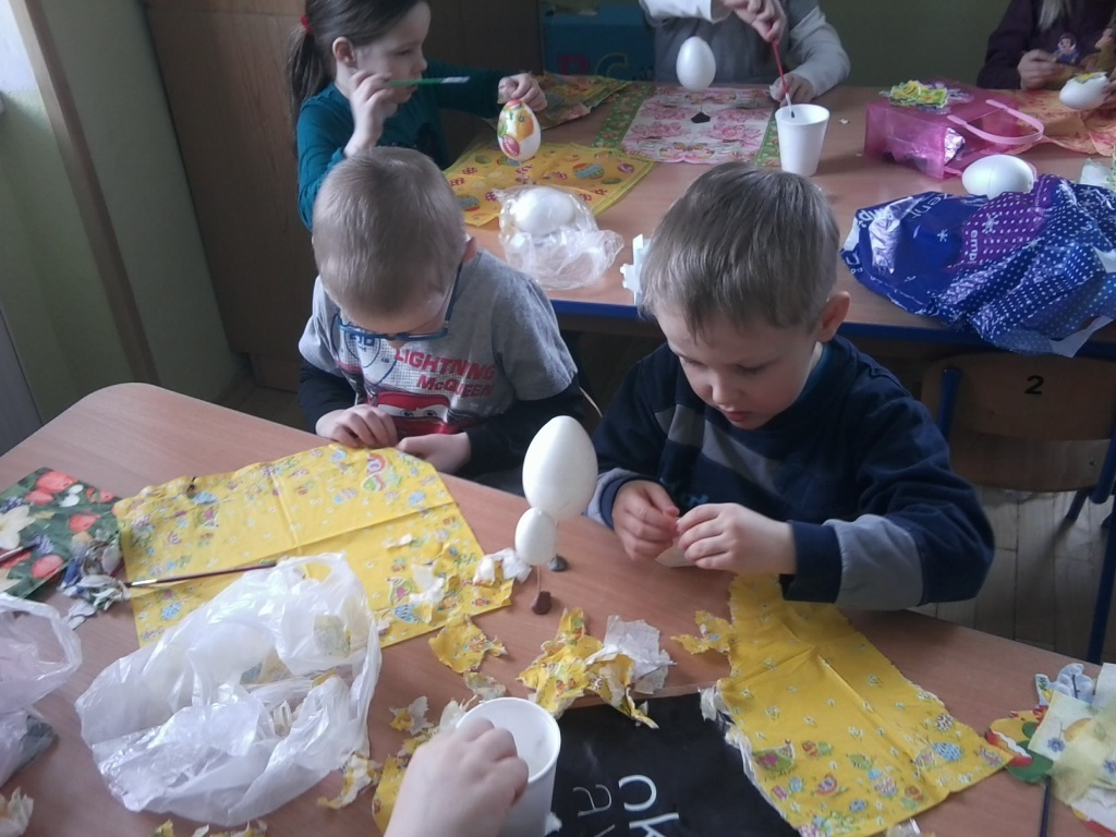 Tuż przed samymi świętami najstarsza grupa przedszkolaków - Chochliki postanowiła zrobić dla swoich bliskich drobny upominek z okazji nadchodzących Świąt Wielkanocnych.